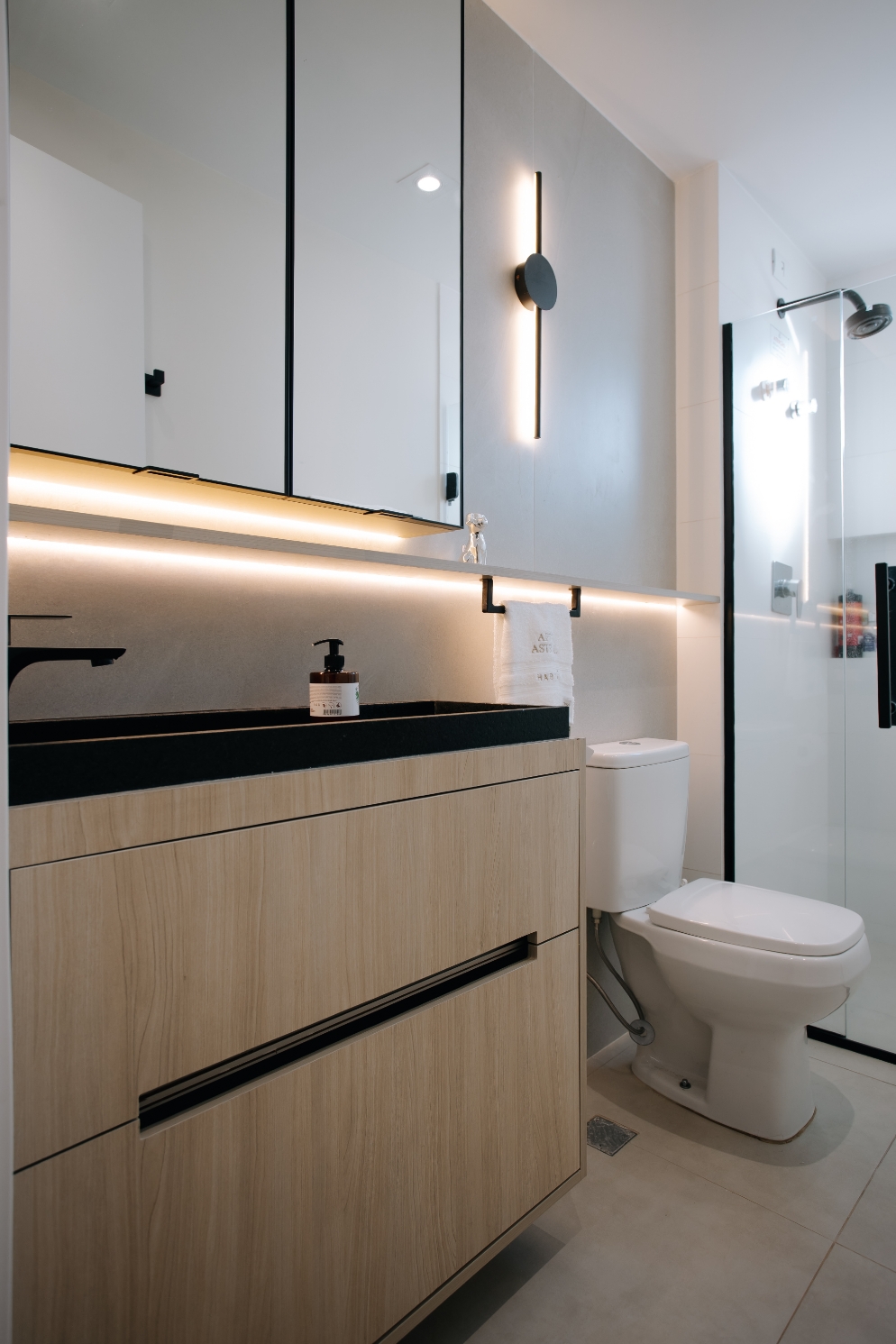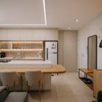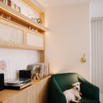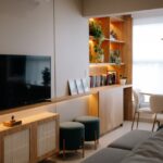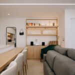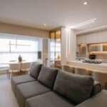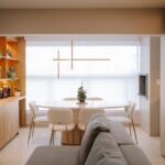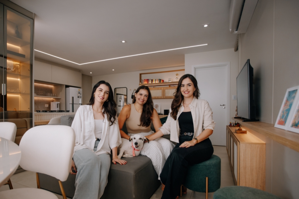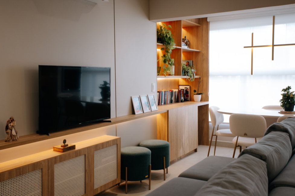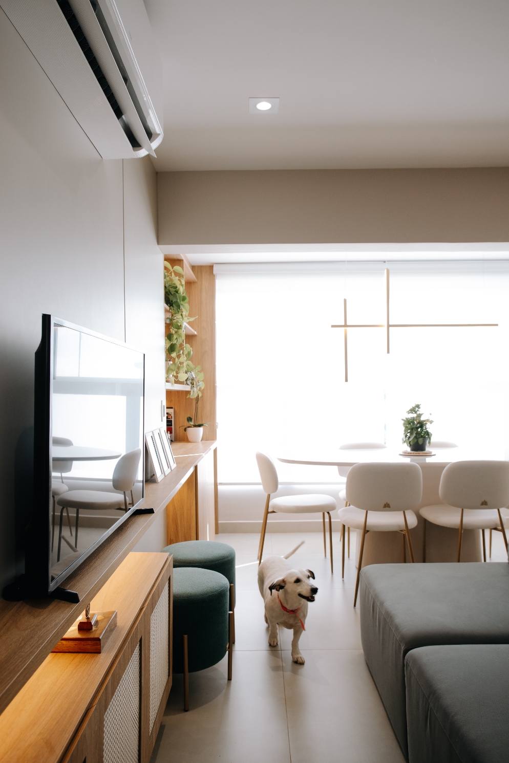 O Apartamento Astral foi concebido para um jovem casal e sua cachorrinha, Francisca, com o propósito de criar um lar descontraído, leve e com a personalidade deles. A proposta valoriza tons claros combinados à madeira e à palha, resultando em uma atmosfera acolhedora.