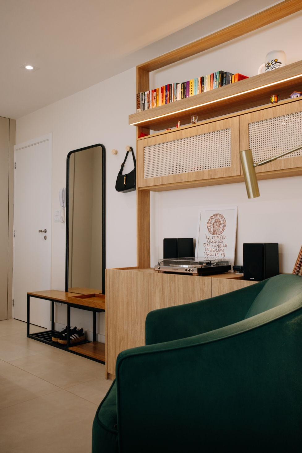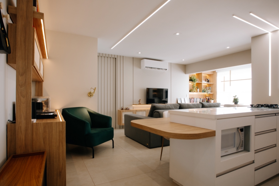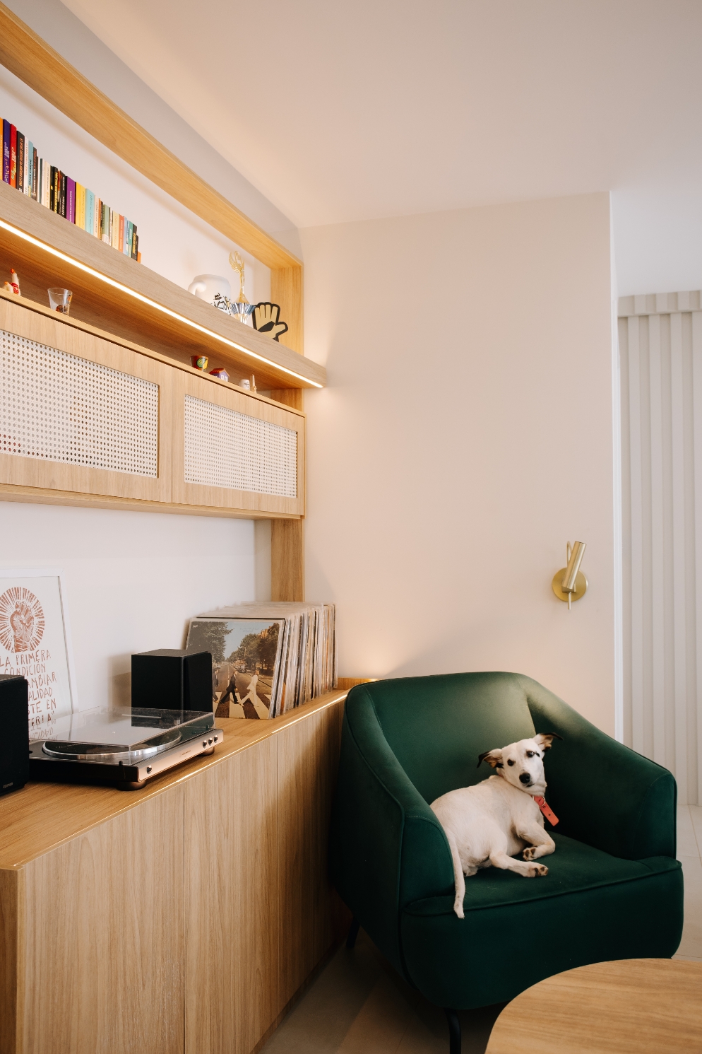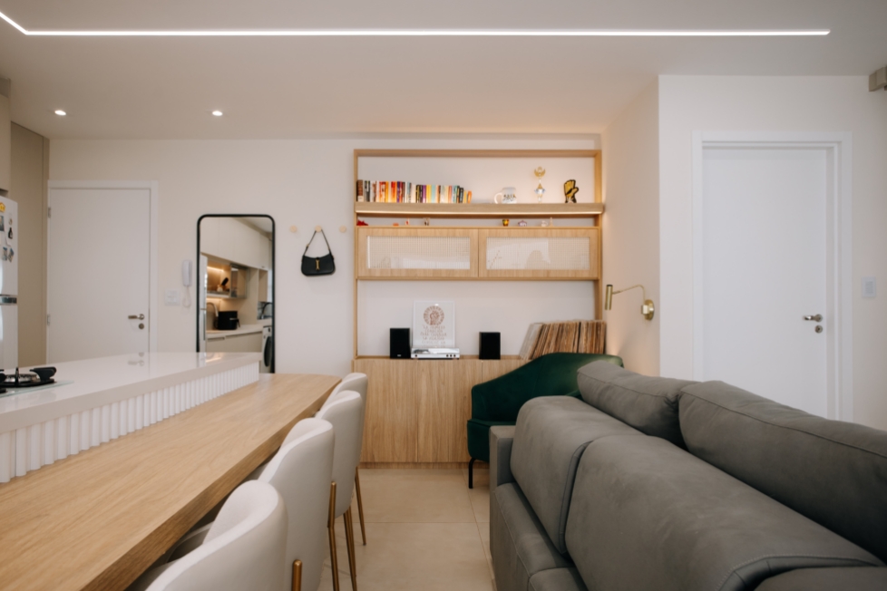 A integração dos ambientes foi pensada a partir da dinâmica da família, favorecendo a convivência e reforçando a sensação de um lar convidativo. Apaixonado por música, o casal conta com um espaço dedicado à coleção de vinis, acompanhado por uma poltrona estrategicamente posicionada para apreciar momentos de relaxamento com muito conforto.