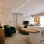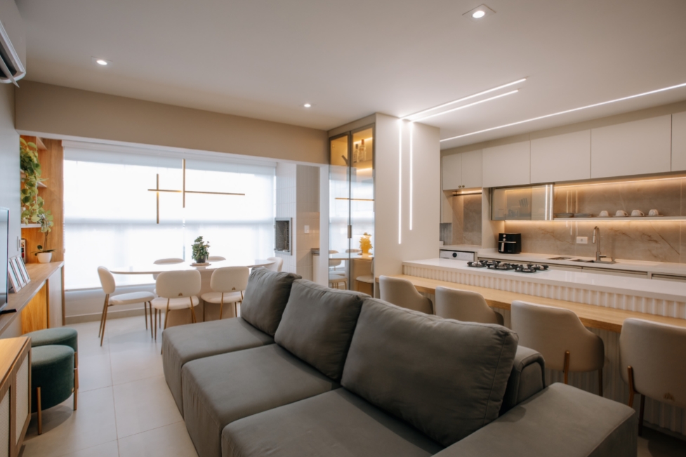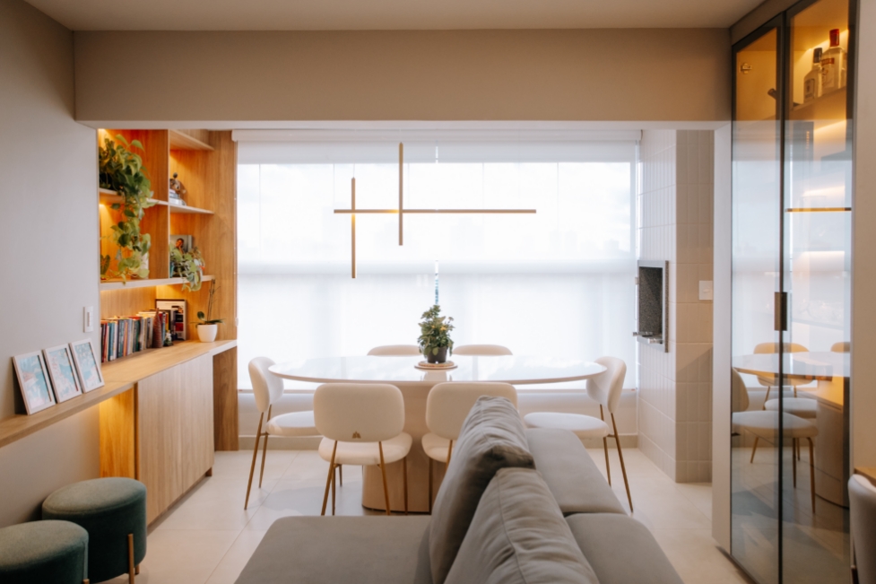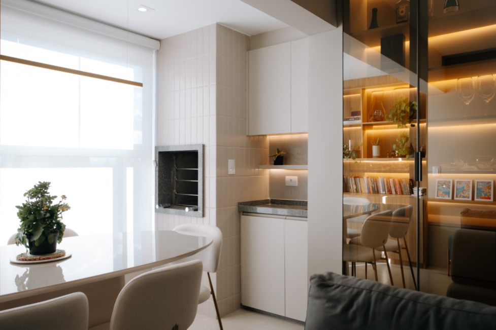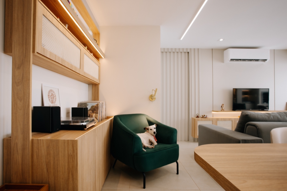 A integração dos ambientes foi pensada a partir da dinâmica da família, favorecendo a convivência e reforçando a sensação de um lar convidativo. Apaixonado por música, o casal conta com um espaço dedicado à coleção de vinis, acompanhado por uma poltrona estrategicamente posicionada para apreciar momentos de relaxamento com muito conforto.