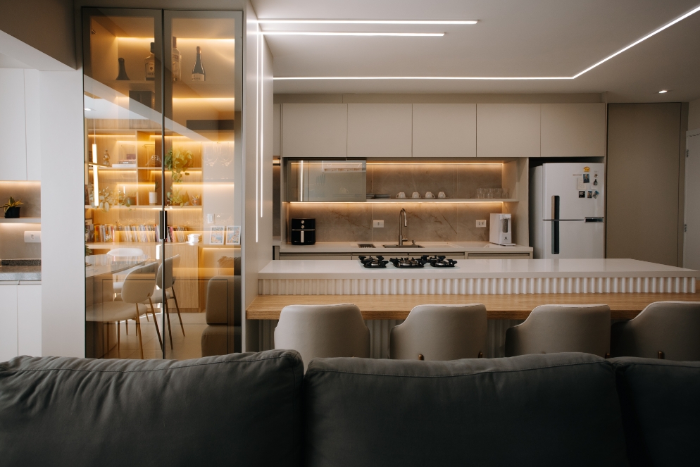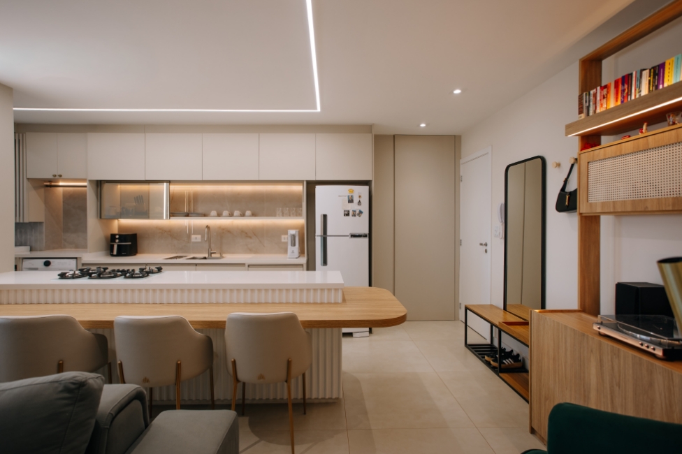 Detalhes de linhas orgânicas, como na ilha da cozinha, complementam o projeto e conferem singularidade aos ambientes, tornando o apartamento ainda mais autêntico e especial.
