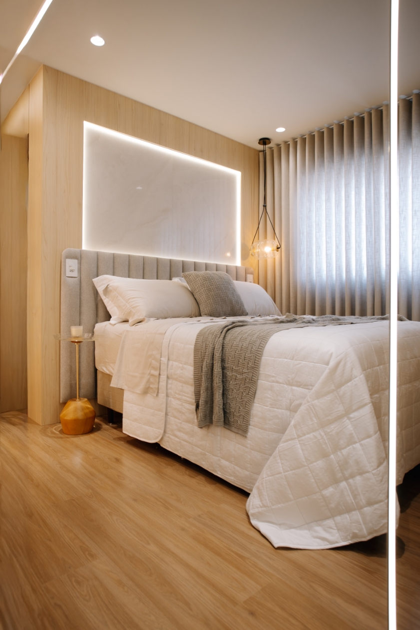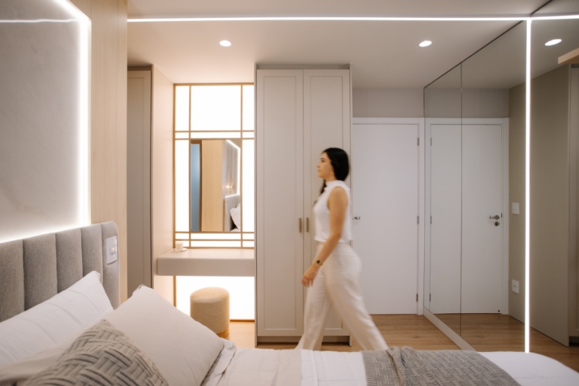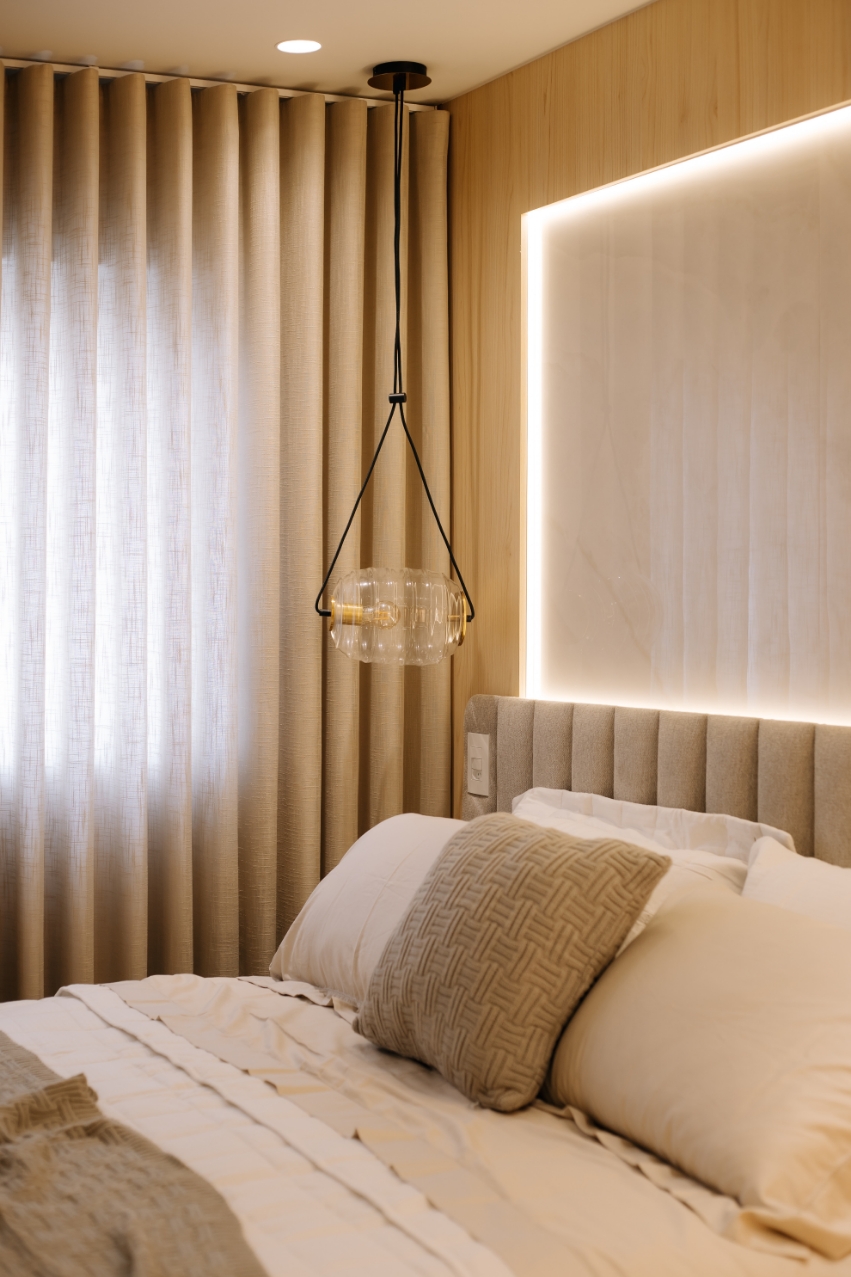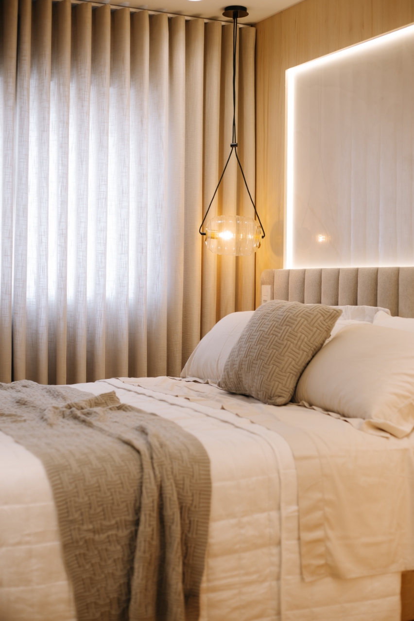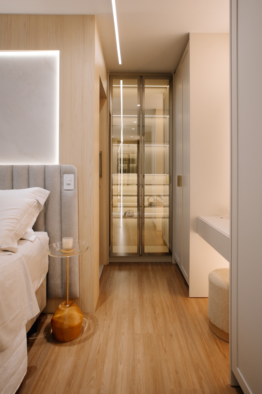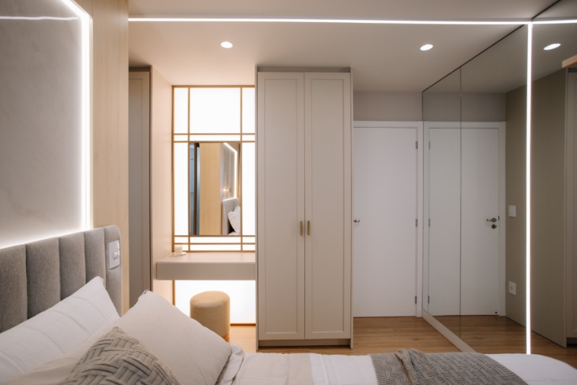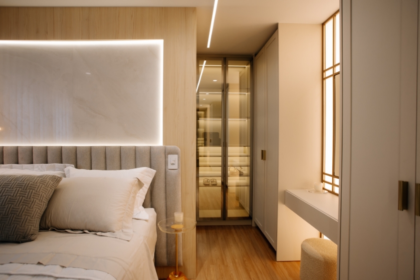 Nos dormitórios, a paleta segue tons neutros e acolhedores para os filhos, enquanto a suíte do casal recebe nuances ainda mais suaves, reforçando a sensação de sofisticação e conforto. O camarim se destaca pela aplicação da tela tensionada, que proporciona iluminação frontal eficiente e transforma o ambiente com elegância.