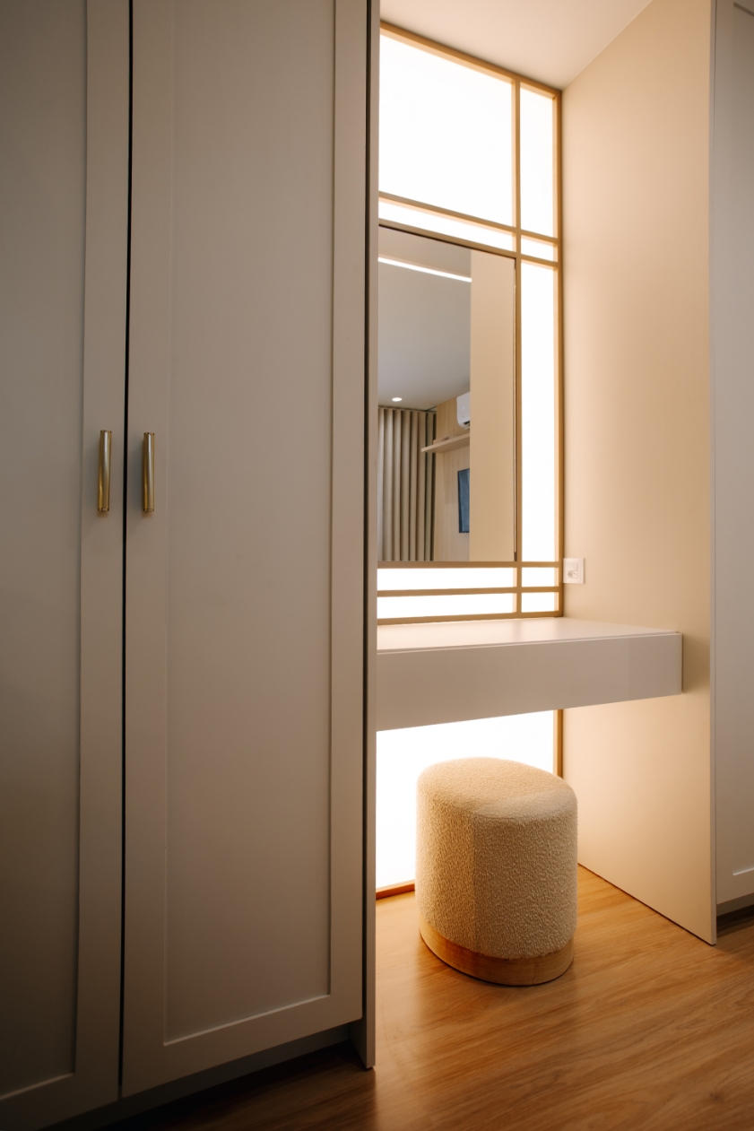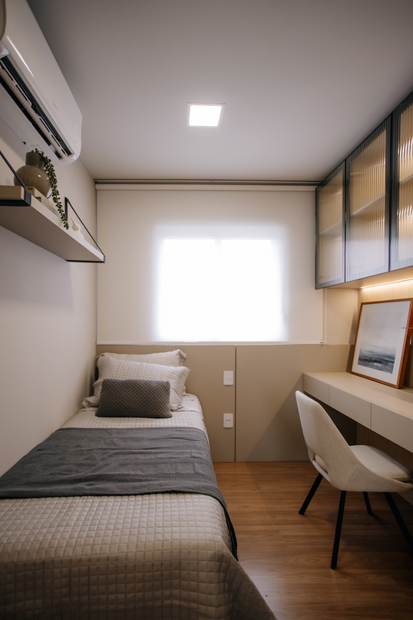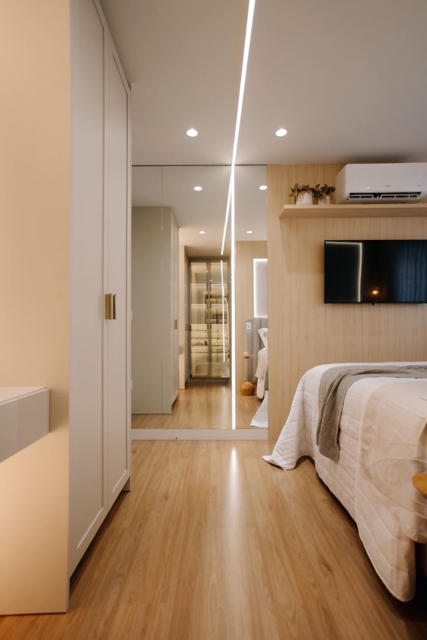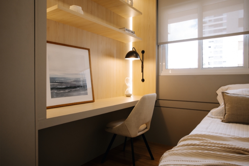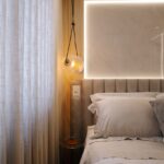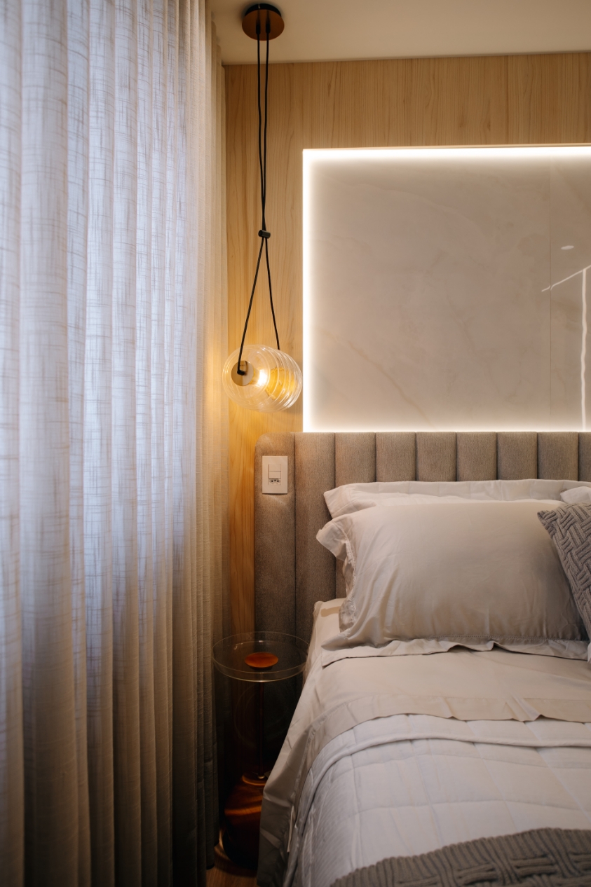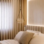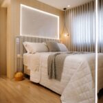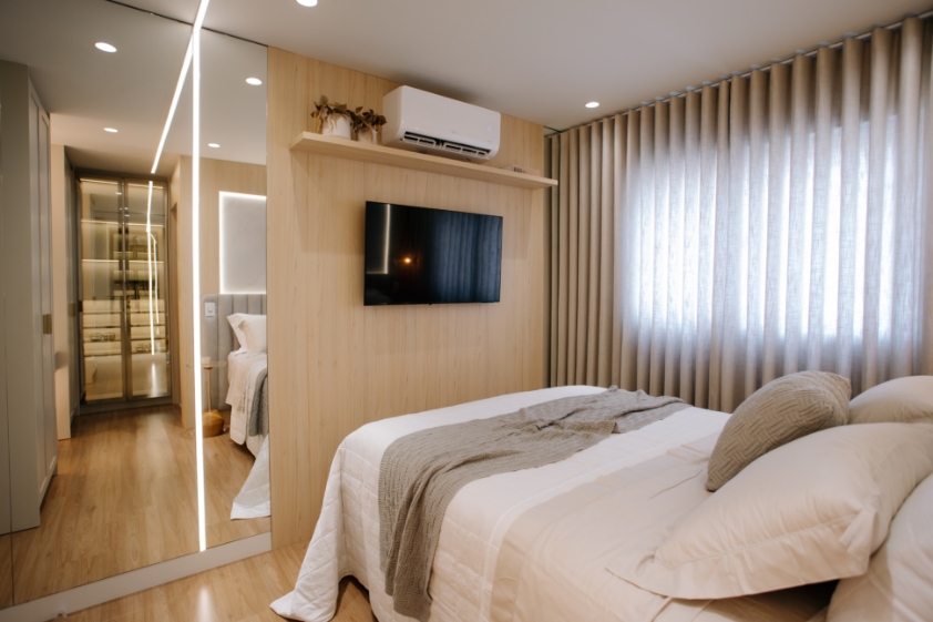 Nos dormitórios, a paleta segue tons neutros e acolhedores para os filhos, enquanto a suíte do casal recebe nuances ainda mais suaves, reforçando a sensação de sofisticação e conforto. O camarim se destaca pela aplicação da tela tensionada, que proporciona iluminação frontal eficiente e transforma o ambiente com elegância.