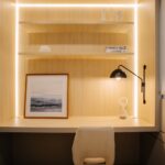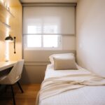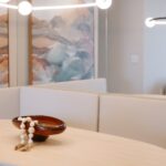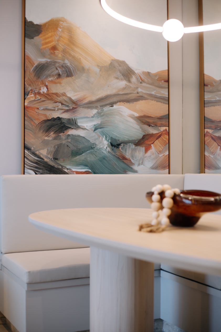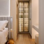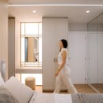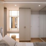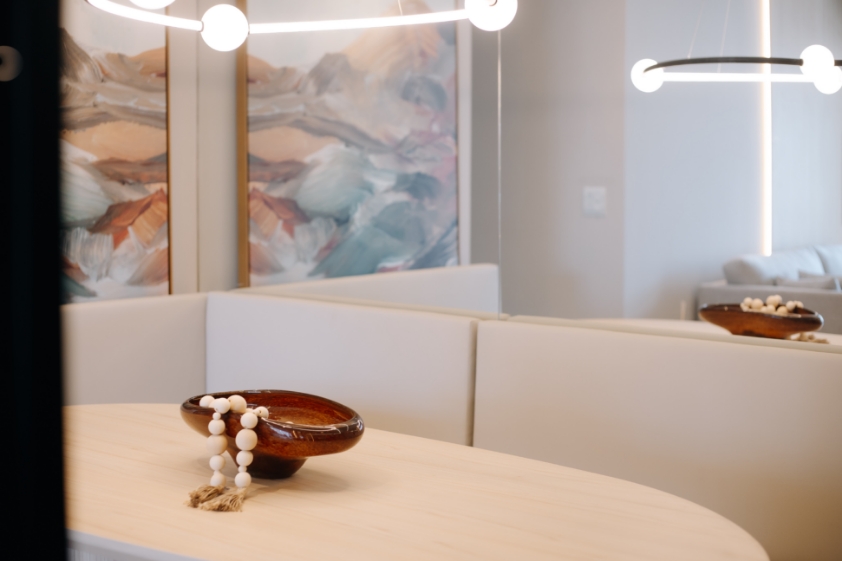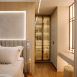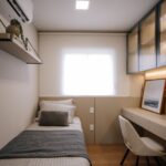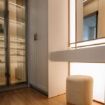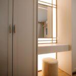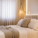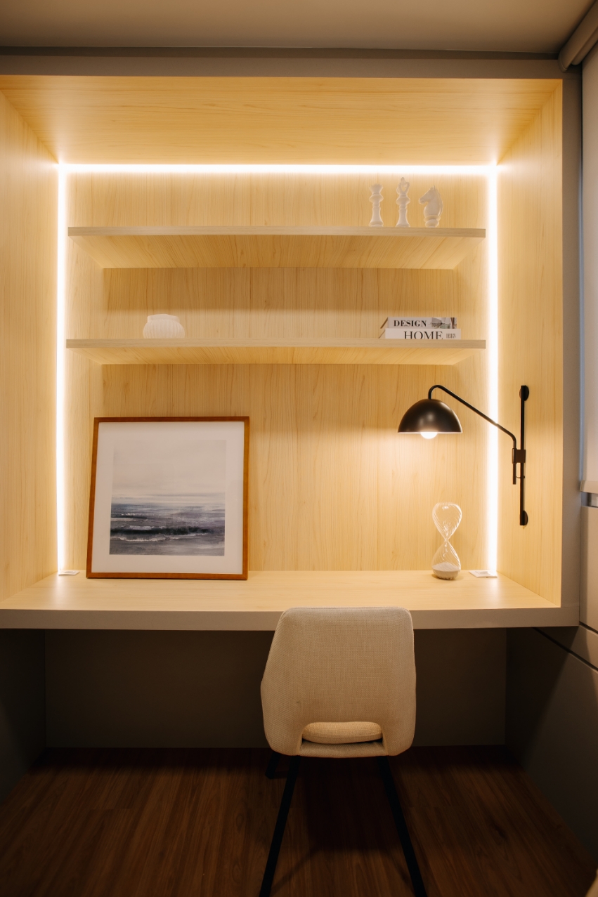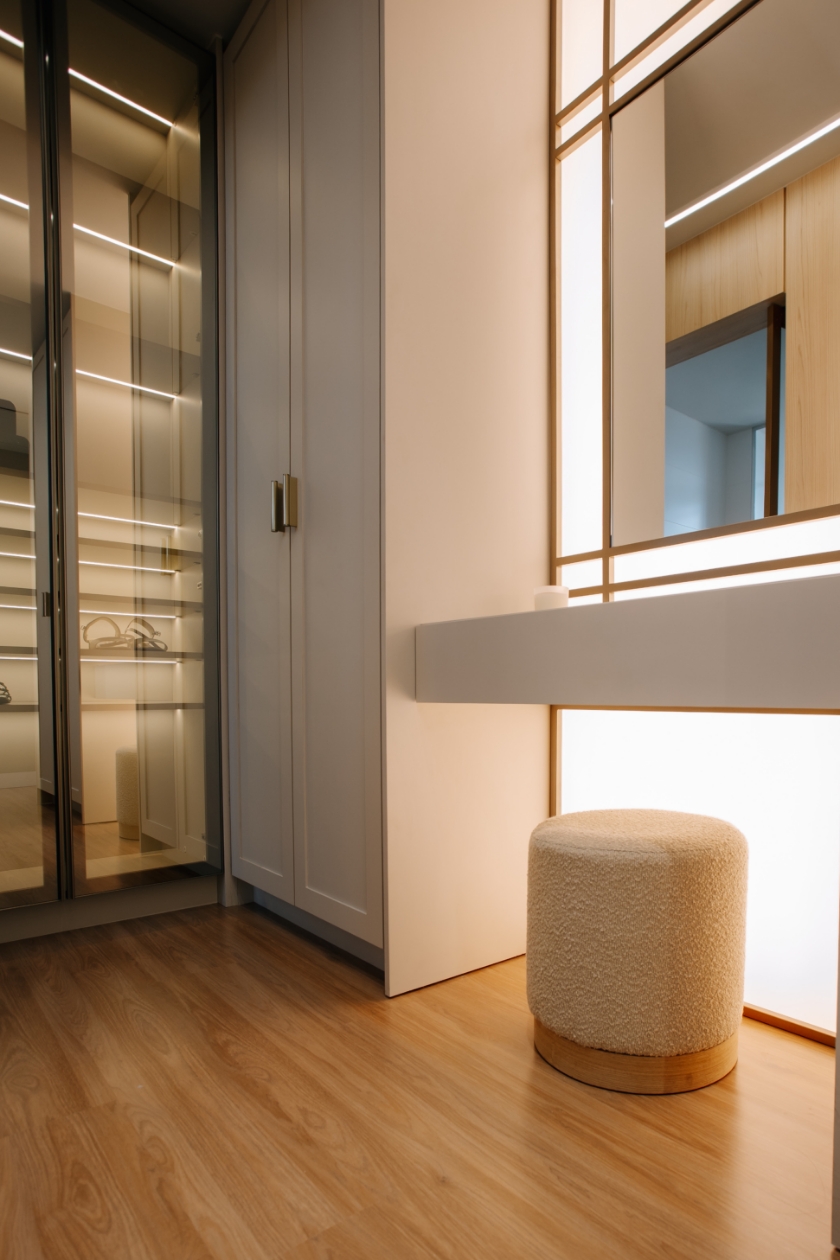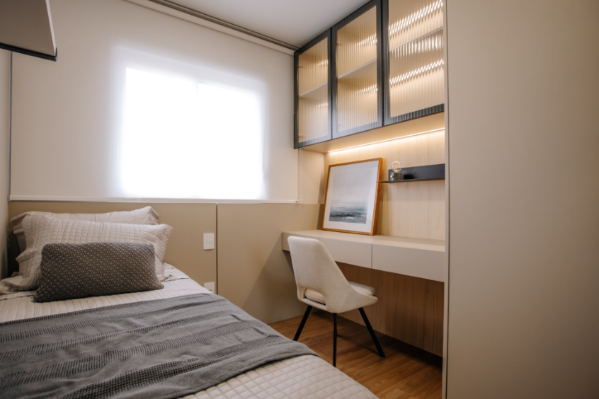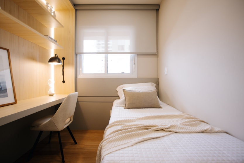 Nos dormitórios, a paleta segue tons neutros e acolhedores para os filhos, enquanto a suíte do casal recebe nuances ainda mais suaves, reforçando a sensação de sofisticação e conforto. O camarim se destaca pela aplicação da tela tensionada, que proporciona iluminação frontal eficiente e transforma o ambiente com elegância.