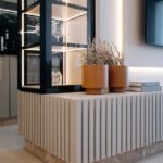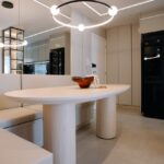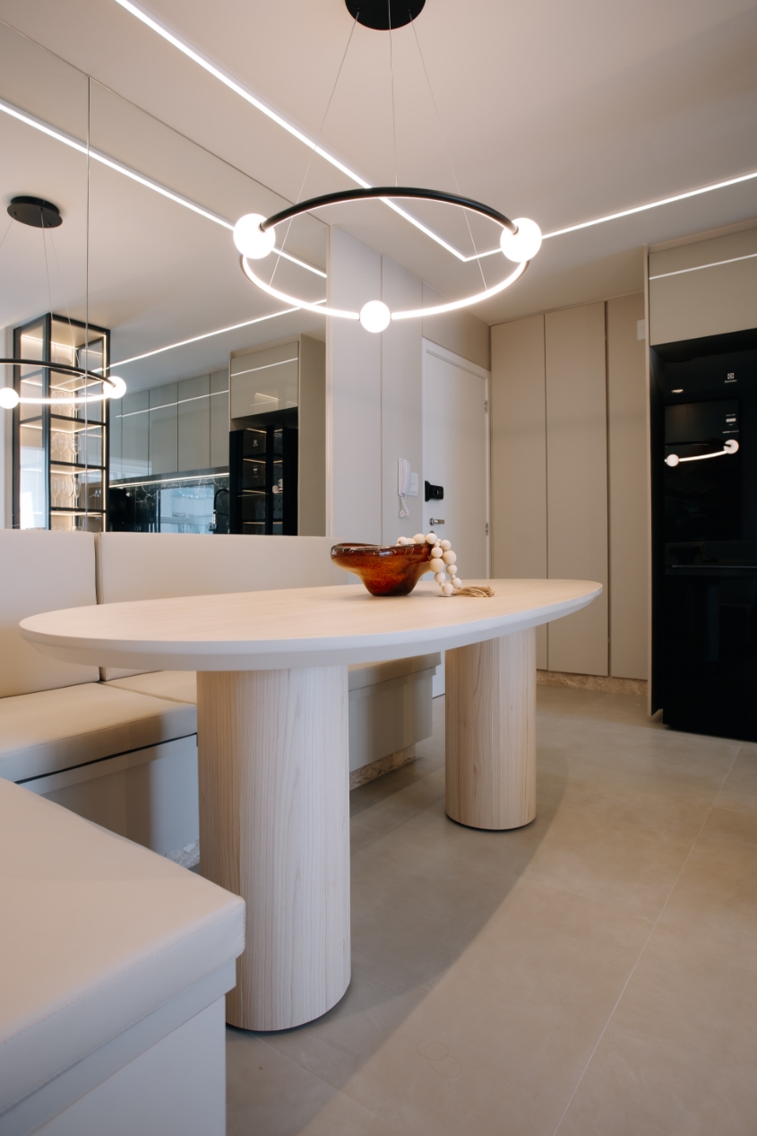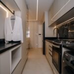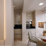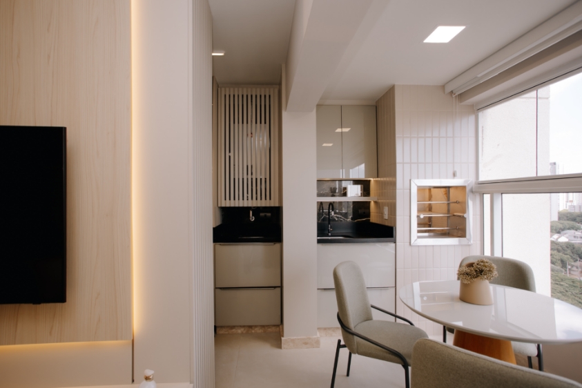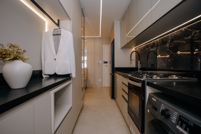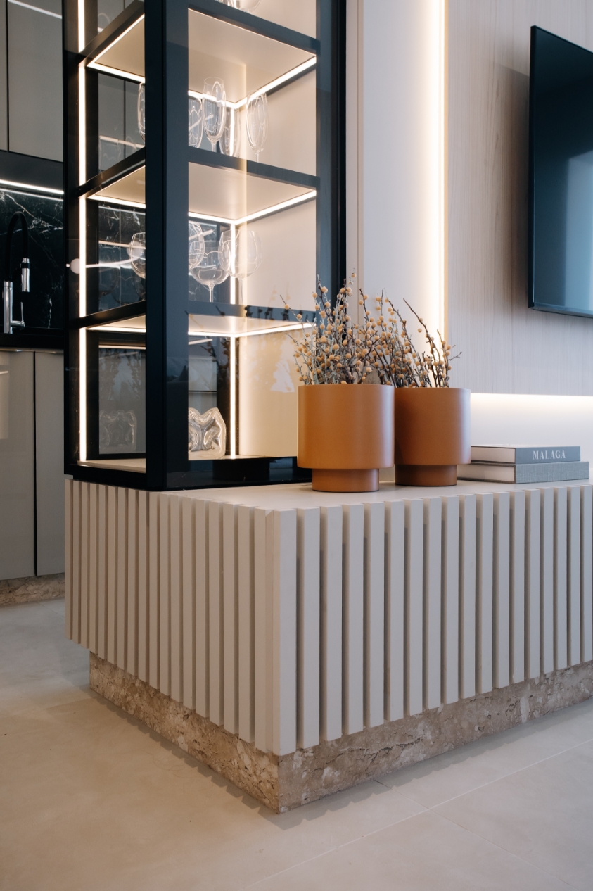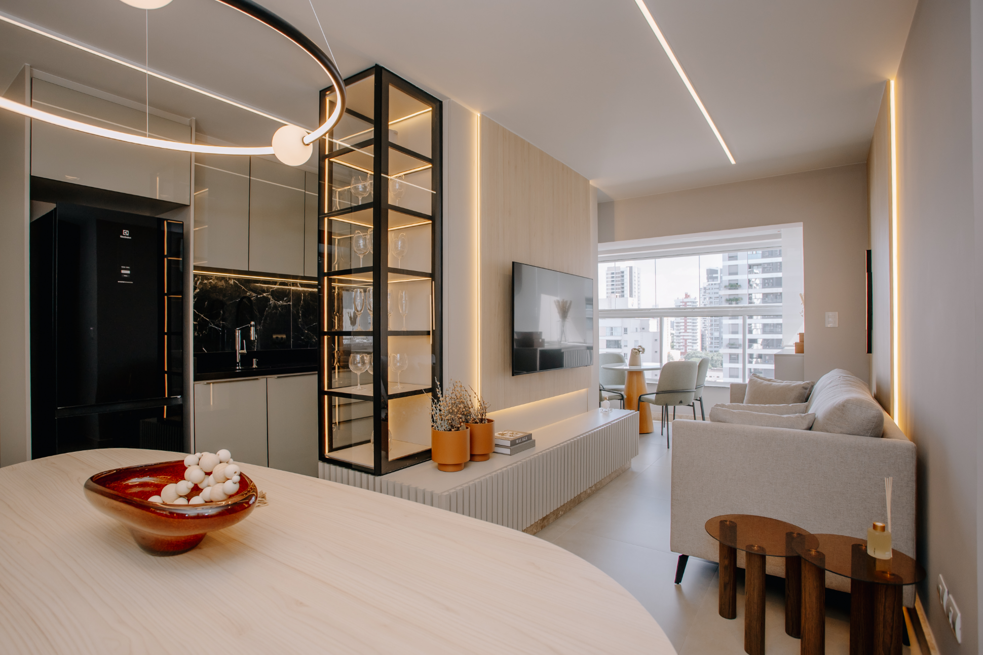 Um dos destaques é o mobiliário sob medida que divide a sala e a cozinha, com ênfase na cristaleira iluminada, visível desde a porta de entrada do apartamento. A solução cria uma separação sutil, sem comprometer a integração dos ambientes. Na cozinha, a combinação das portas em vidro na cor fendi com o granito preto absoluto resulta em um contraste marcante.