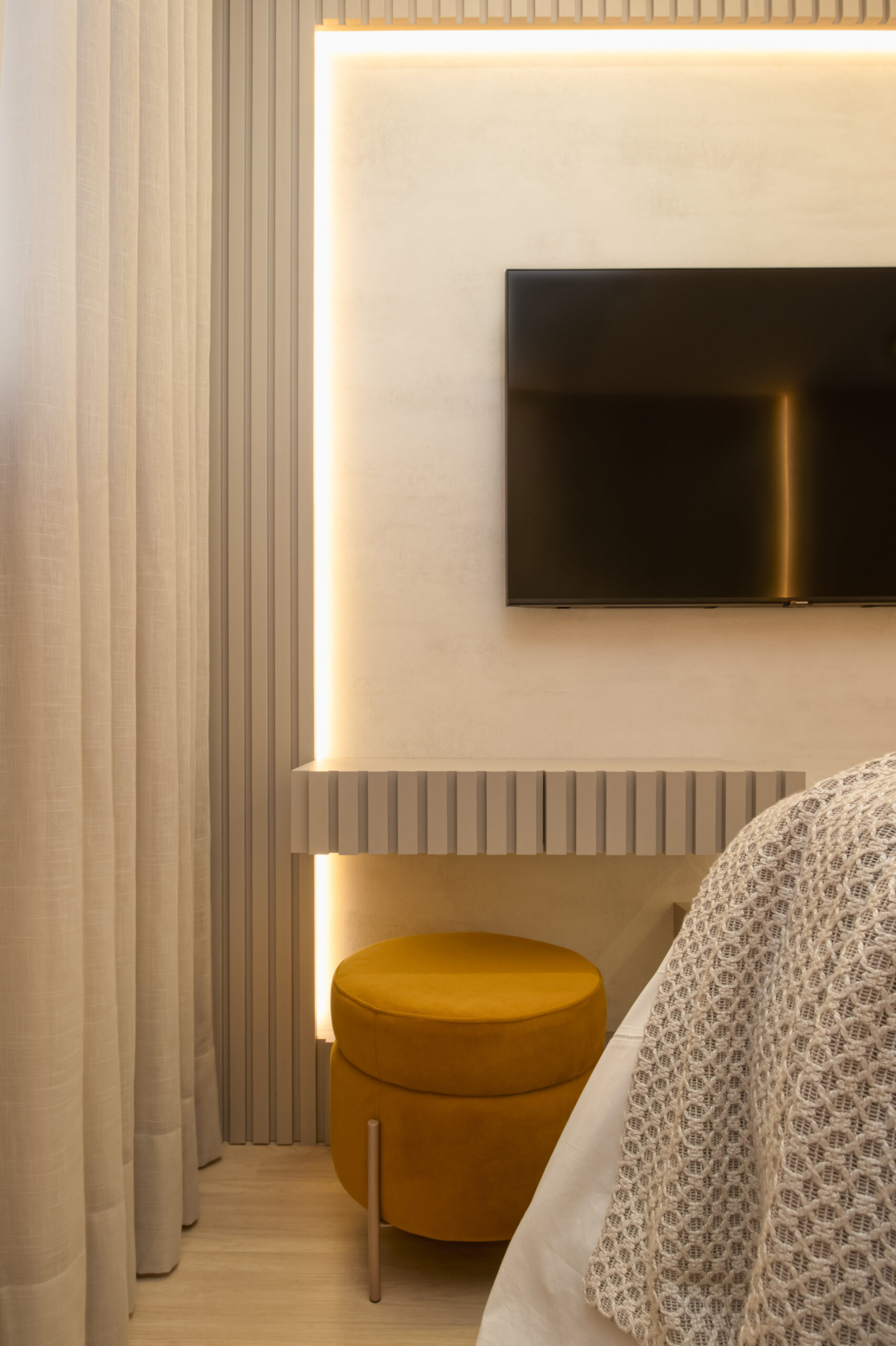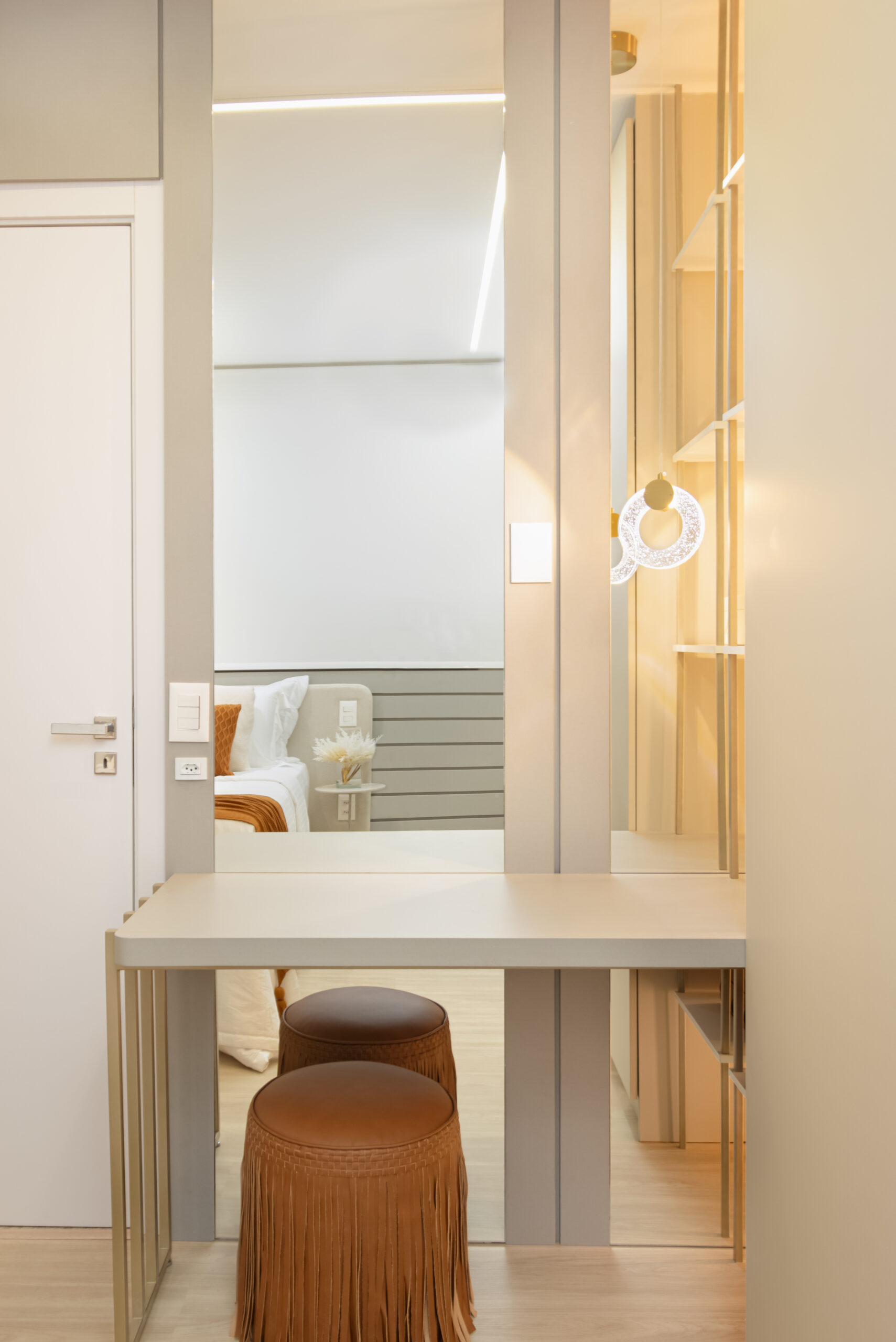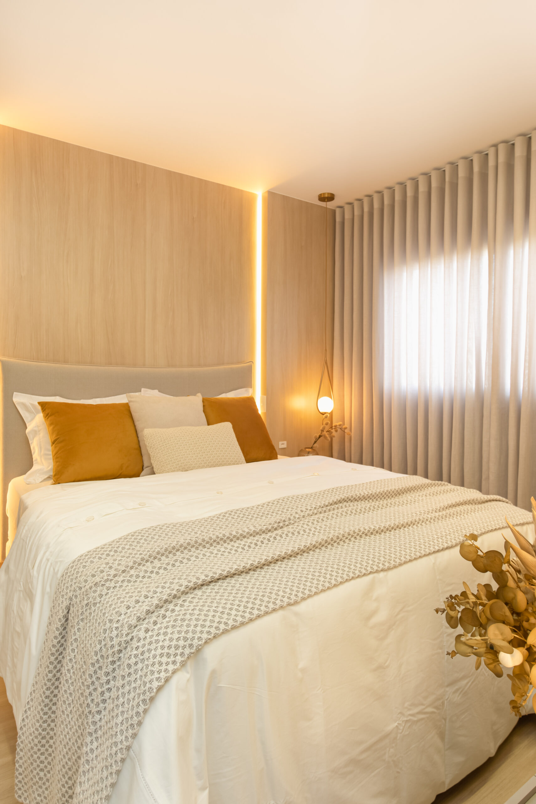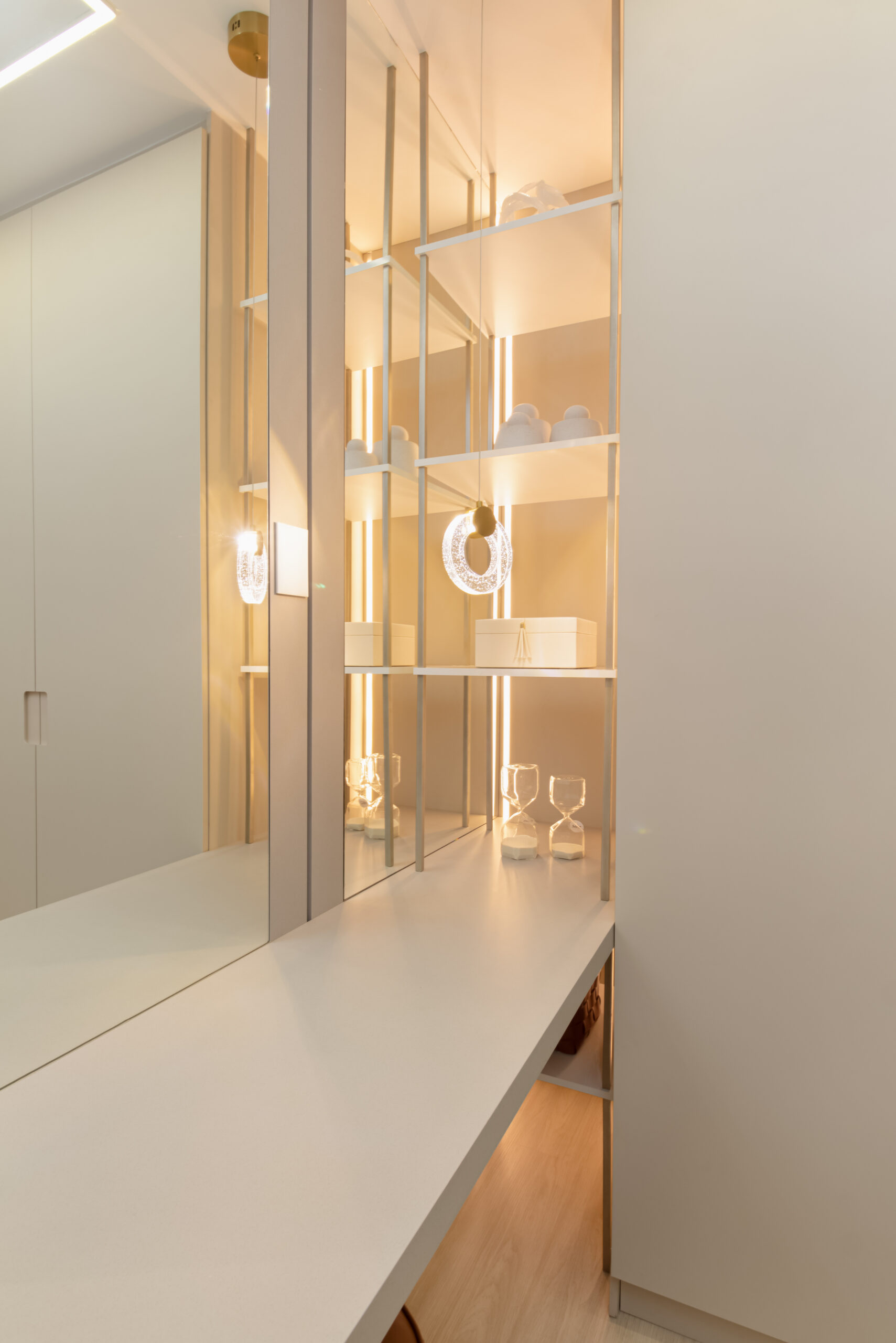 Na suíte a iluminação é feita com perfis lineares que proporcionam equilíbrio, garantindo que o foco seja no descanso e no aconchego. Não esquecendo dos detalhes práticos, como o closet linear que não apenas separa os espaços, mas também oferece um local elegante para calçar sapatos e pendurar bolsas. Todos os ambientes transbordam aconchego e delicadeza, com um design atemporal e funcional!