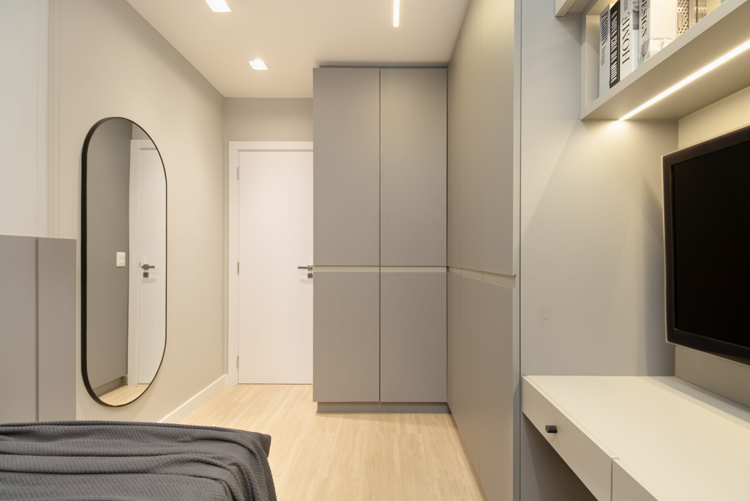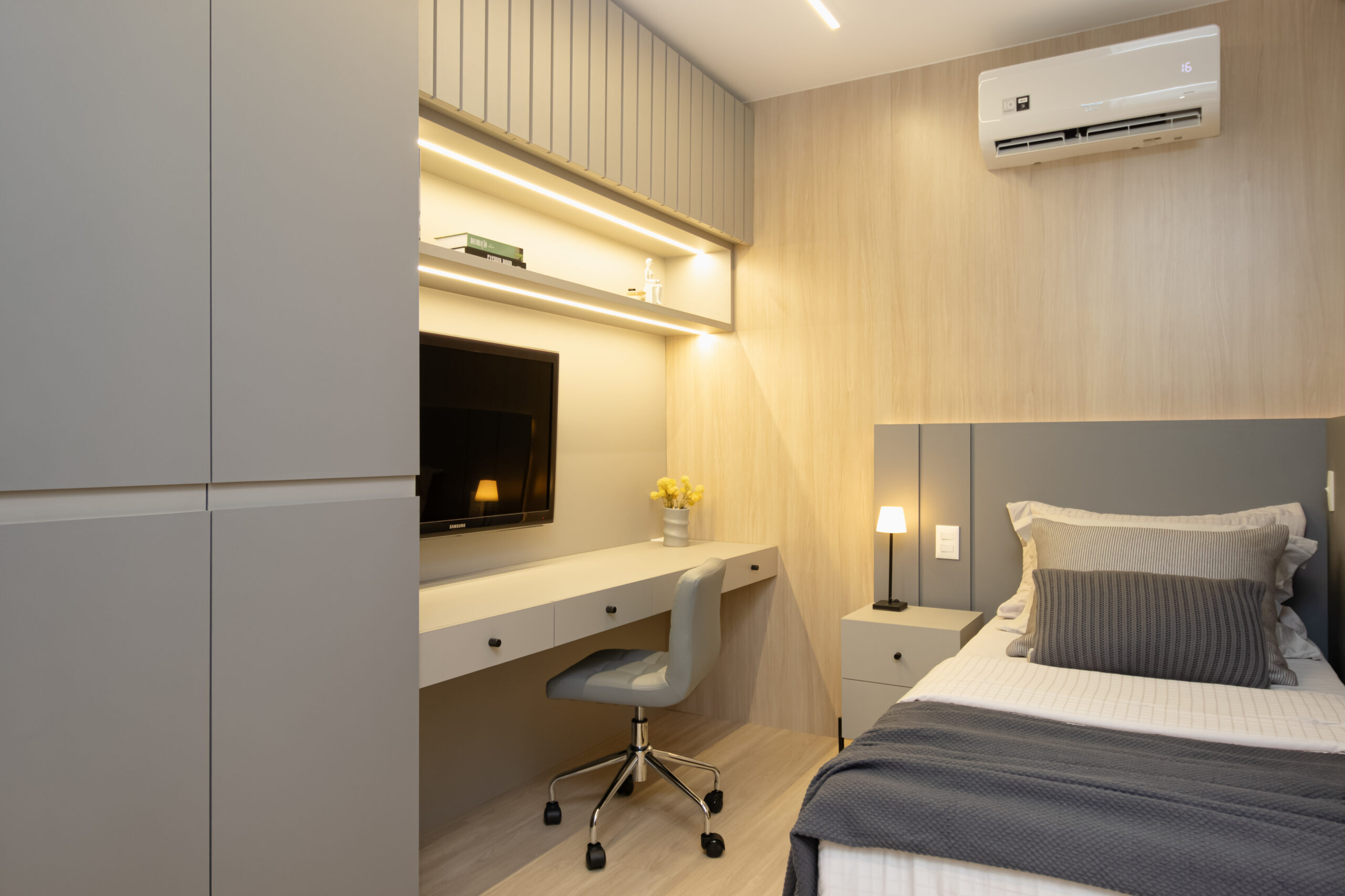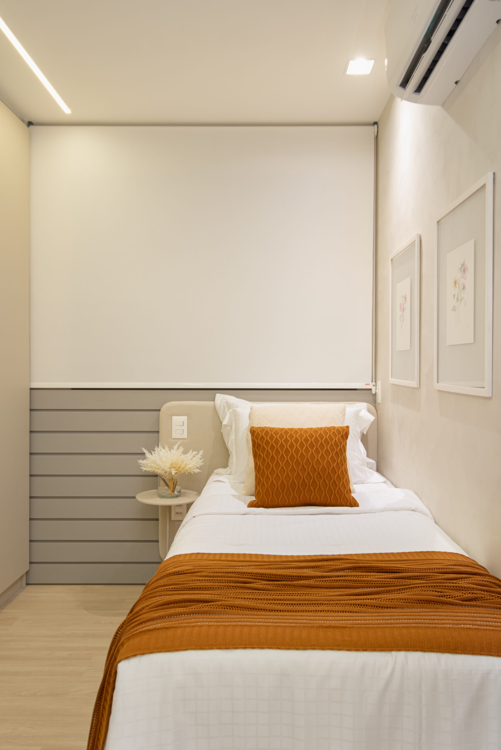 Na suíte a iluminação é feita com perfis lineares que proporcionam equilíbrio, garantindo que o foco seja no descanso e no aconchego. Não esquecendo dos detalhes práticos, como o closet linear que não apenas separa os espaços, mas também oferece um local elegante para calçar sapatos e pendurar bolsas. Todos os ambientes transbordam aconchego e delicadeza, com um design atemporal e funcional!