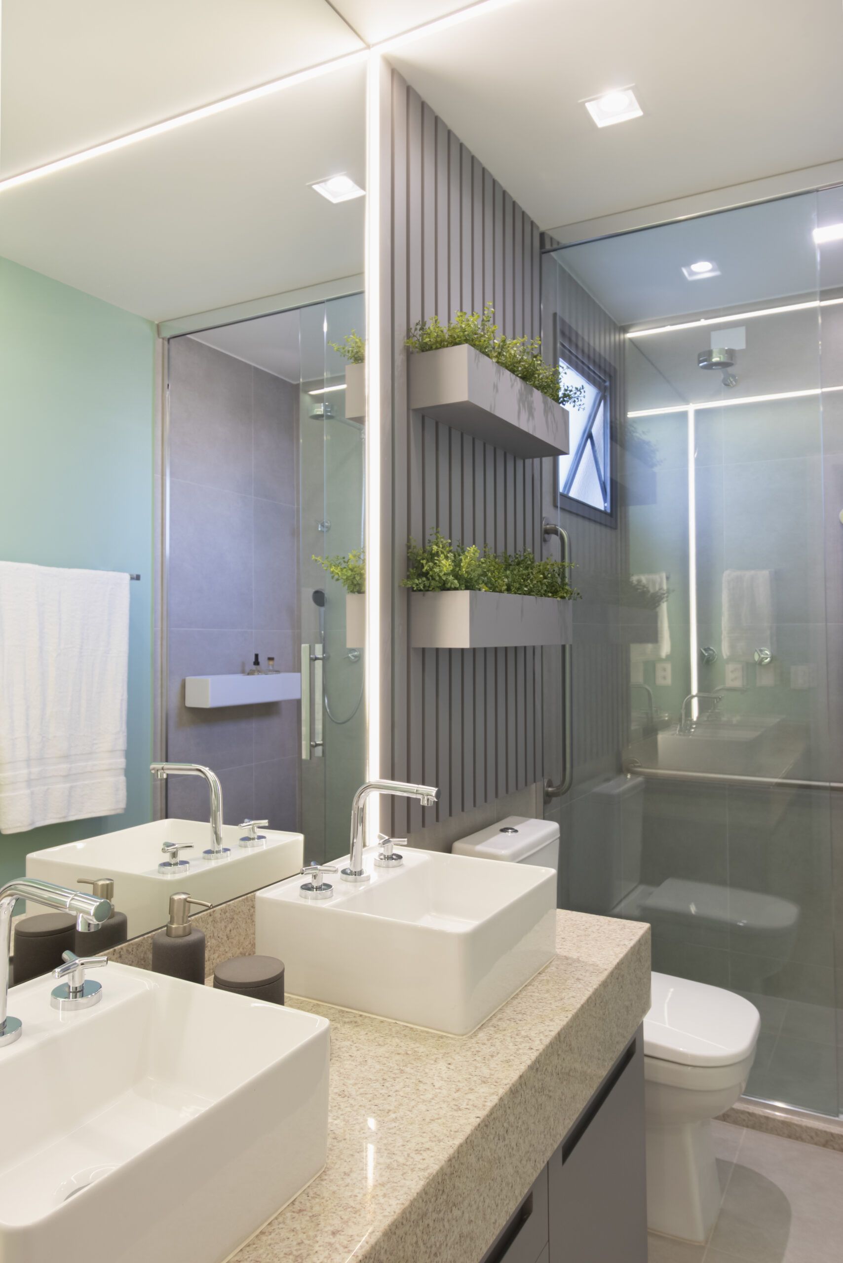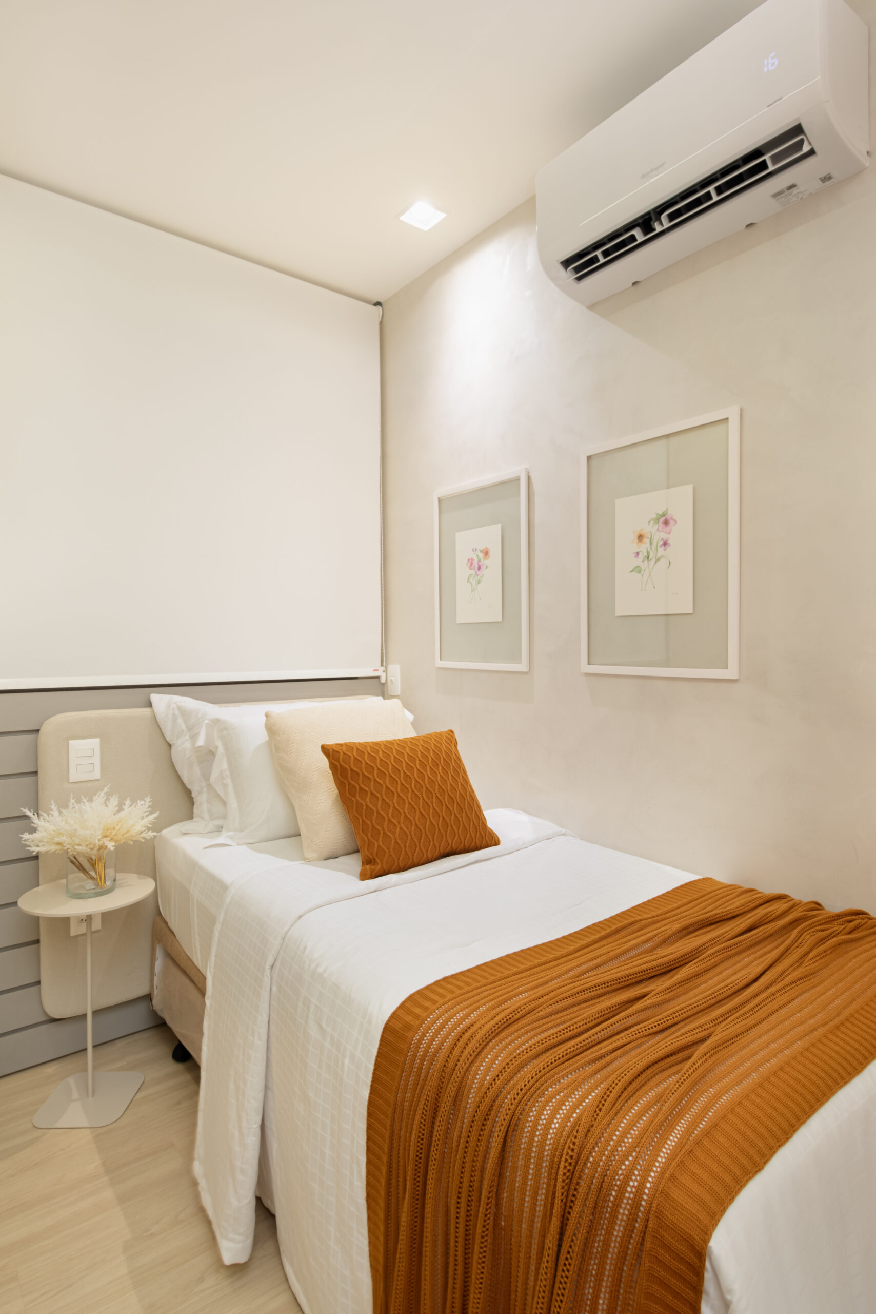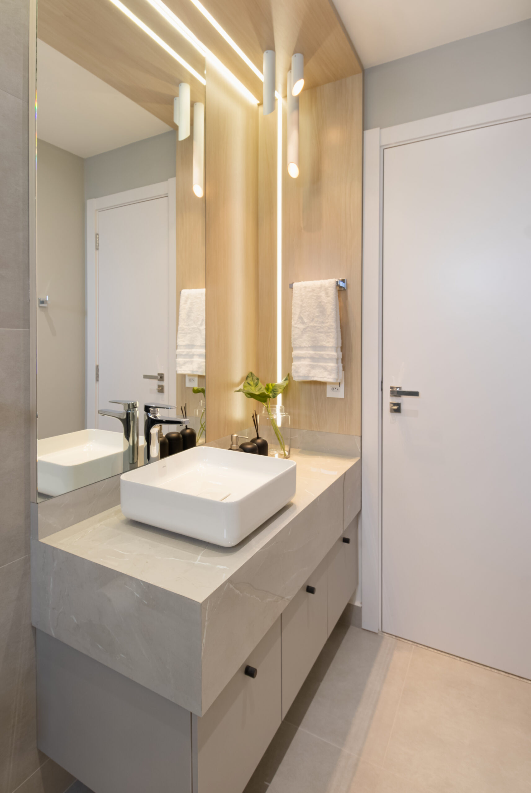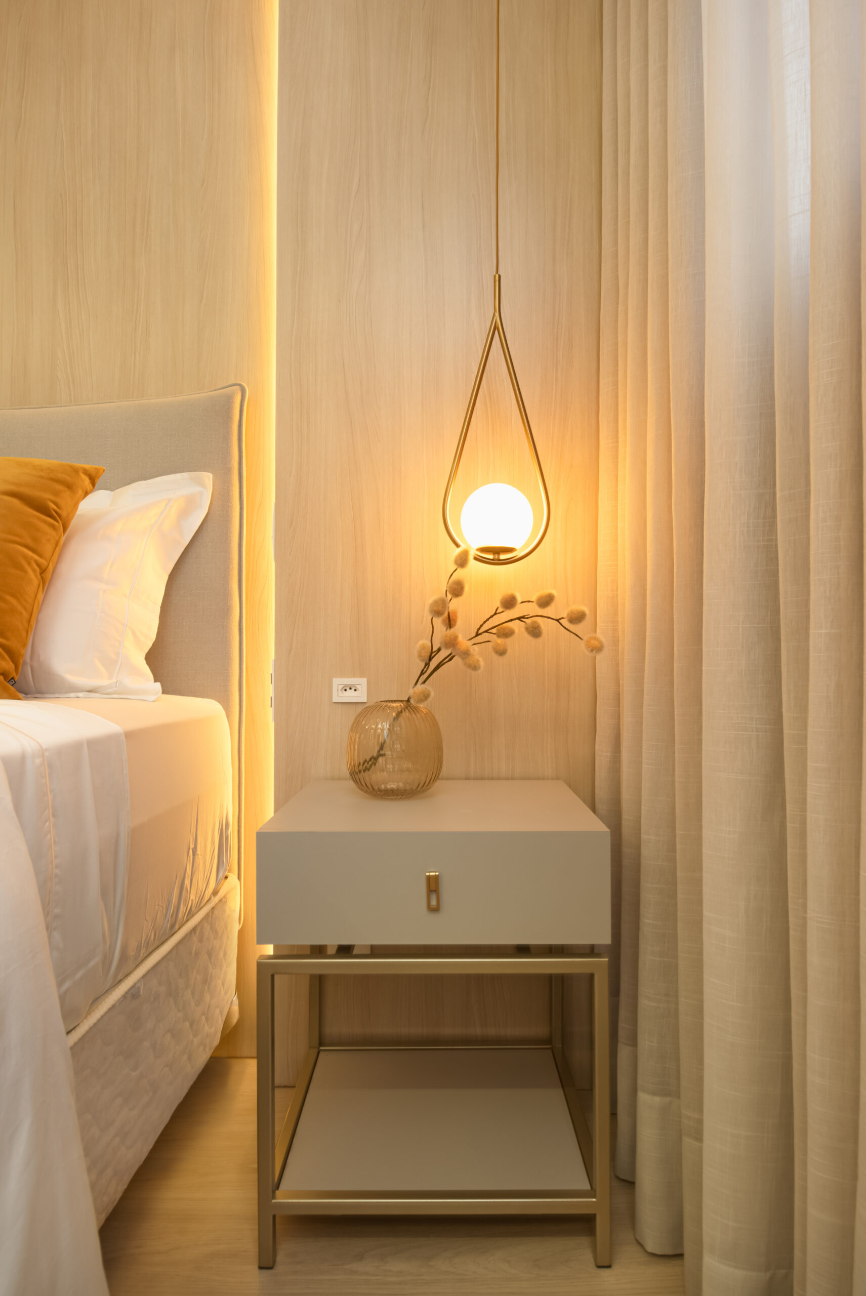Na suíte a iluminação é feita com perfis lineares que proporcionam equilíbrio, garantindo que o foco seja no descanso e no aconchego. Não esquecendo dos detalhes práticos, como o closet linear que não apenas separa os espaços, mas também oferece um local elegante para calçar sapatos e pendurar bolsas. Todos os ambientes transbordam aconchego e delicadeza, com um design atemporal e funcional!
