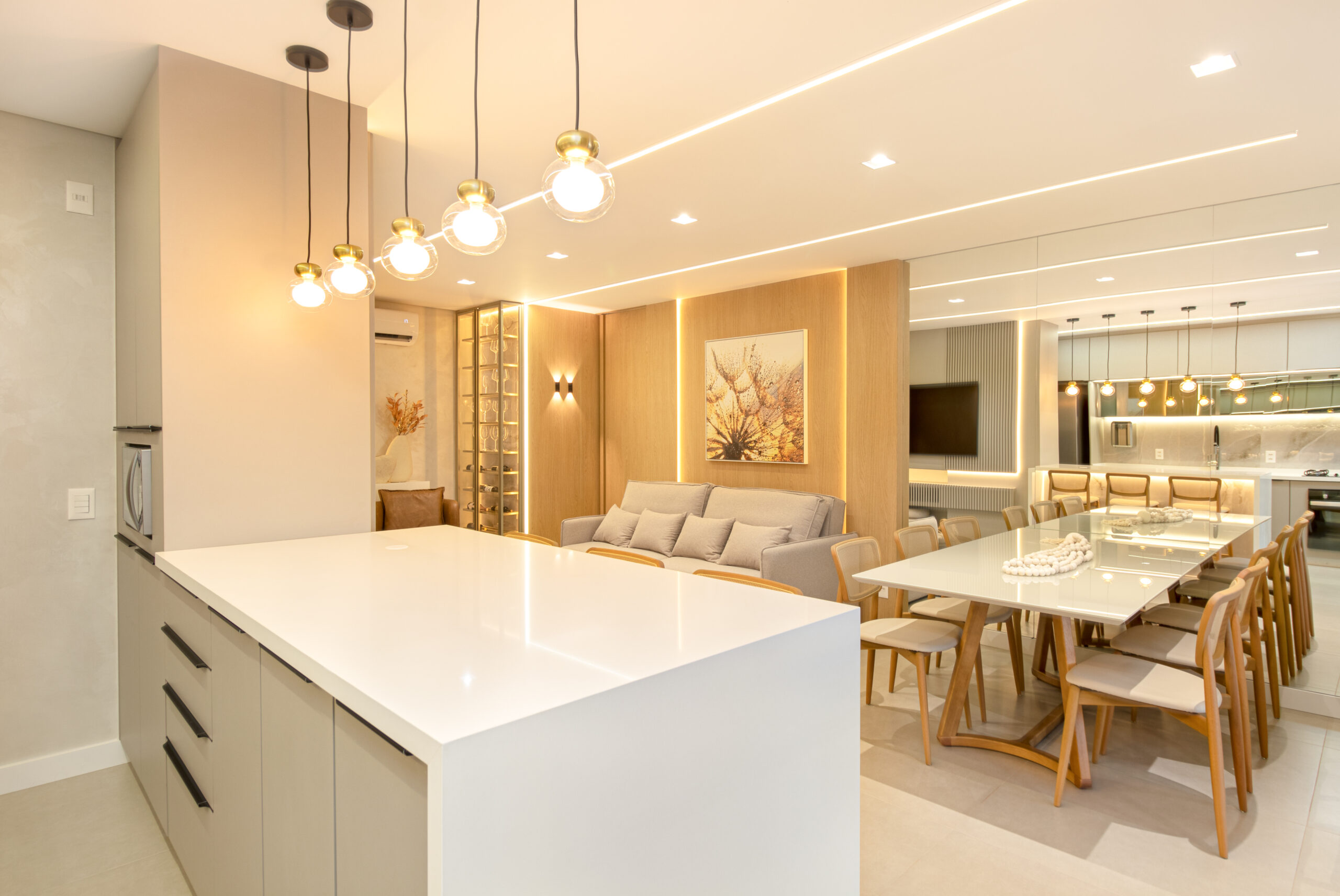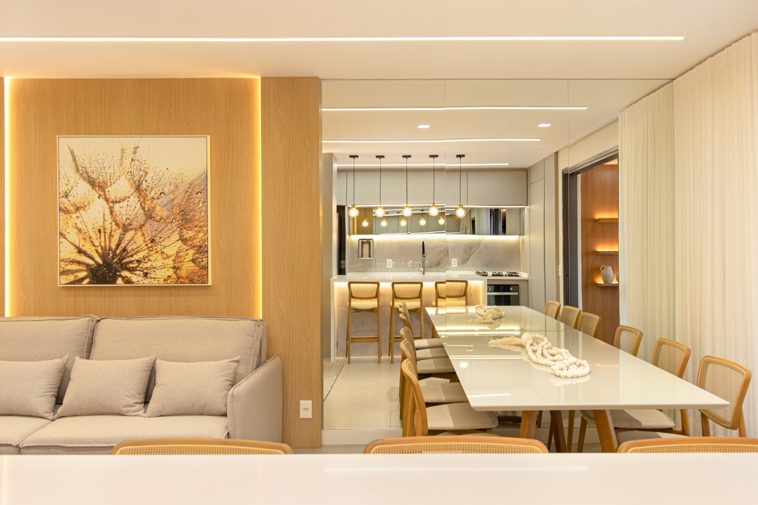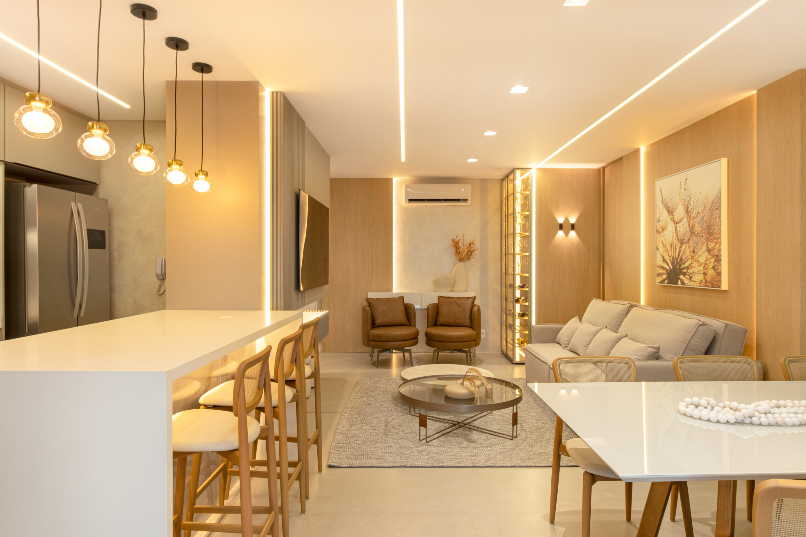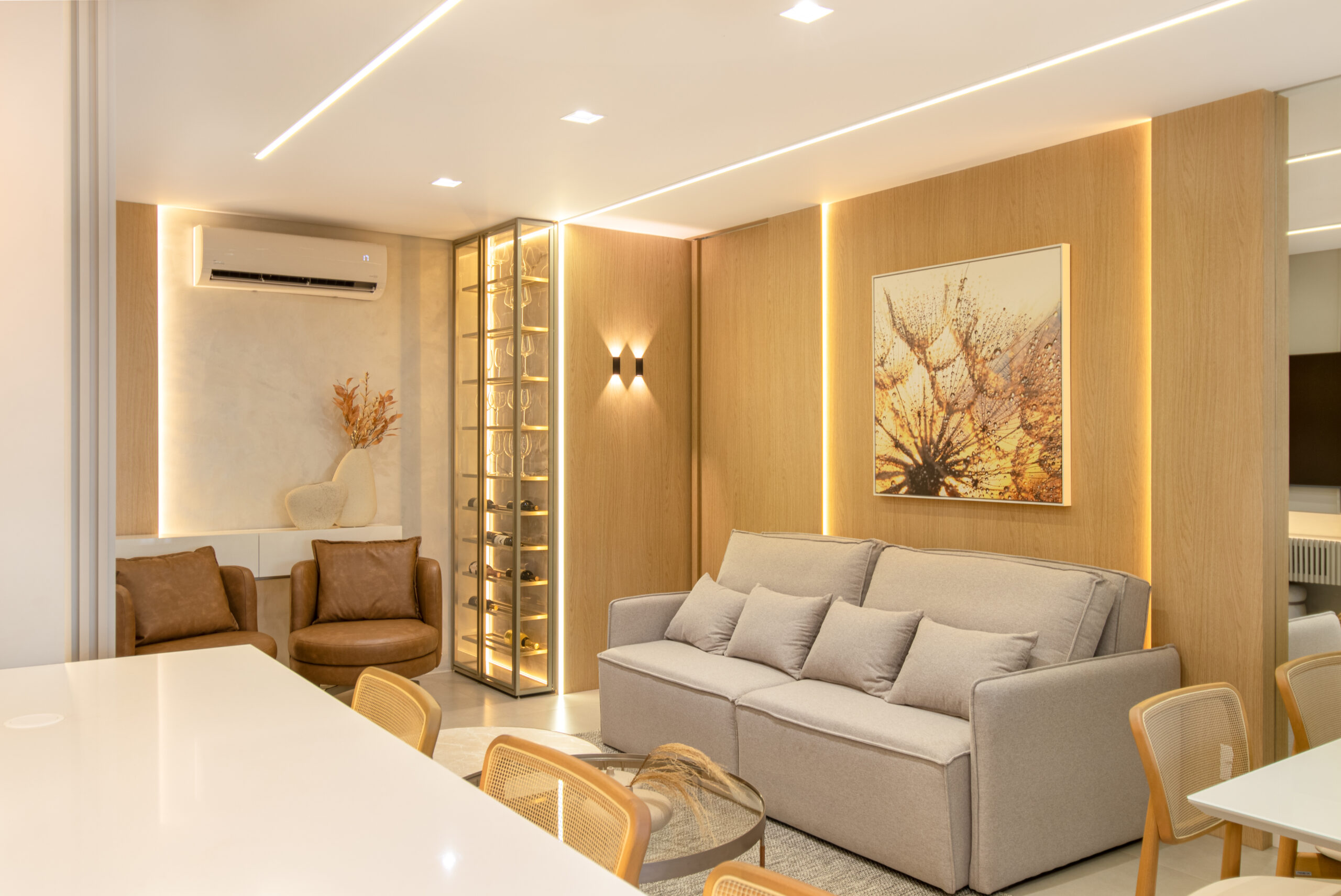 Logo na entrada, somos recebidos por uma cristaleira/adega deslumbrante, acompanhada por duas poltronas em couro que adicionam um toque sutil de cor ao ambiente. A sala de estar, integrada à sala de jantar e cozinha, apresenta um design clean e elegante, com painéis de MDF Carvalho Natural e uma iluminação delicada proporcionada pelos perfis de LED.