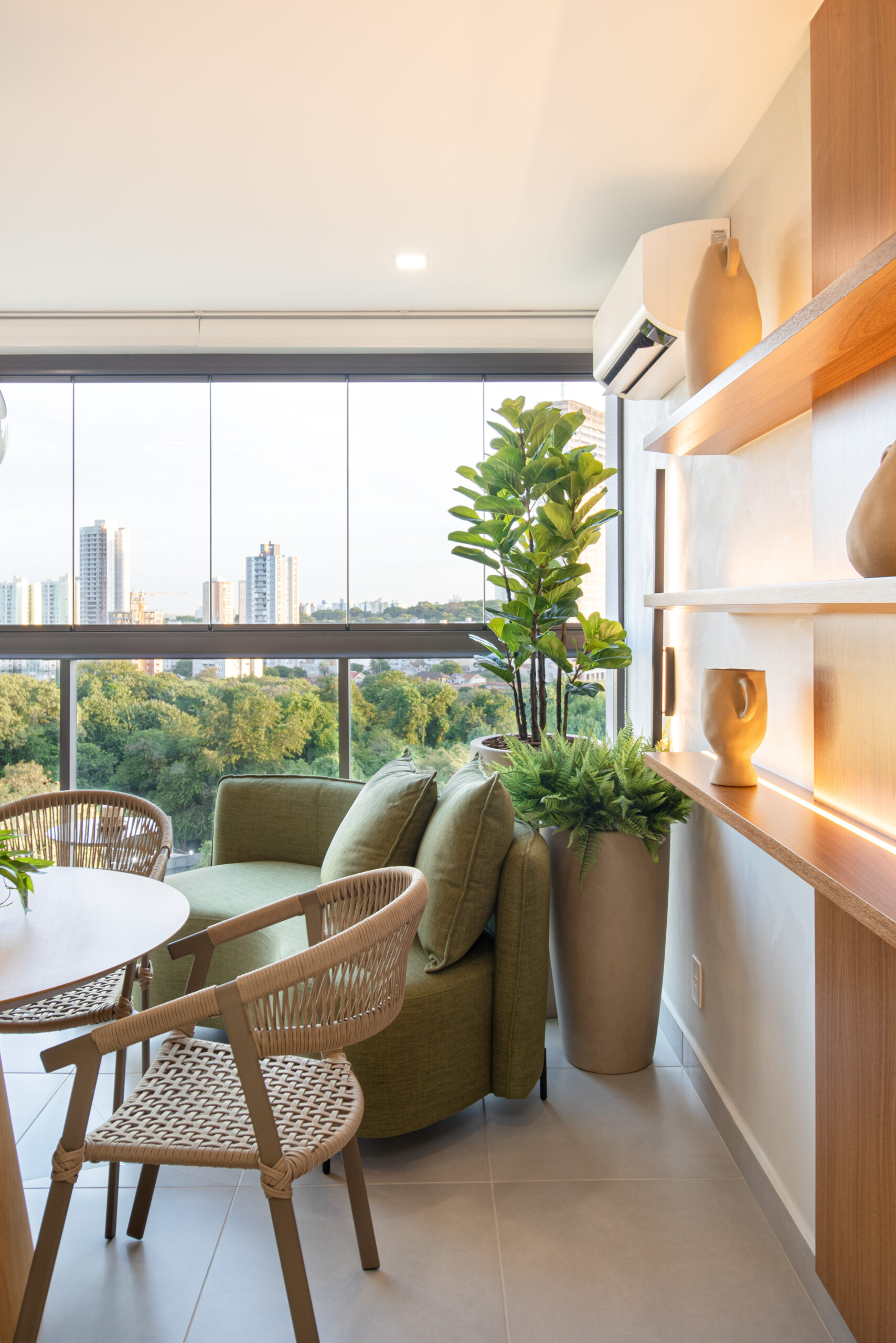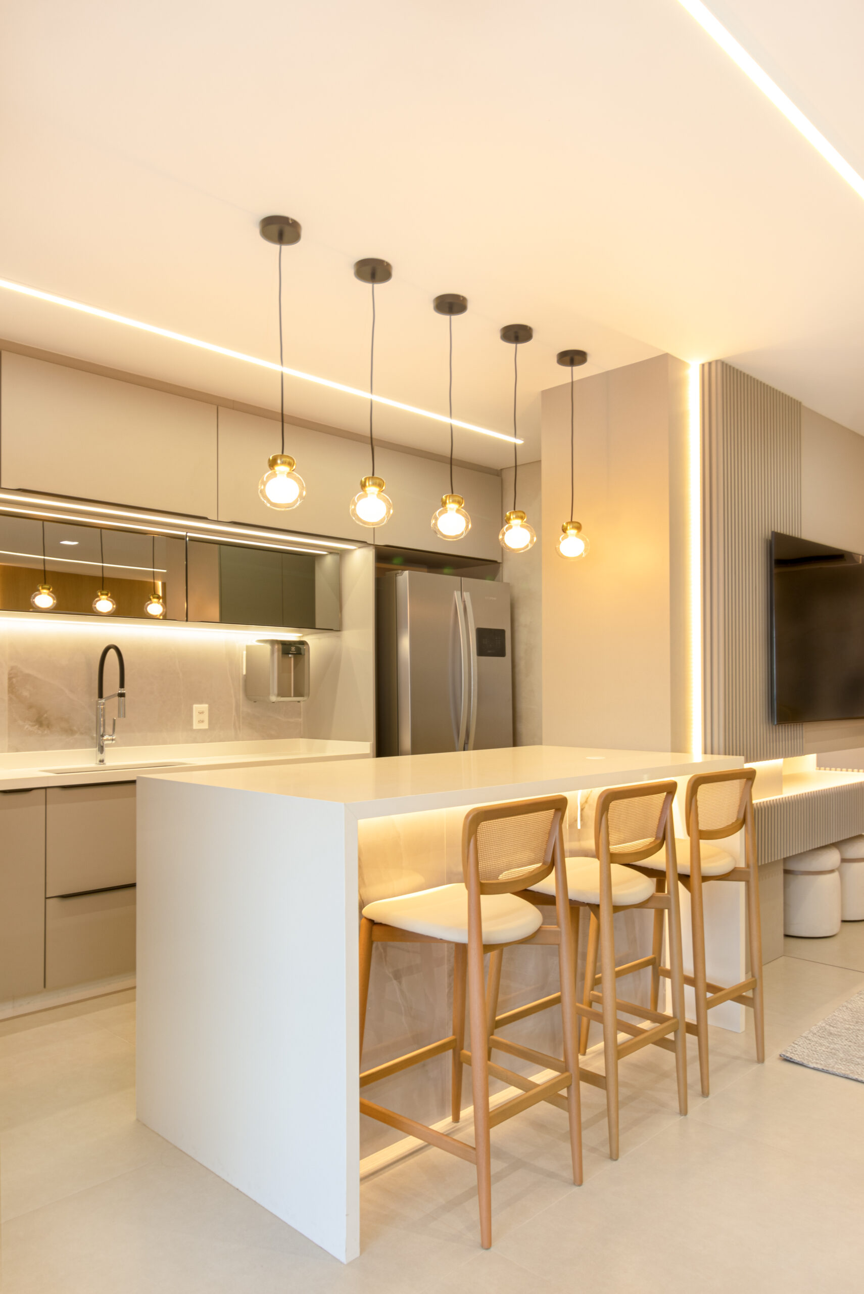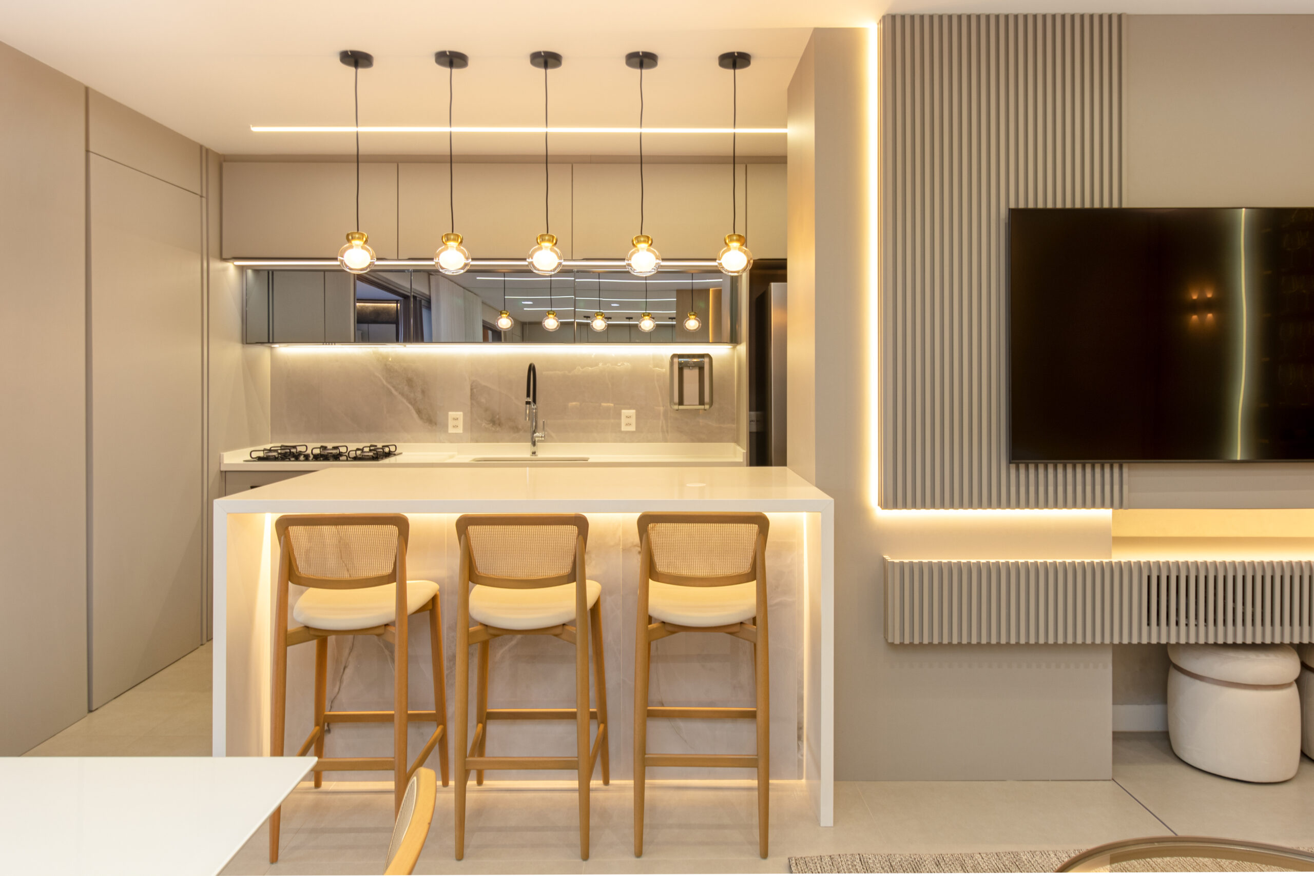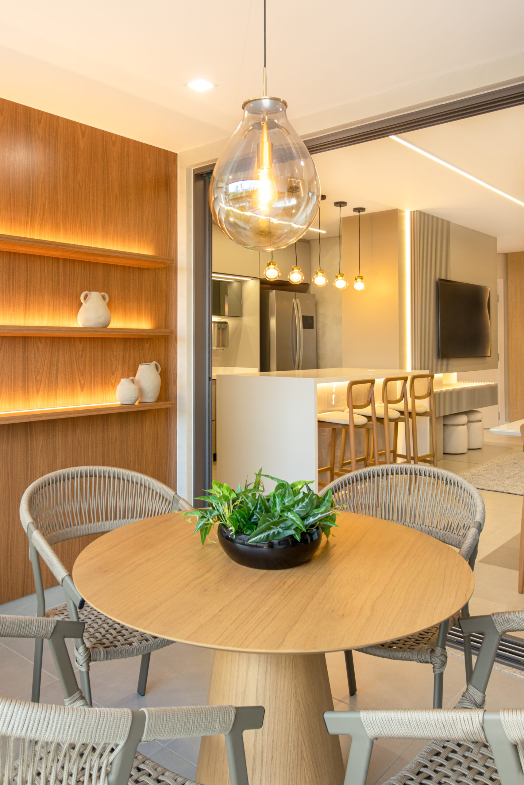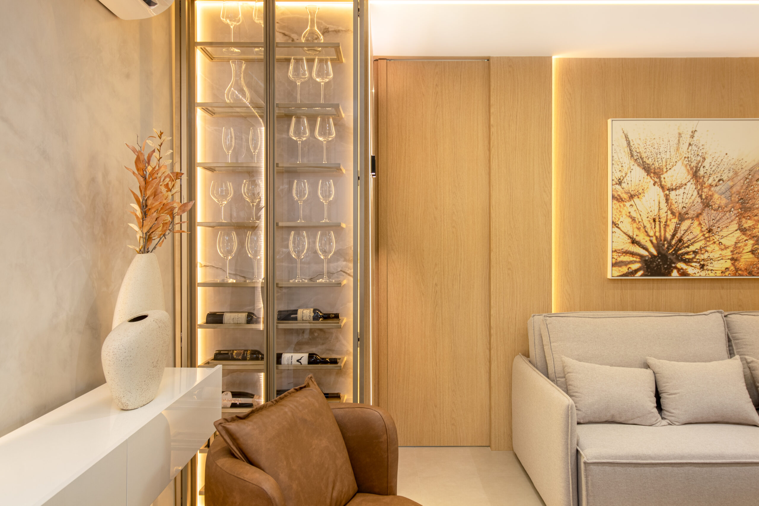 Logo na entrada, somos recebidos por uma cristaleira/adega deslumbrante, acompanhada por duas poltronas em couro que adicionam um toque sutil de cor ao ambiente. A sala de estar, integrada à sala de jantar e cozinha, apresenta um design clean e elegante, com painéis de MDF Carvalho Natural e uma iluminação delicada proporcionada pelos perfis de LED.