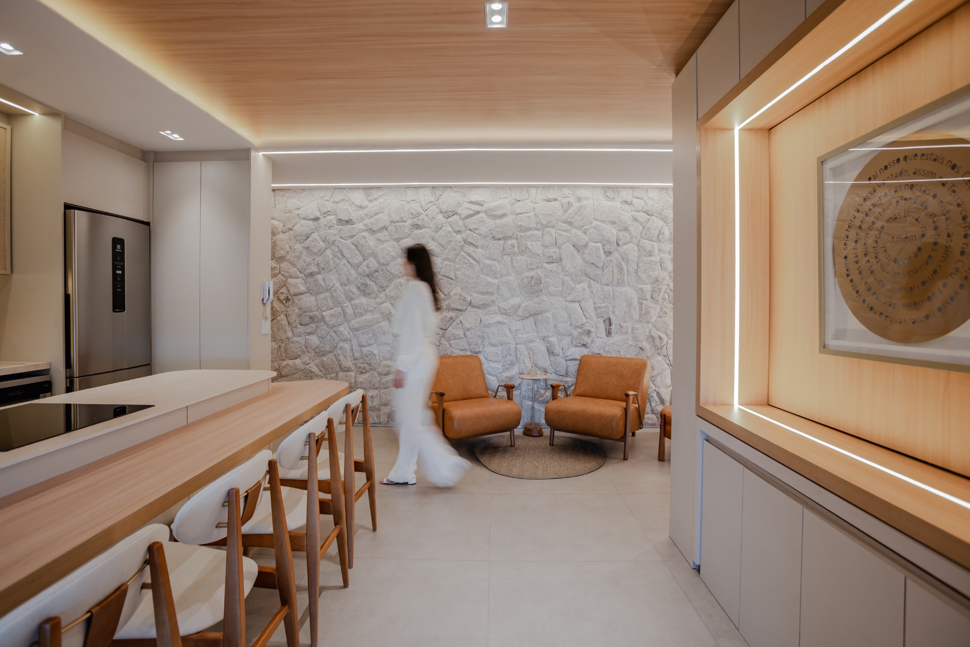 O Apartamento Refúgio nasce do desejo dos clientes de criar um verdadeiro espaço de acolhimento, onde seja possível relaxar e desfrutar de bons momentos com tranquilidade. Logo na entrada, o painel em pedra natural se destaca em contraste com as poltronas em couro, marcando a chegada ao apartamento com sofisticação. O forro em madeira complementa a proposta, reforçando a sensação de aconchego tão desejada pelos moradores.