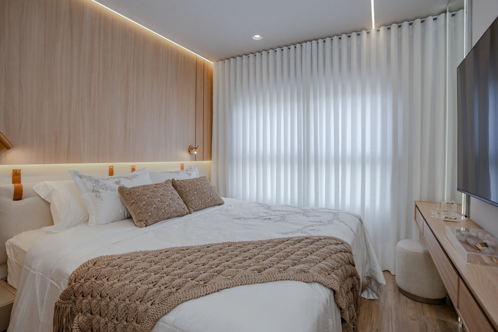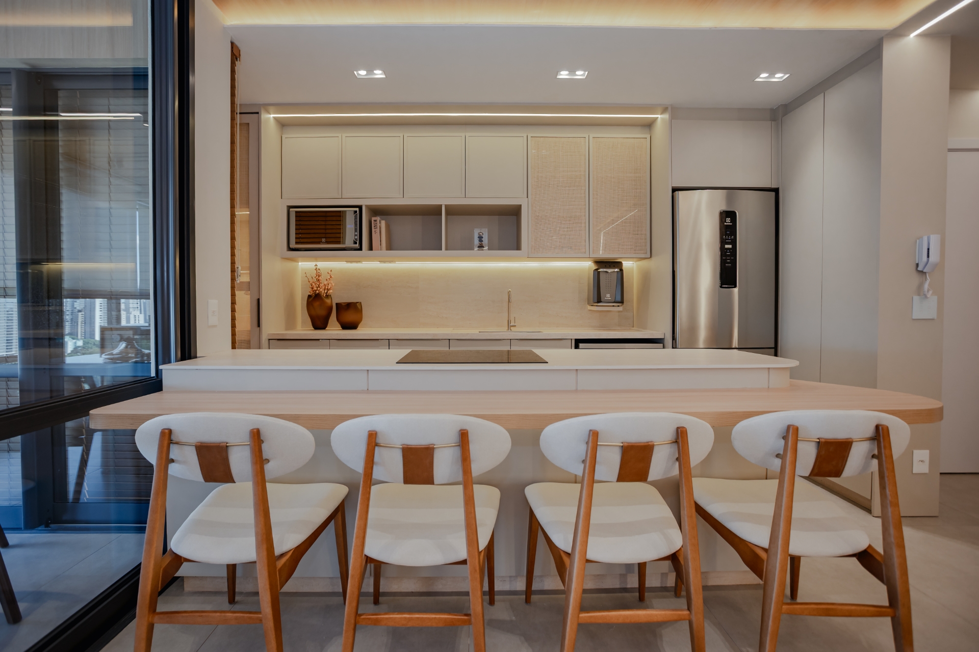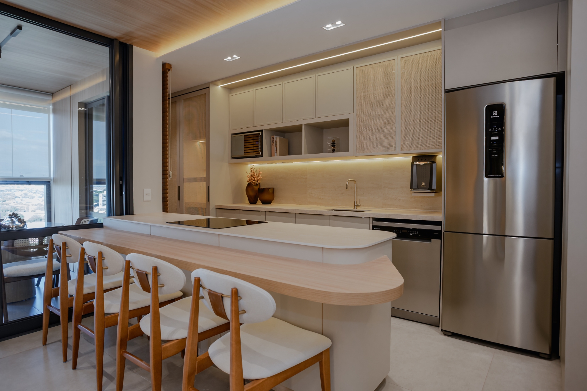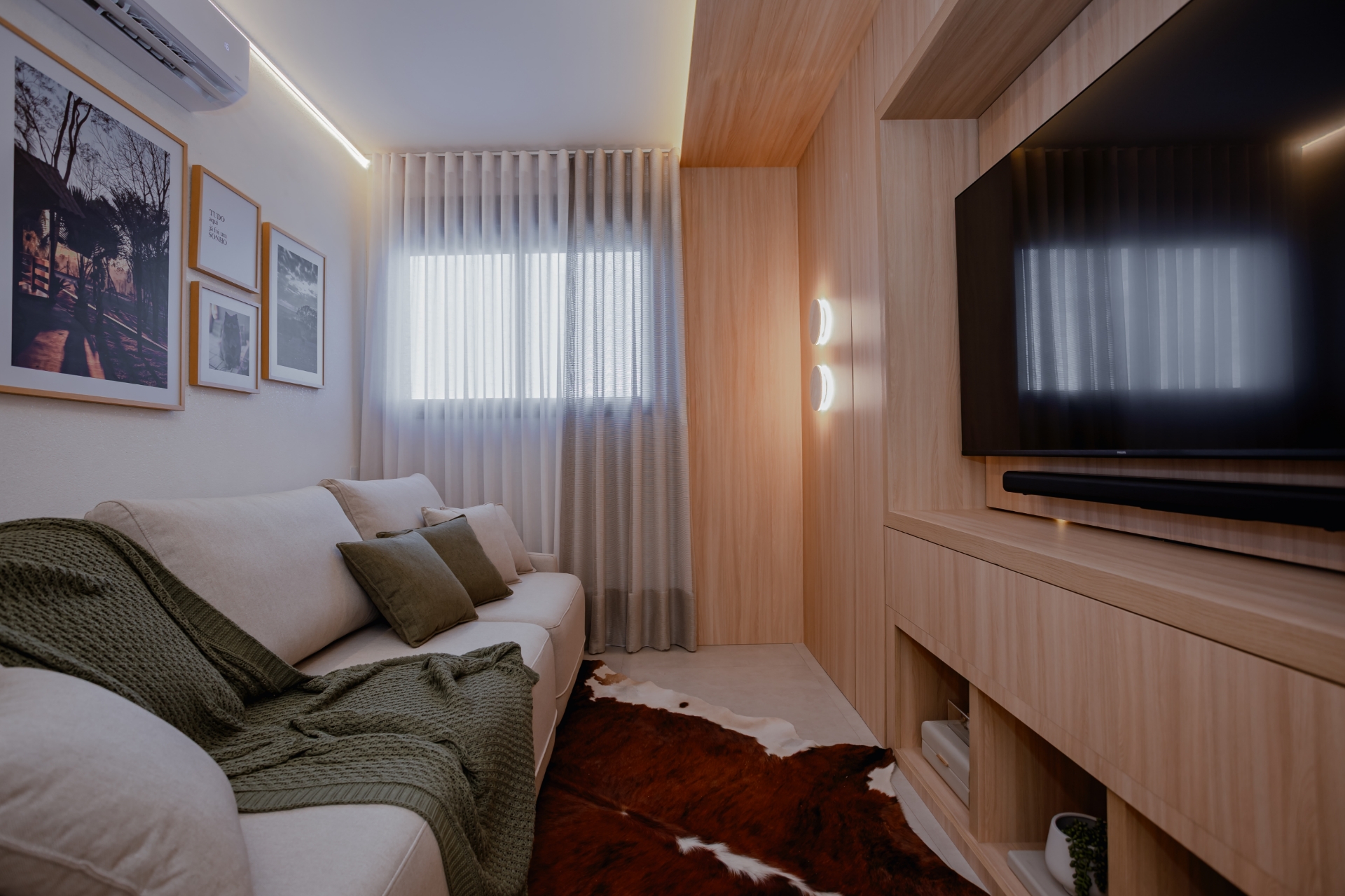Como solução funcional, foi desenvolvido um painel giratório na área social, permitindo que a TV seja direcionada tanto para a sala quanto para a cozinha, atendendo aos diferentes momentos do dia com praticidade.