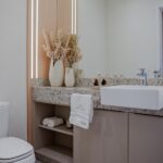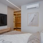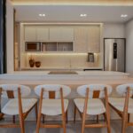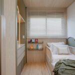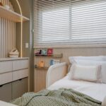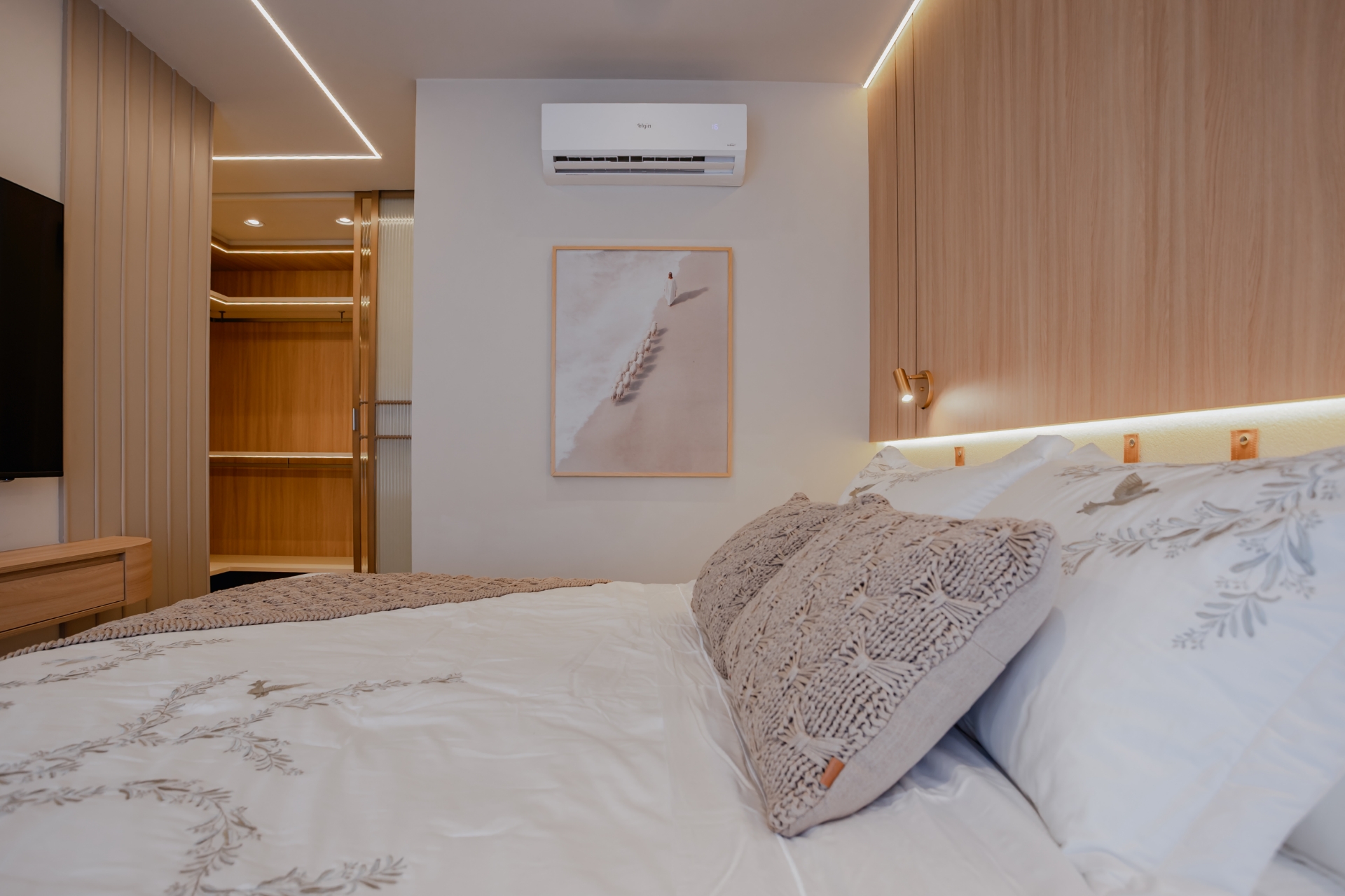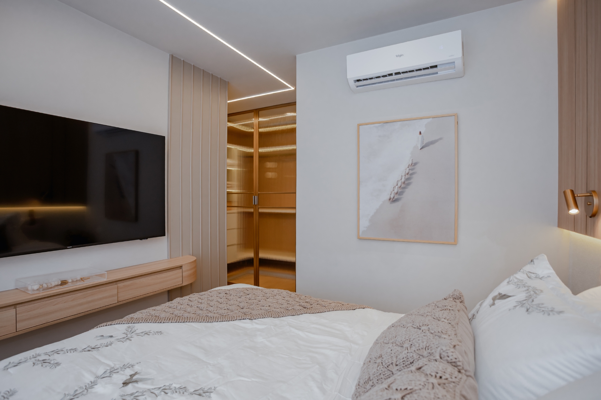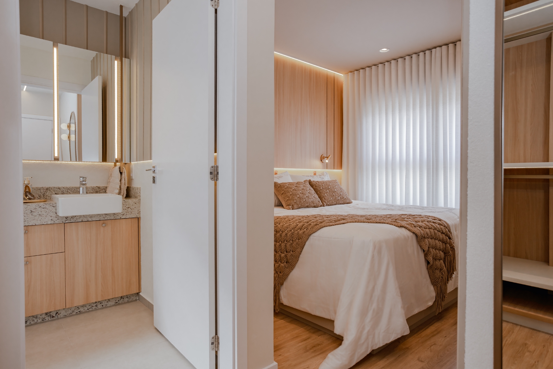 Como solução funcional, foi desenvolvido um painel giratório na área social, permitindo que a TV seja direcionada tanto para a sala quanto para a cozinha, atendendo aos diferentes momentos do dia com praticidade.