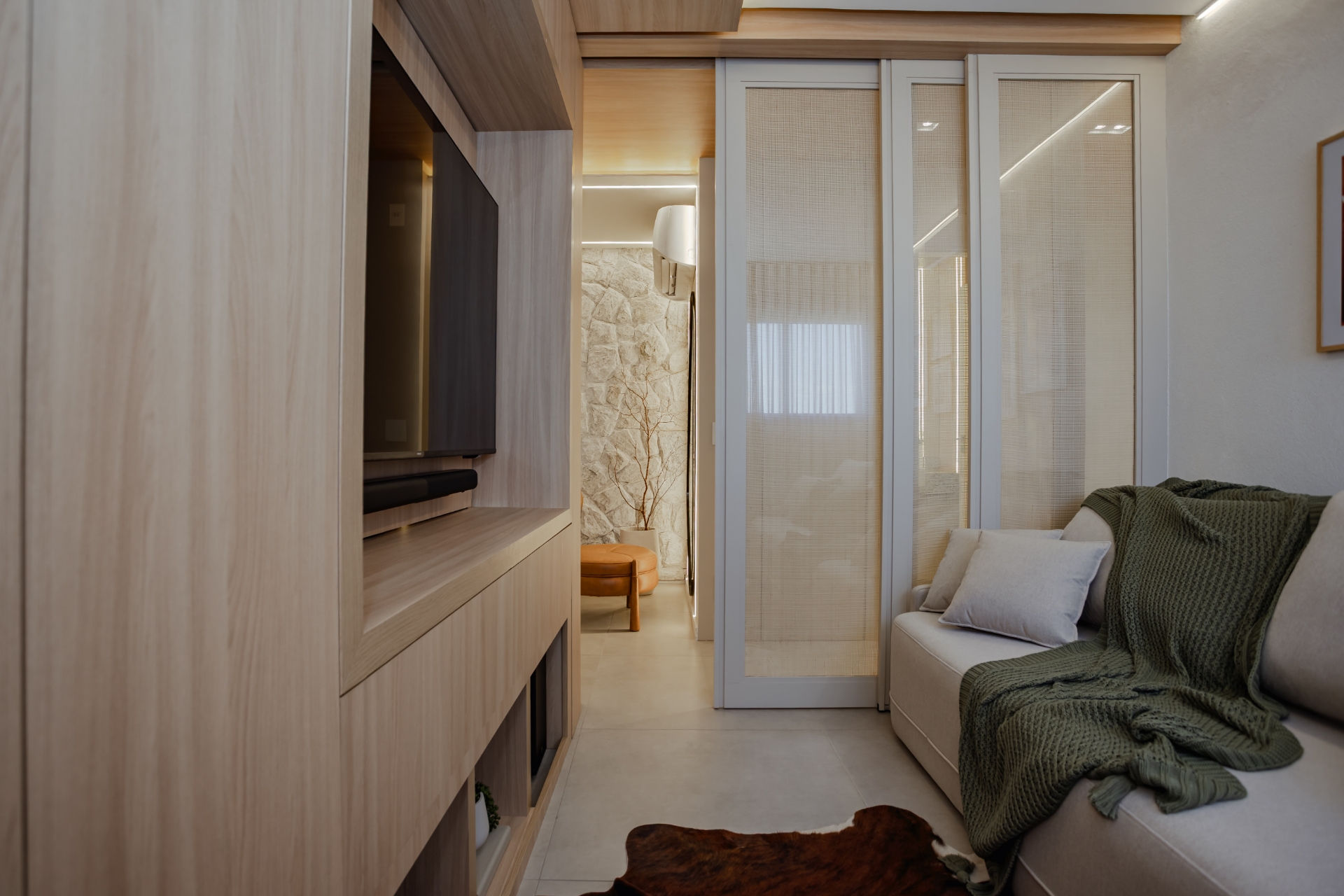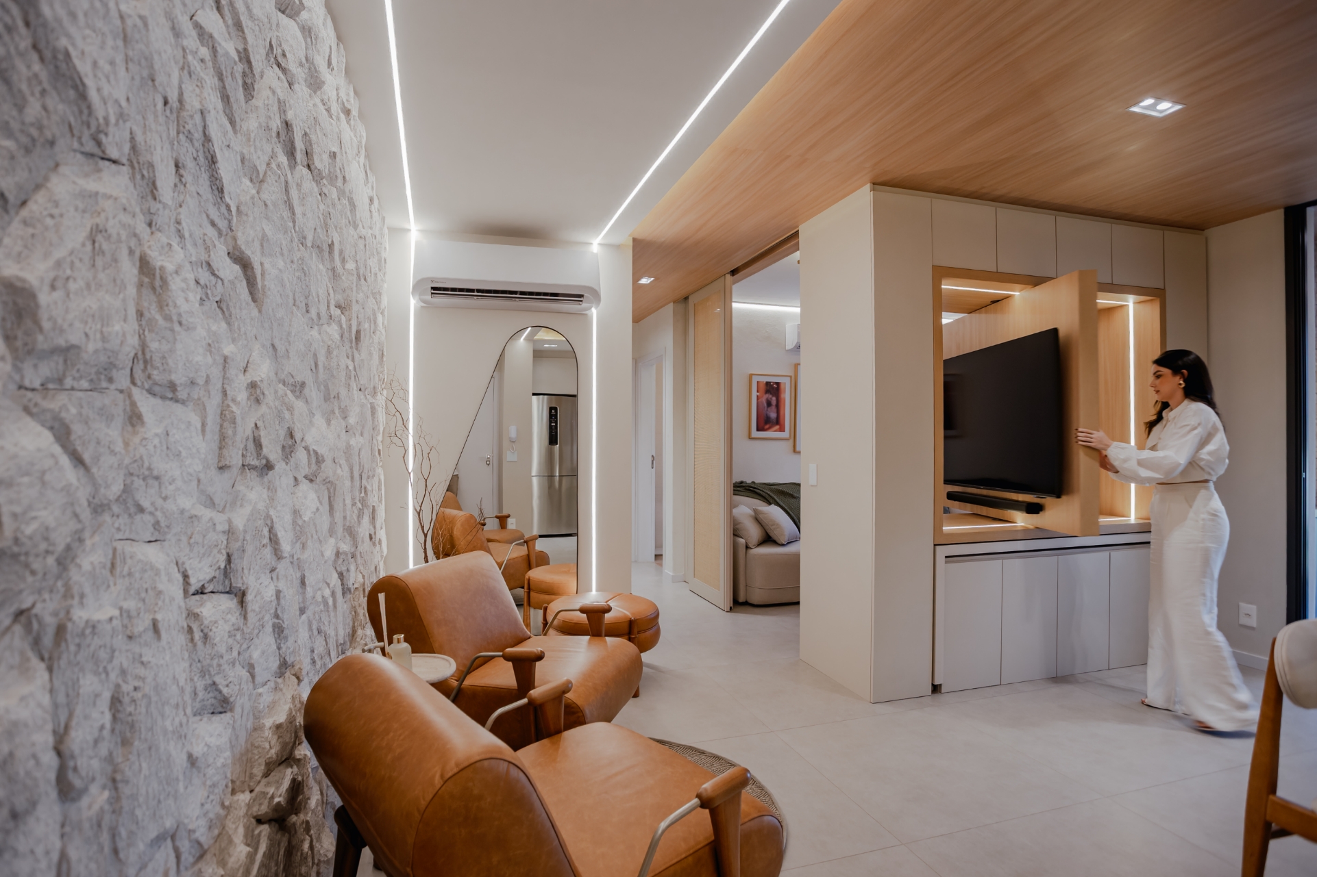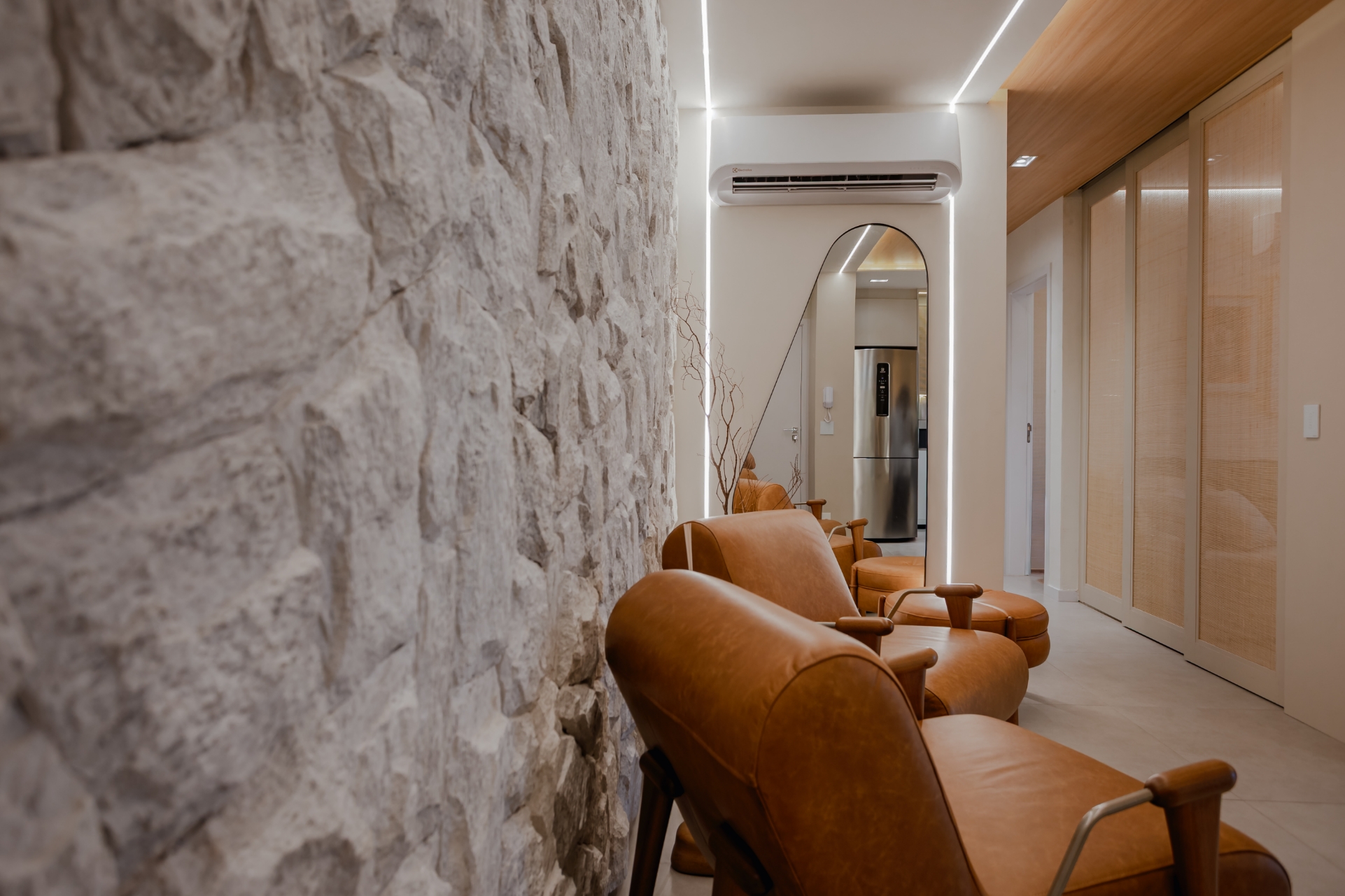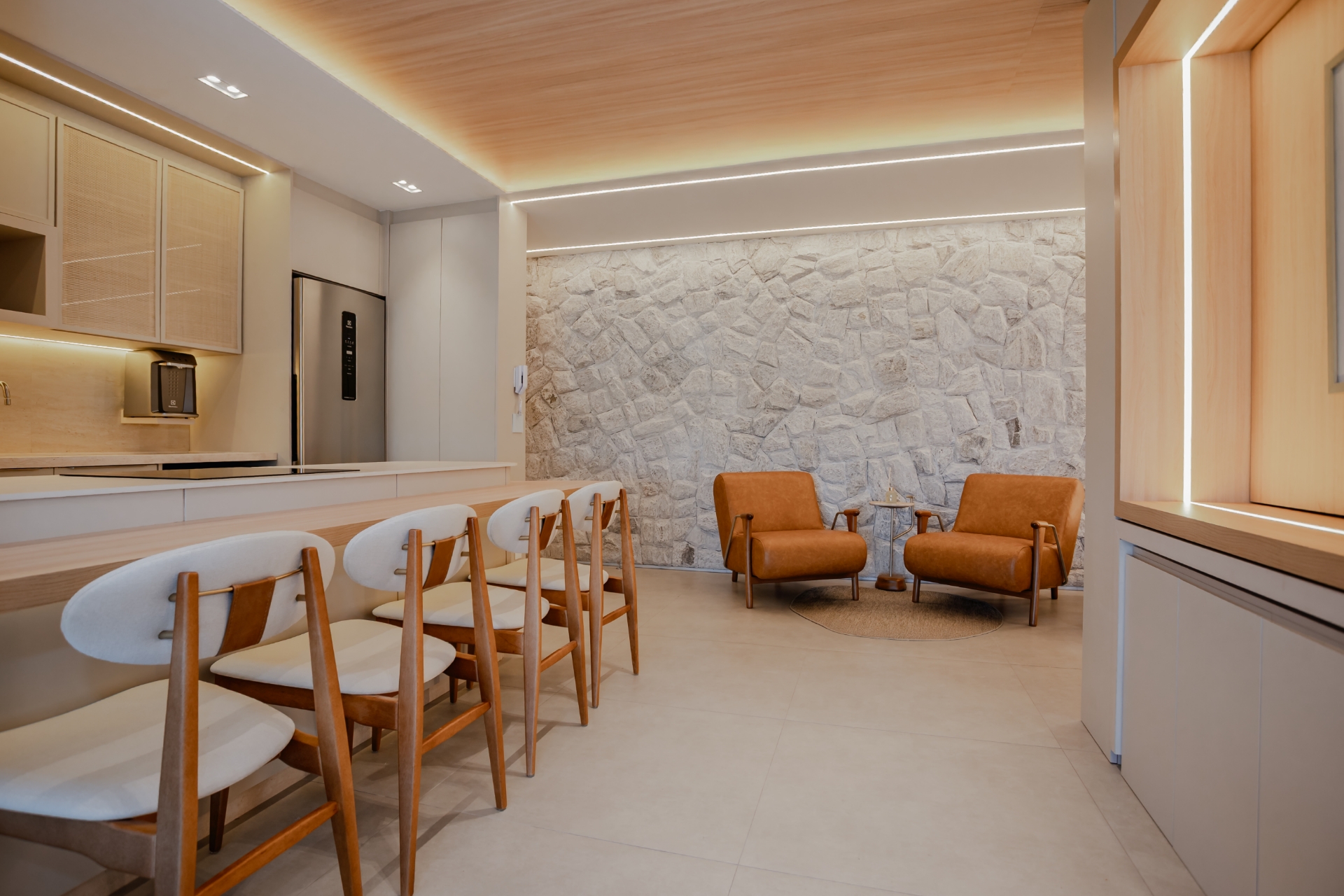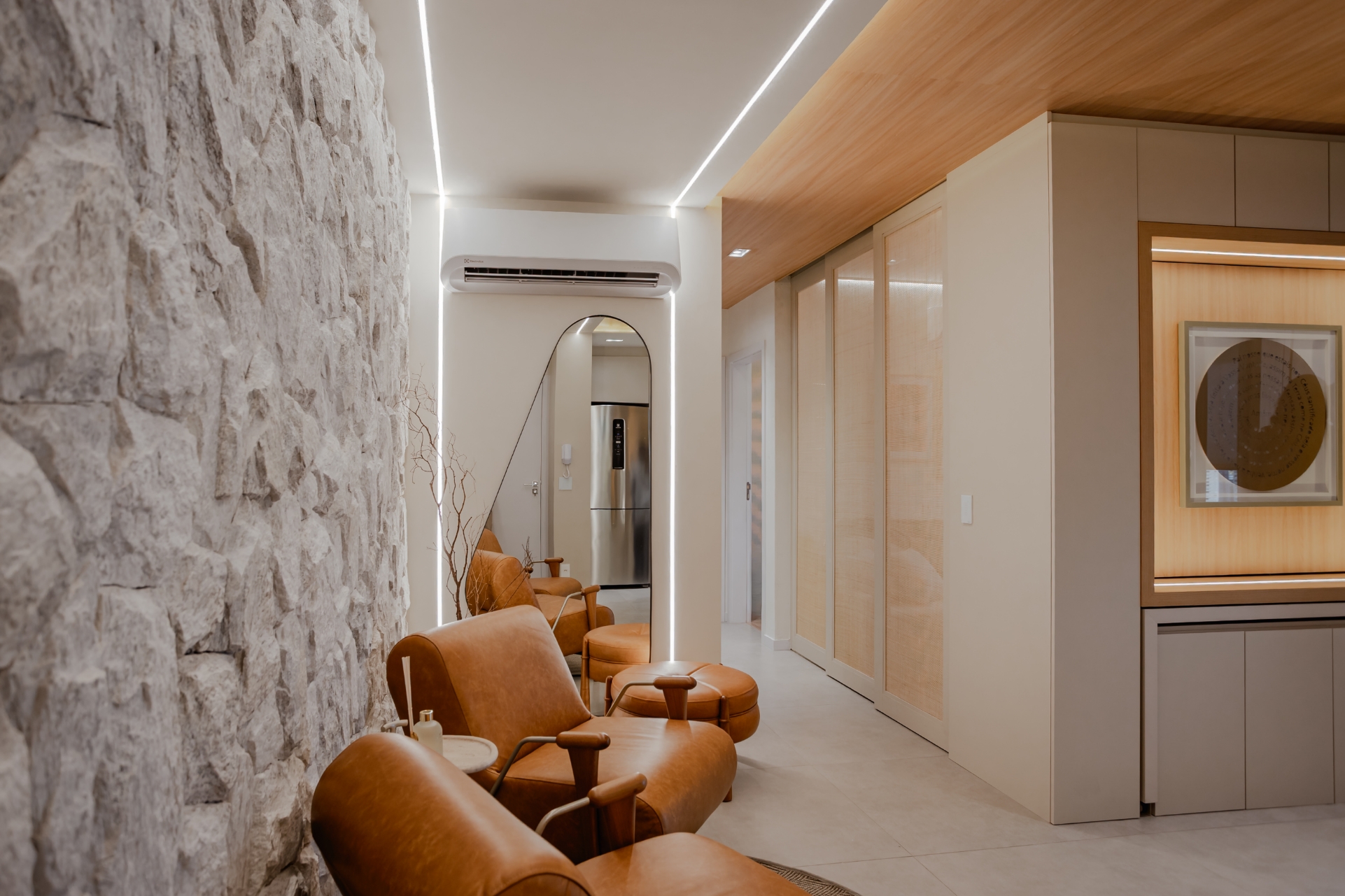 O Apartamento Refúgio nasce do desejo dos clientes de criar um verdadeiro espaço de acolhimento, onde seja possível relaxar e desfrutar de bons momentos com tranquilidade. Logo na entrada, o painel em pedra natural se destaca em contraste com as poltronas em couro, marcando a chegada ao apartamento com sofisticação. O forro em madeira complementa a proposta, reforçando a sensação de aconchego tão desejada pelos moradores.