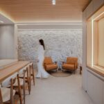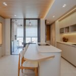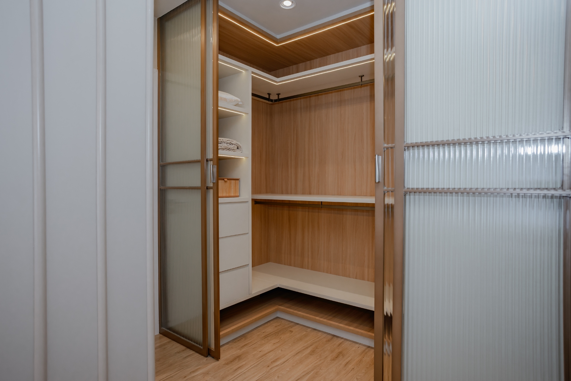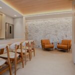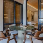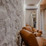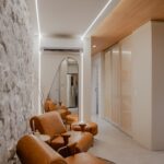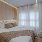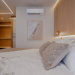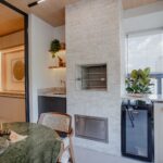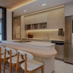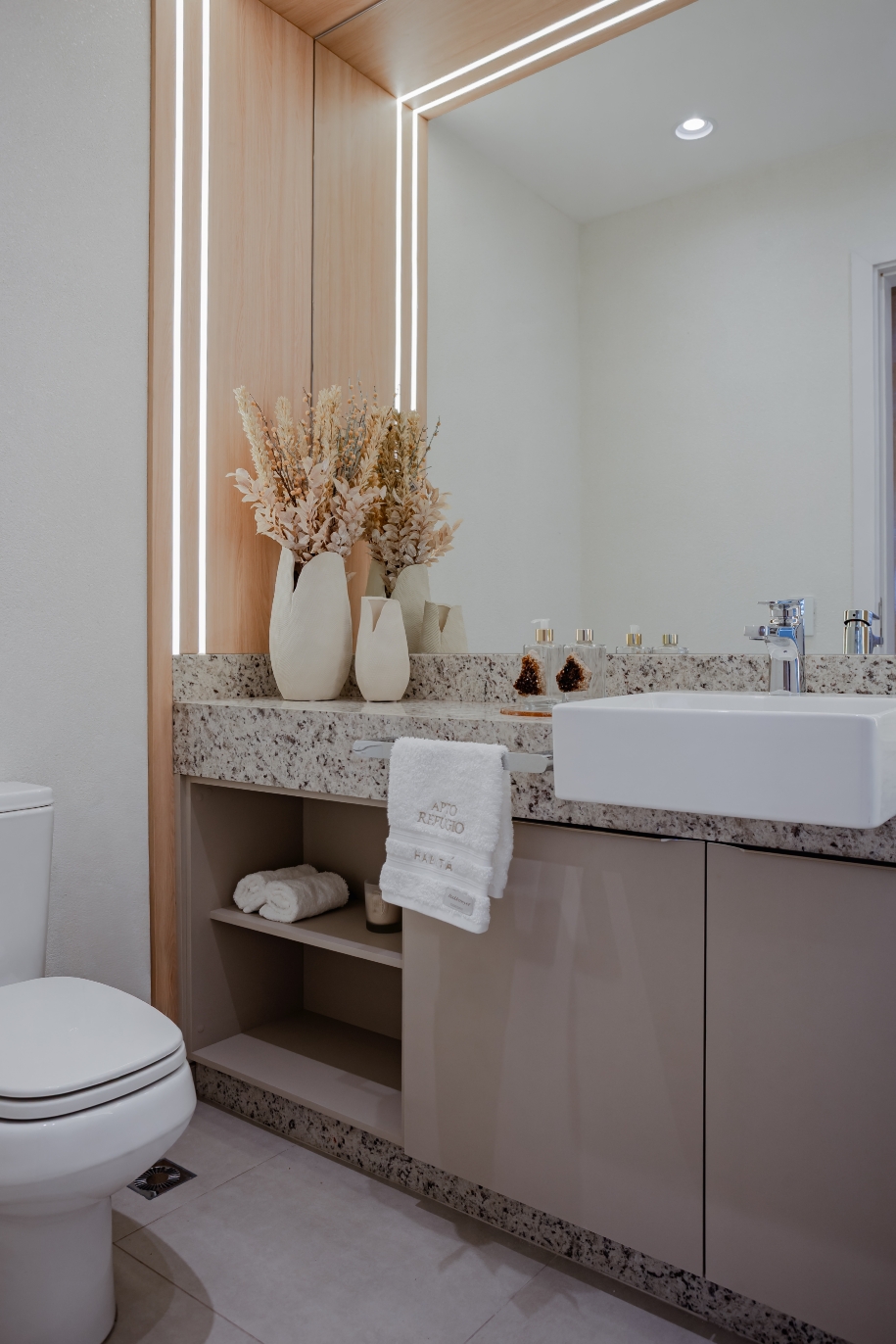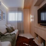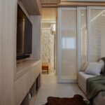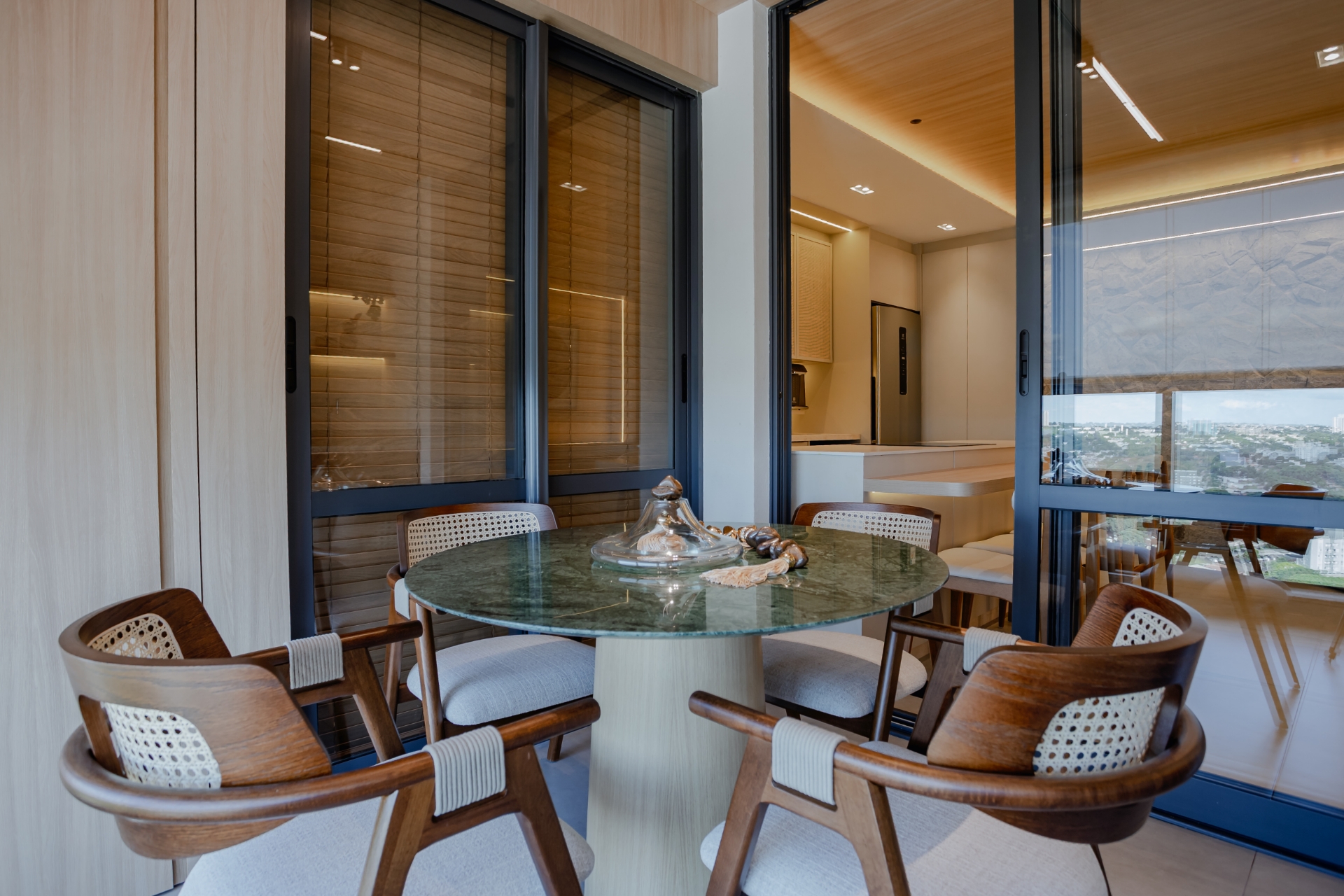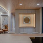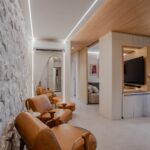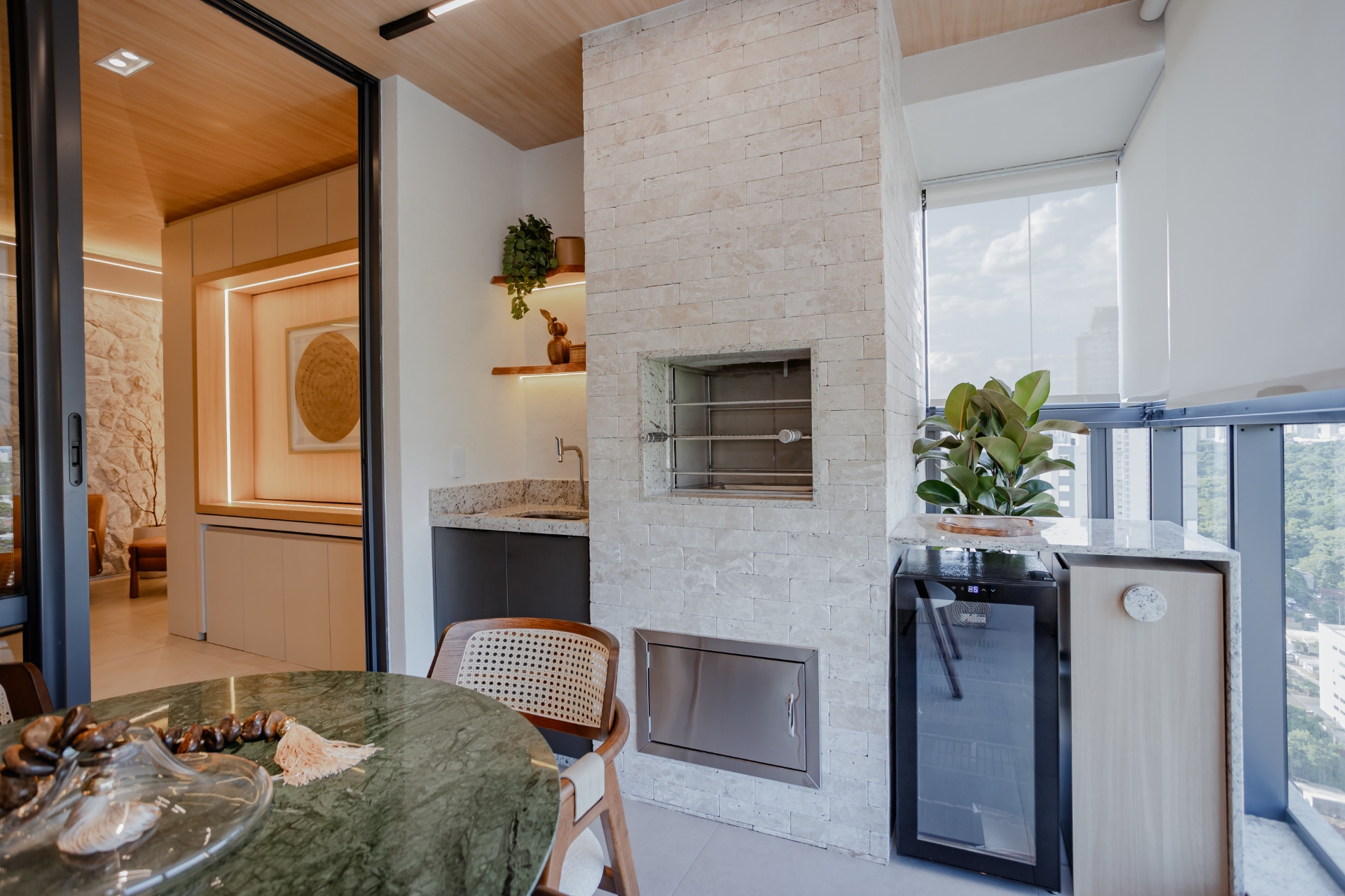 O Apartamento Refúgio nasce do desejo dos clientes de criar um verdadeiro espaço de acolhimento, onde seja possível relaxar e desfrutar de bons momentos com tranquilidade. Logo na entrada, o painel em pedra natural se destaca em contraste com as poltronas em couro, marcando a chegada ao apartamento com sofisticação. O forro em madeira complementa a proposta, reforçando a sensação de aconchego tão desejada pelos moradores.