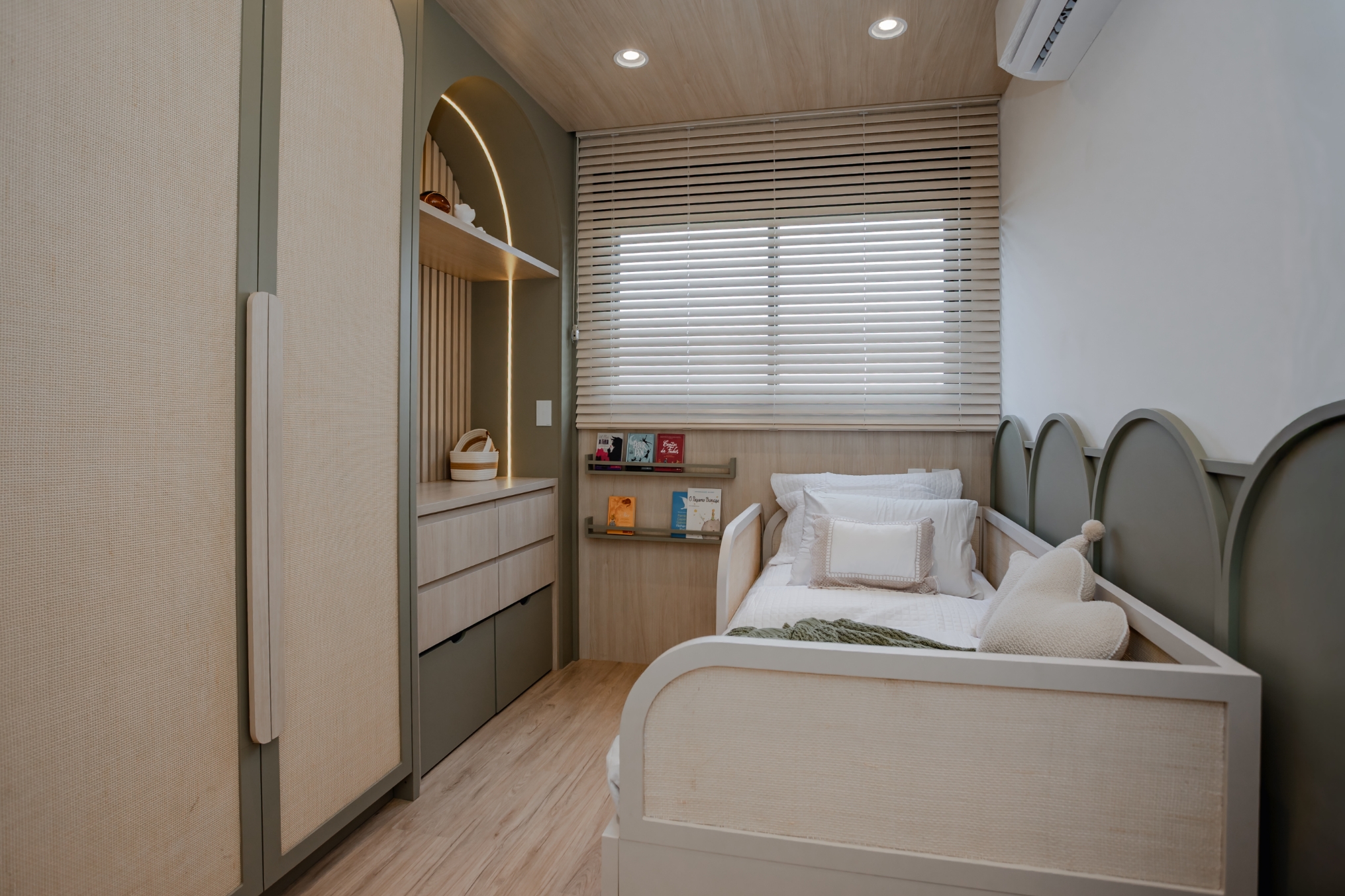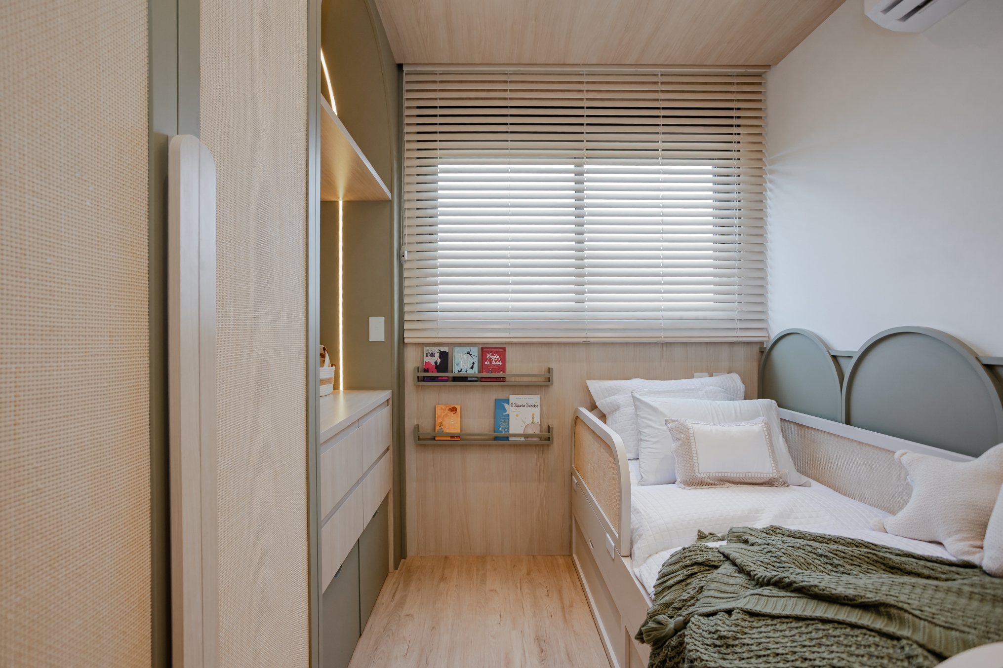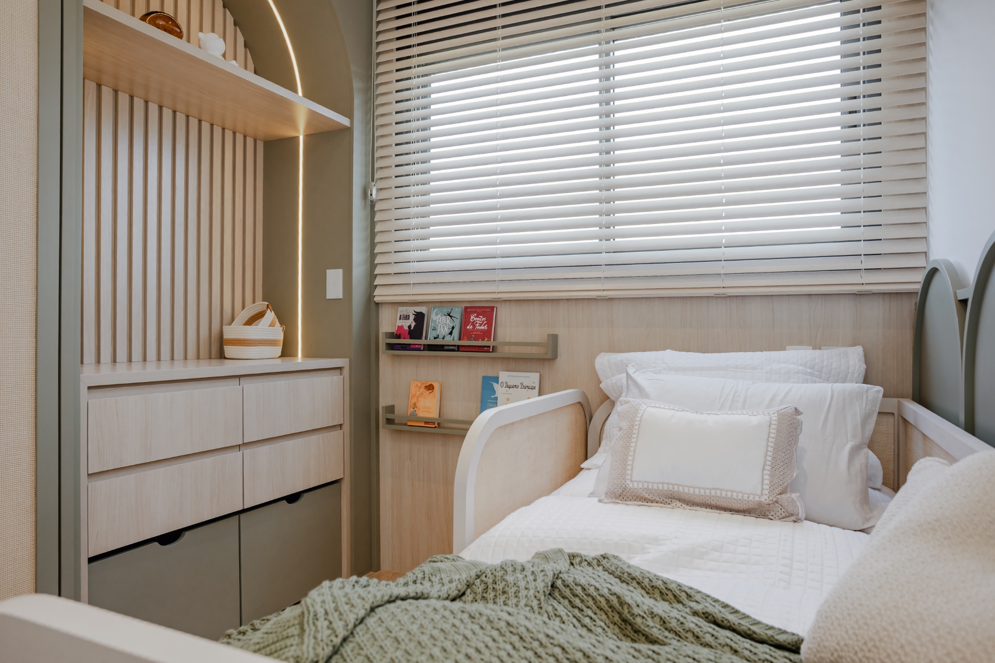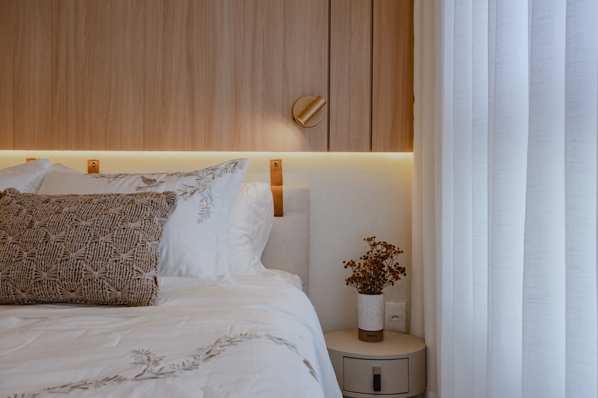 Em todo o projeto, predominam tons suaves e a presença delicada da palha, que contribuem para uma atmosfera serena e acolhedora.