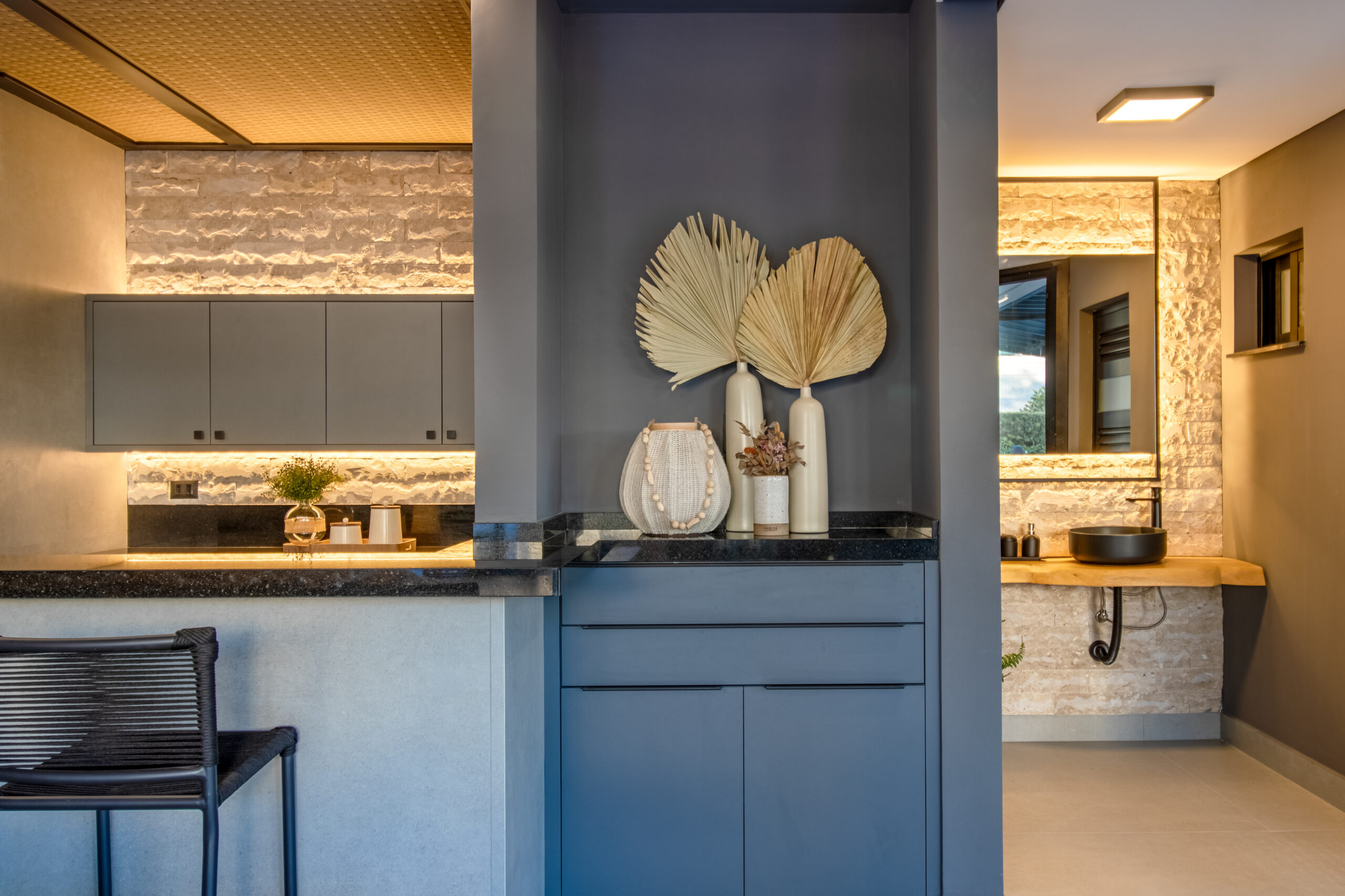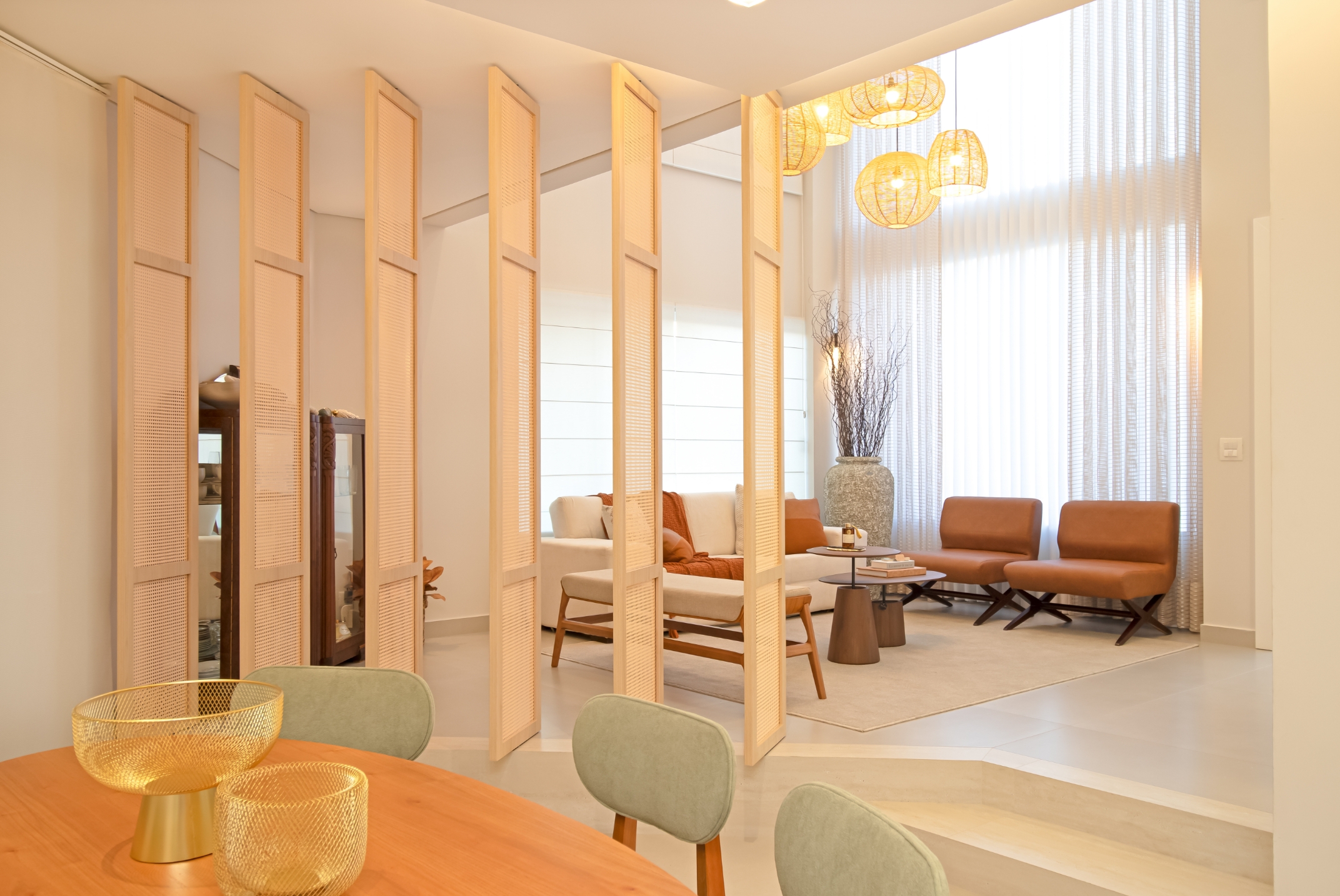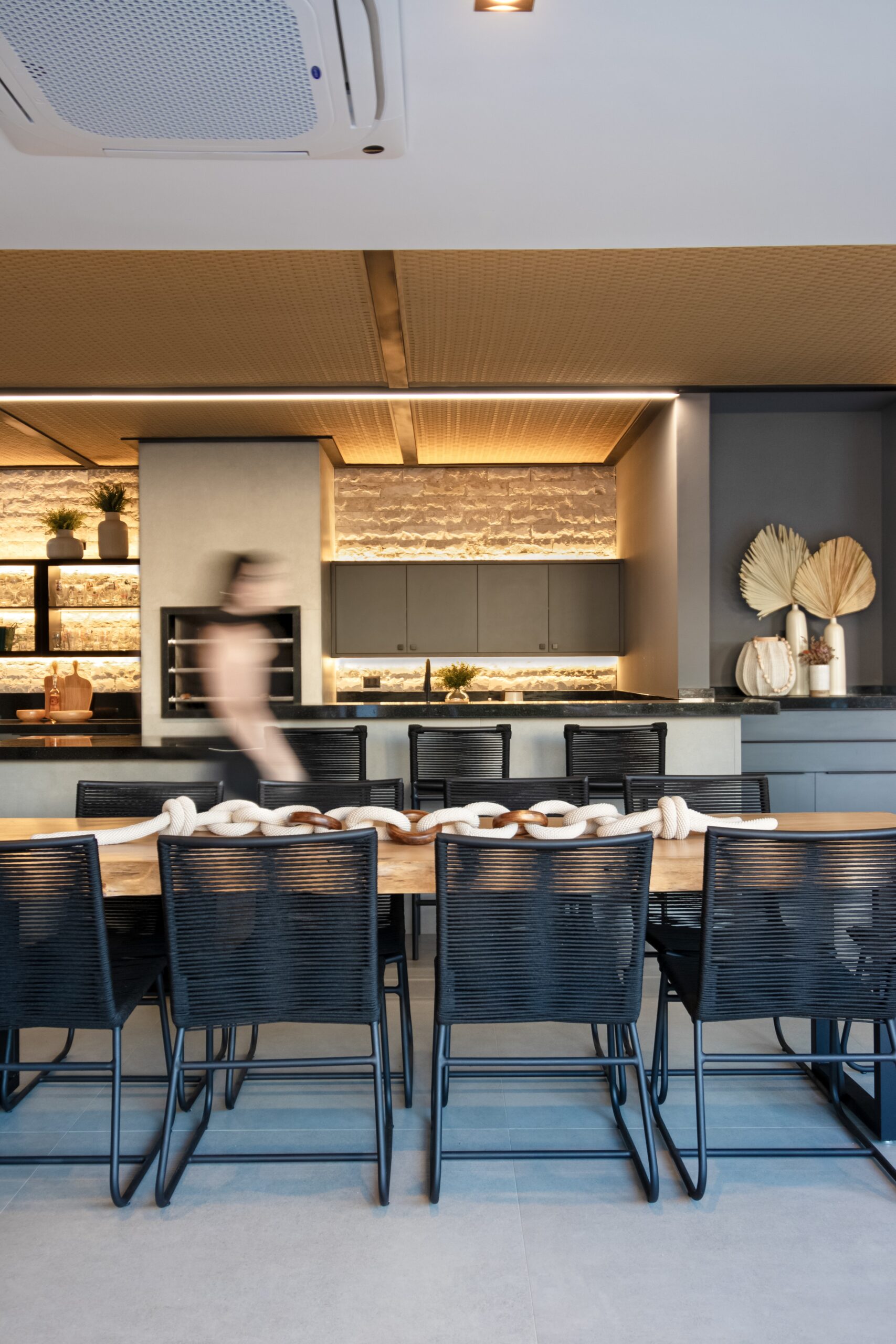Materiais naturais se fazem presentes em cada detalhe: na área externa, o charme rústico do tijolo travertino; na área interna, a delicadeza da palha indiana, que confere leveza e estabelece uma conexão fluida entre os ambientes.