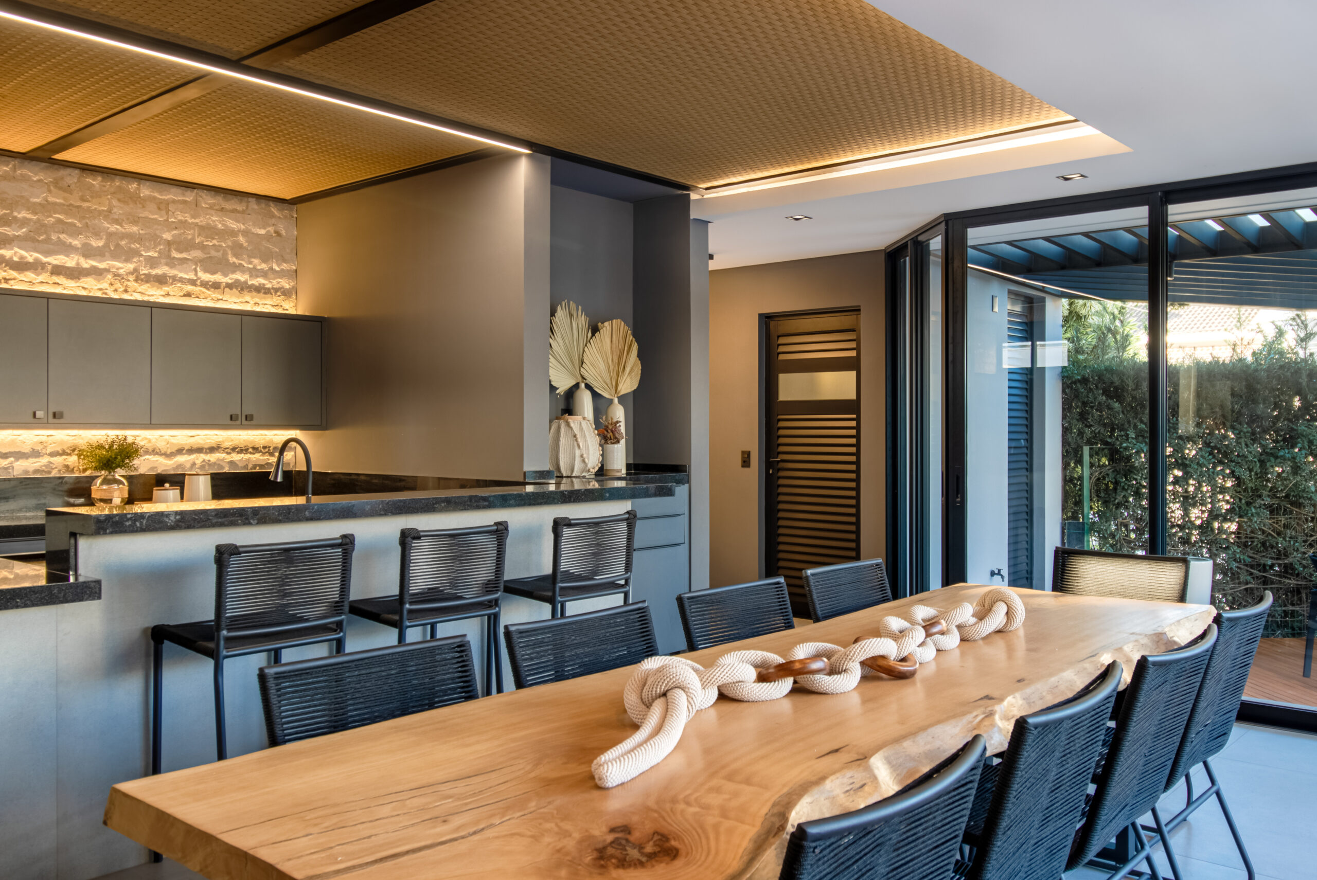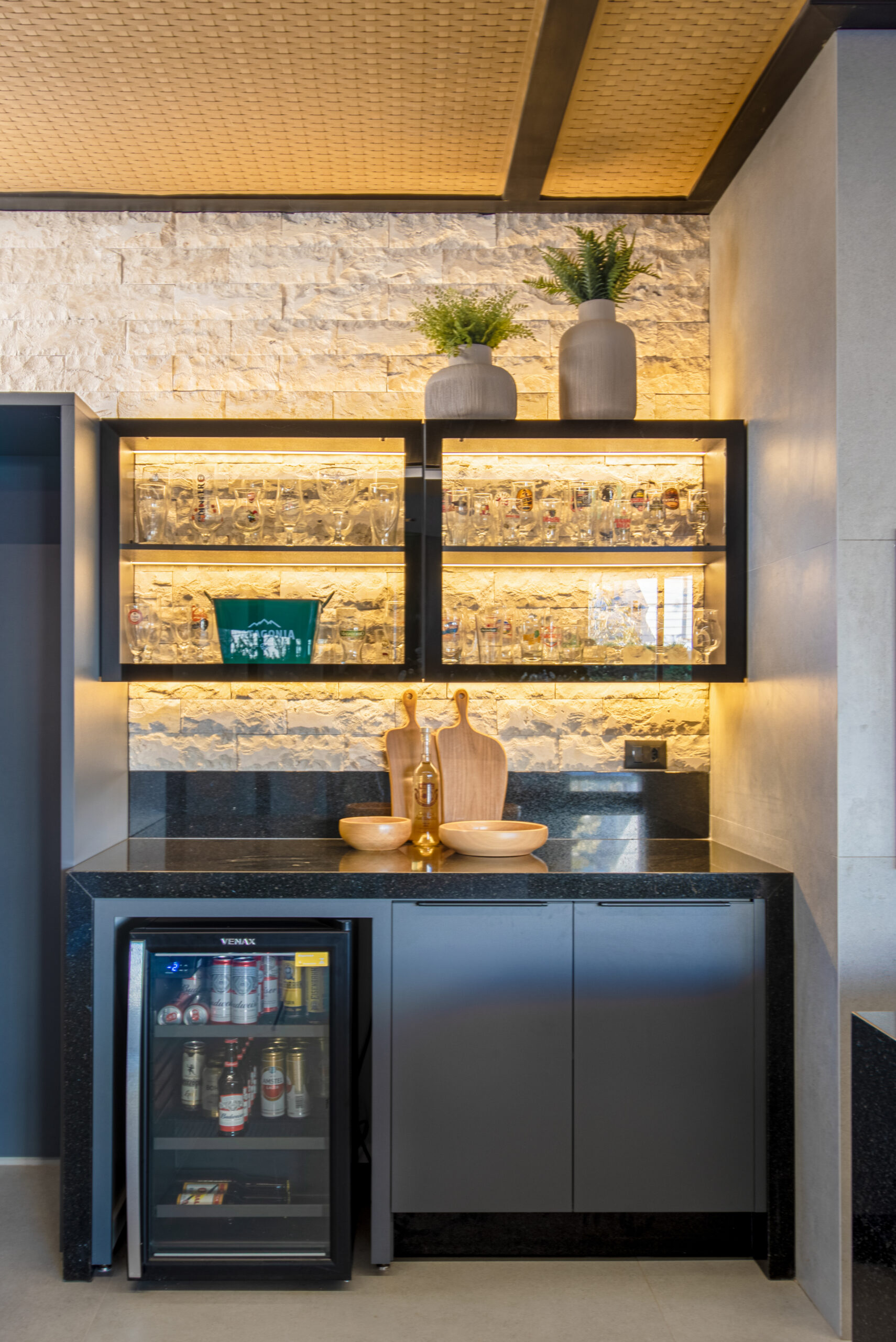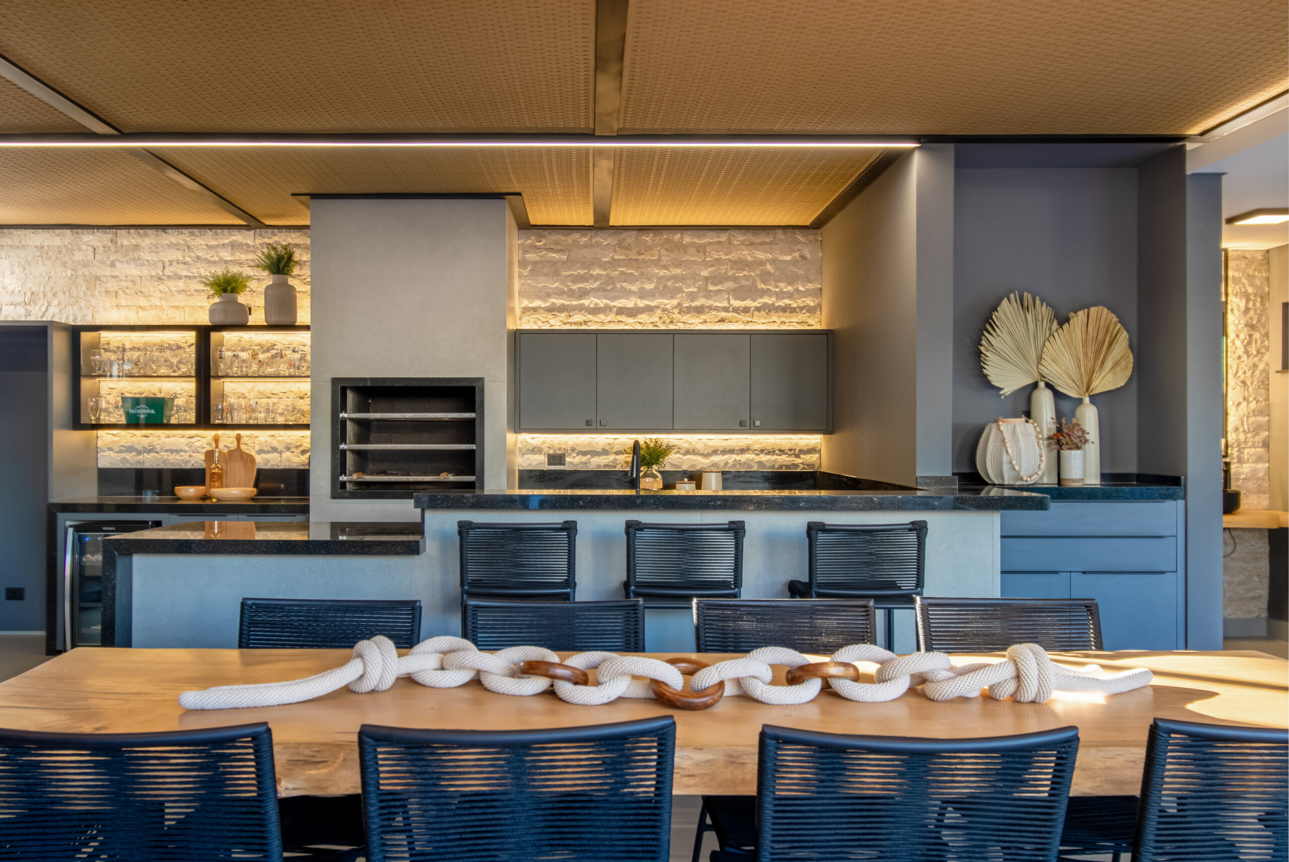 Os acabamentos em tons escuros e elementos amadeirados trazem elegância natural, enquanto a iluminação suave e quente cria uma atmosfera acolhedora, perfeita para momentos de convivência e relaxamento.