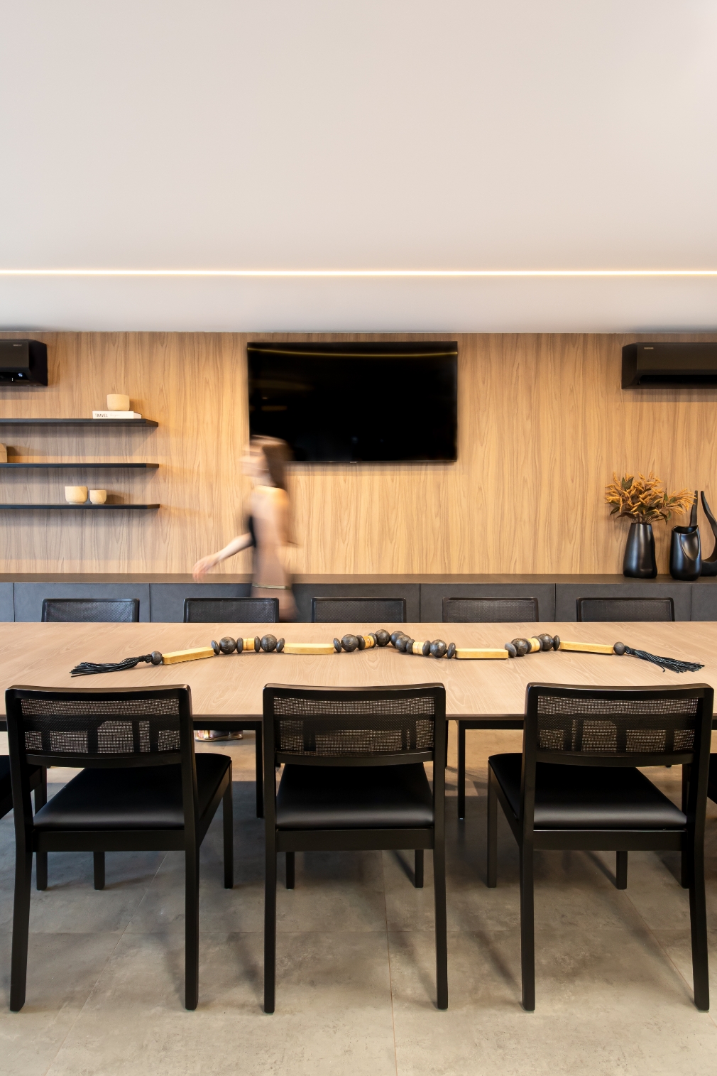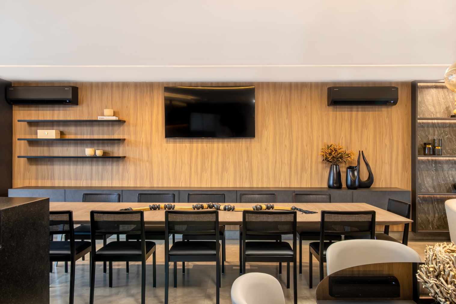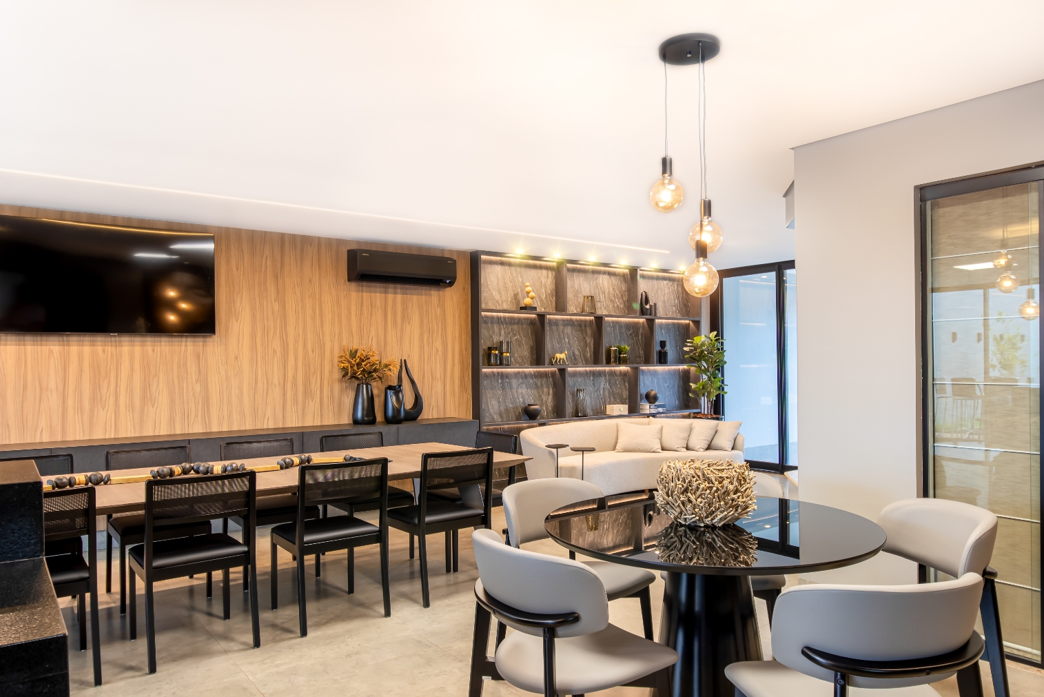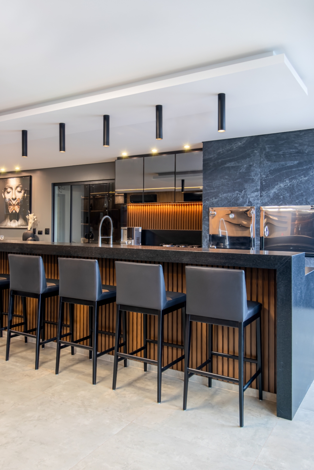 O Gourmet Ruiz nasceu para valorizar a experiência de receber, transformando a área em um verdadeiro convite à convivência e ao acolhimento. Os tons mais escuros e sóbrios definem a atmosfera sofisticada, criando um ambiente elegante e atemporal.