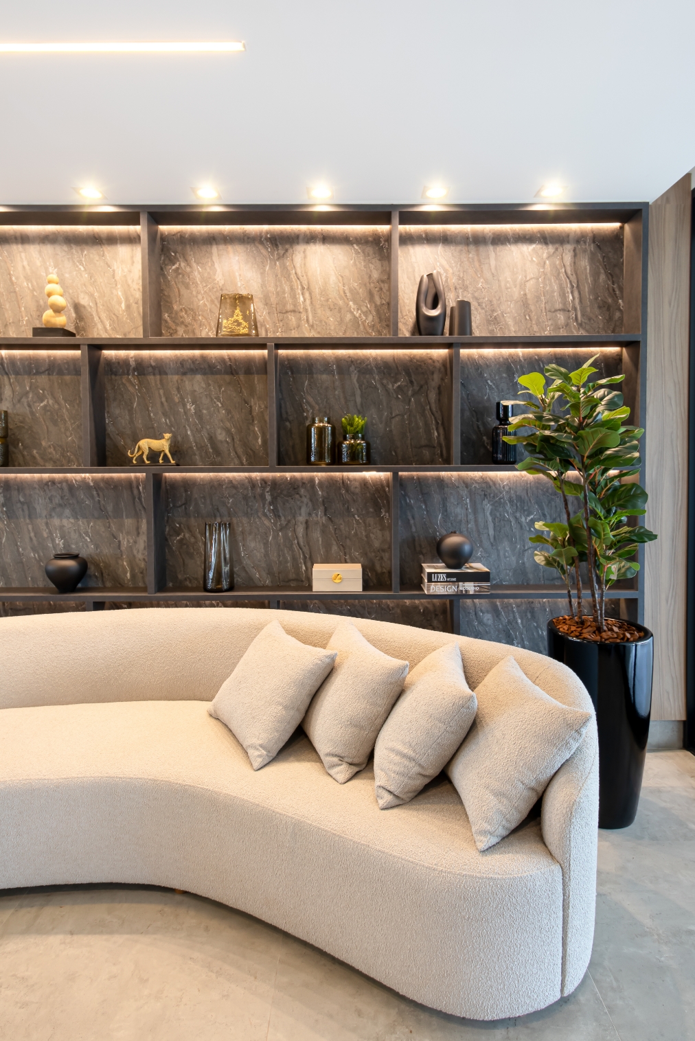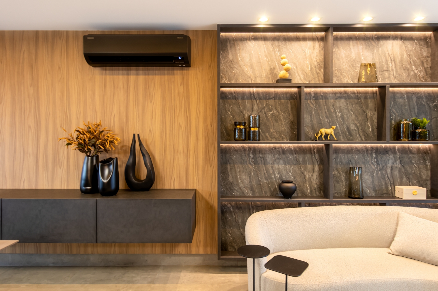O painel de TV ganhou uma extensão com estante decorativa, que emoldura o espaço e se integra ao sofá de estar posicionado logo atrás. Ali, momentos de conversa e descontração encontram o cenário ideal, entre o conforto e a sofisticação do design.
