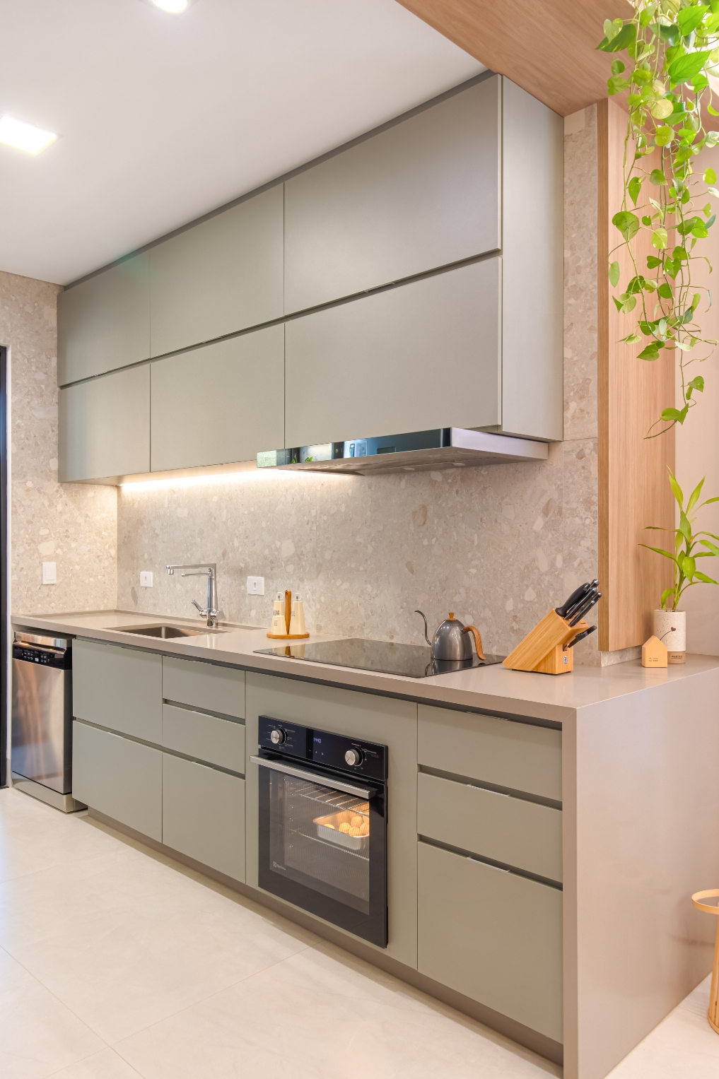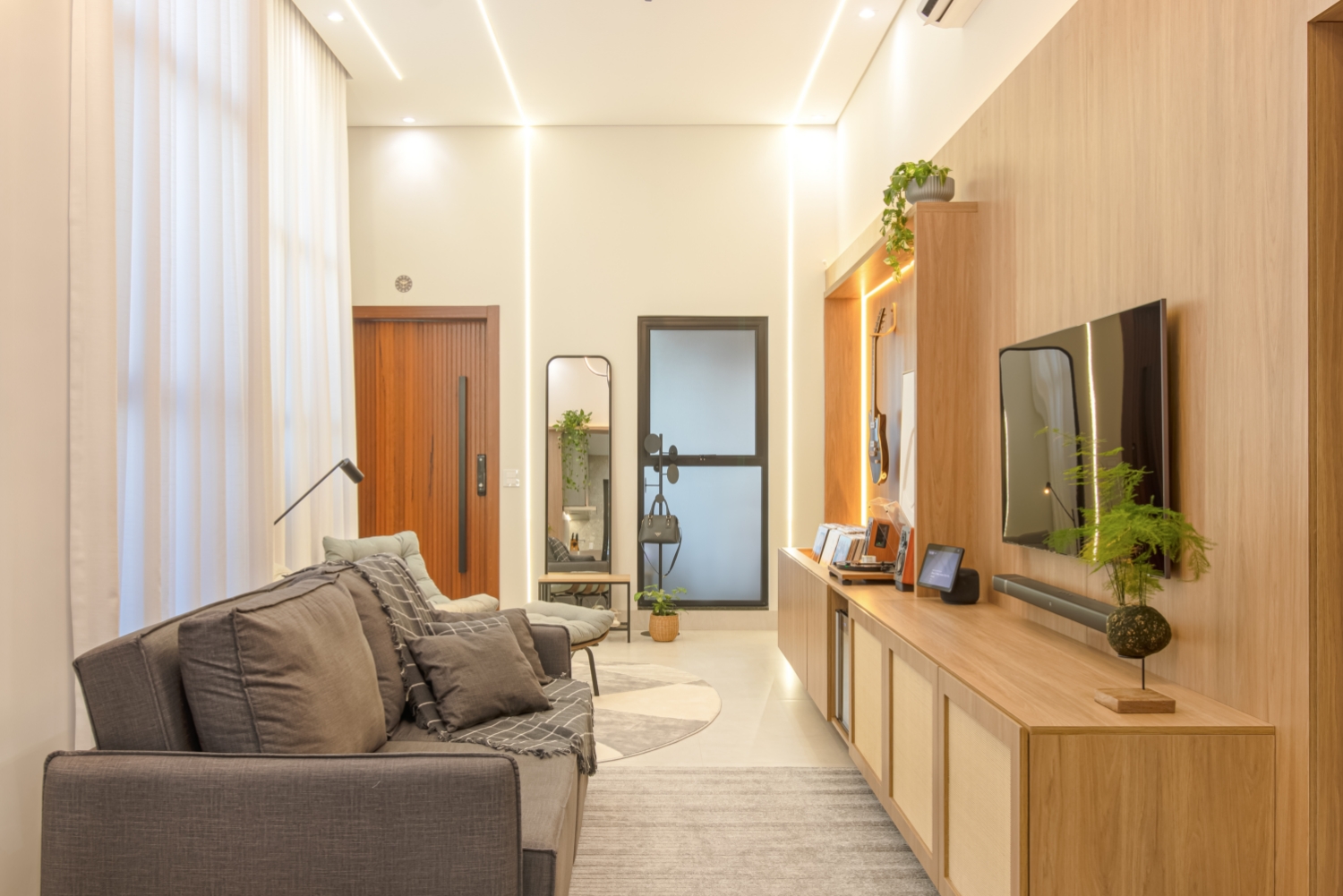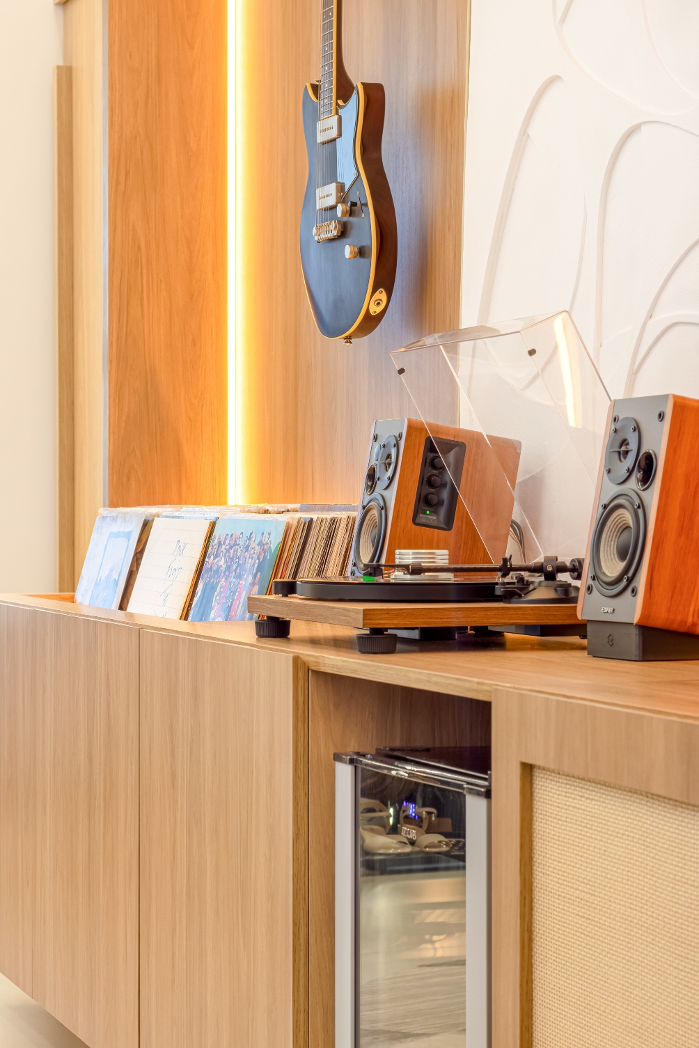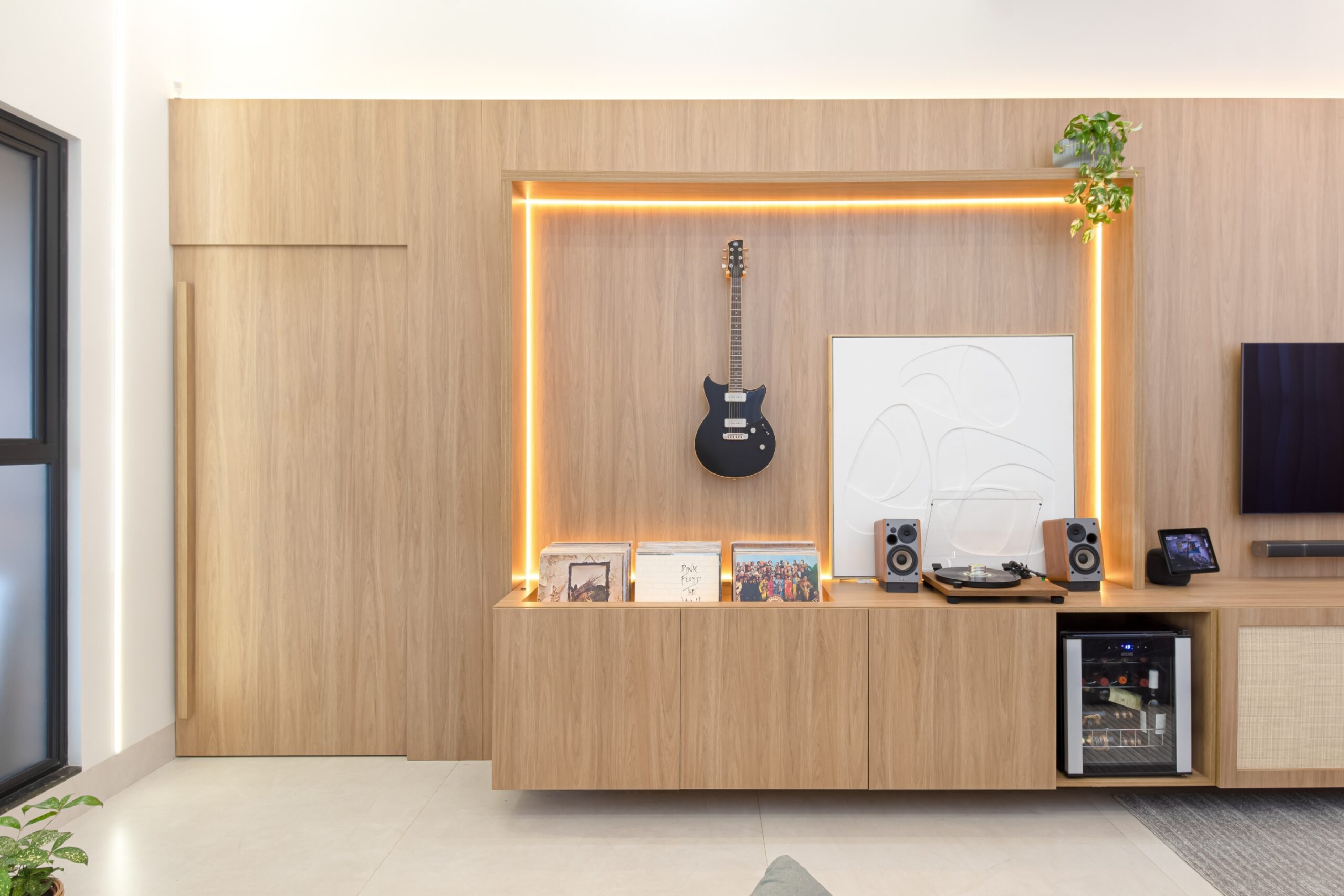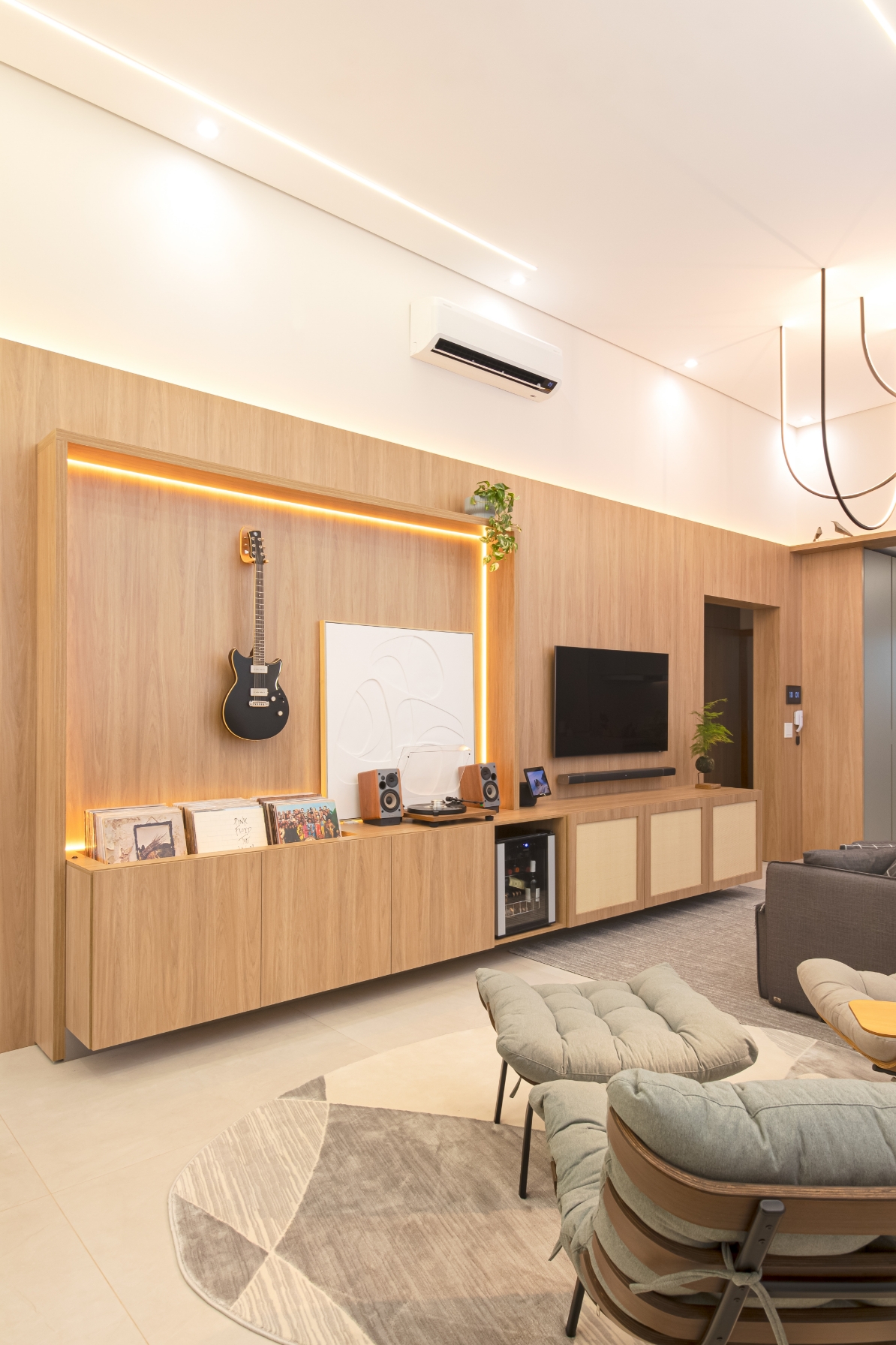Na sala de estar, o protagonismo é da vitrola e da coleção de discos de vinil, cuidadosamente acomodados em um móvel projetado especialmente para esse fim. Ali, poltronas confortáveis convidam a momentos de pausa, onde o som e a atmosfera se unem em perfeita harmonia.