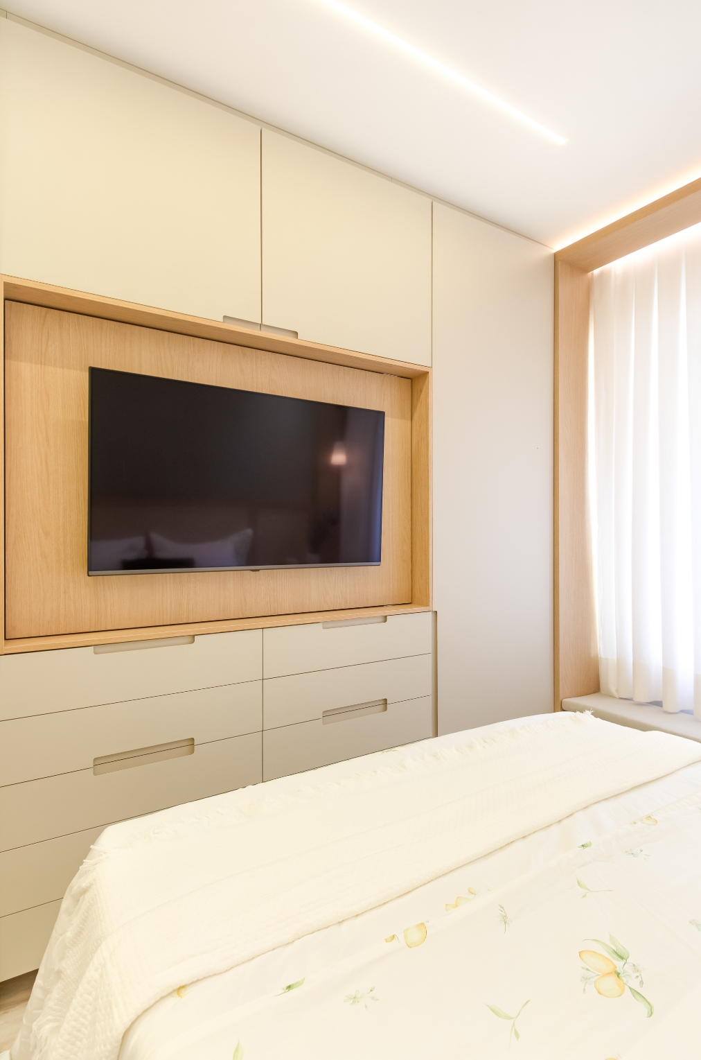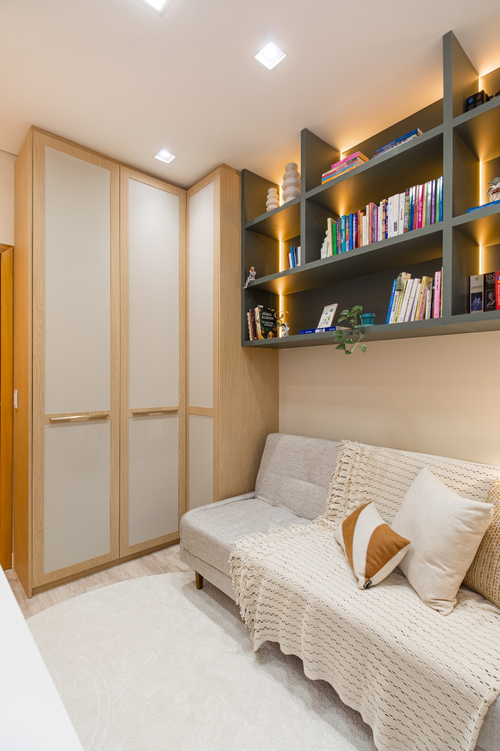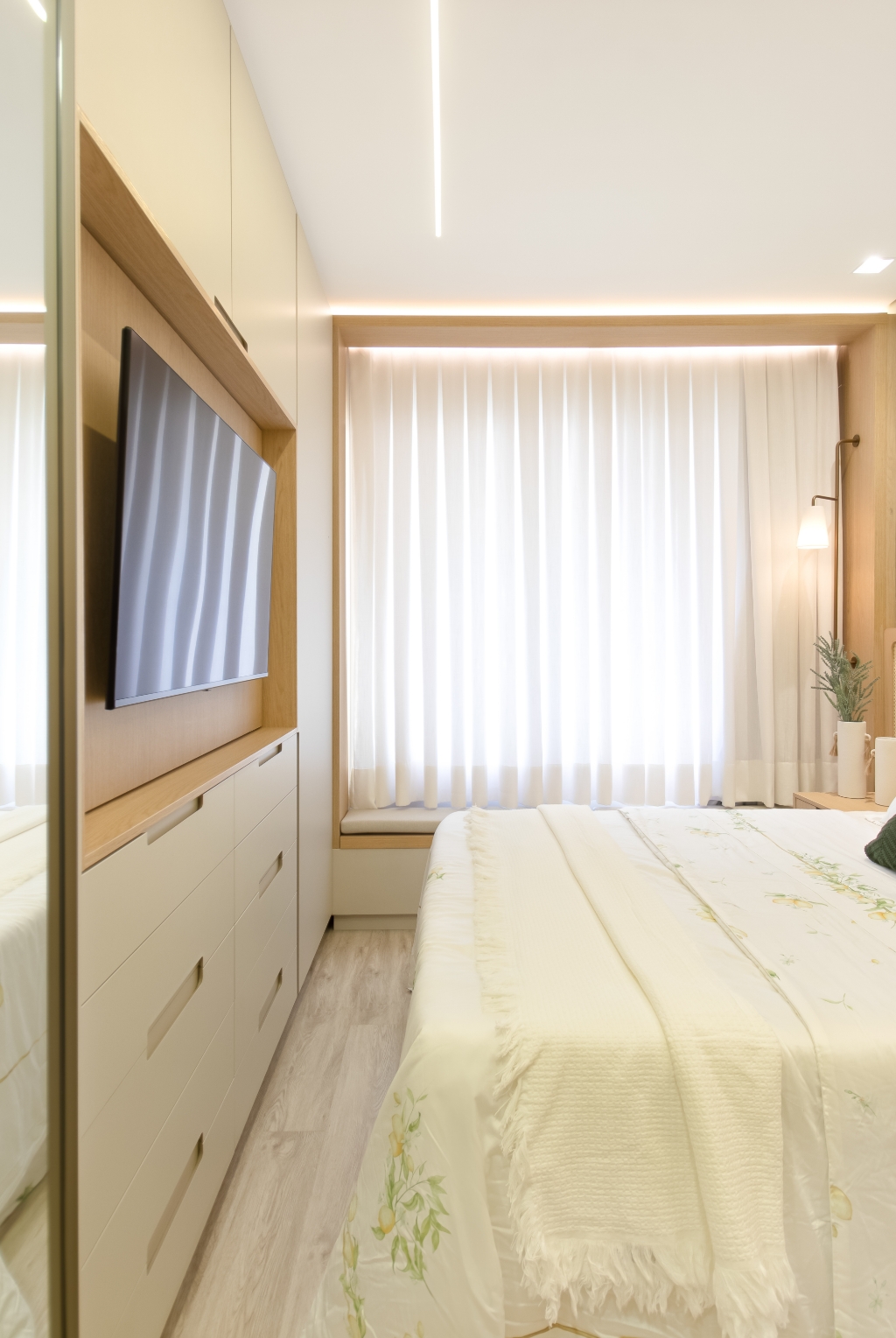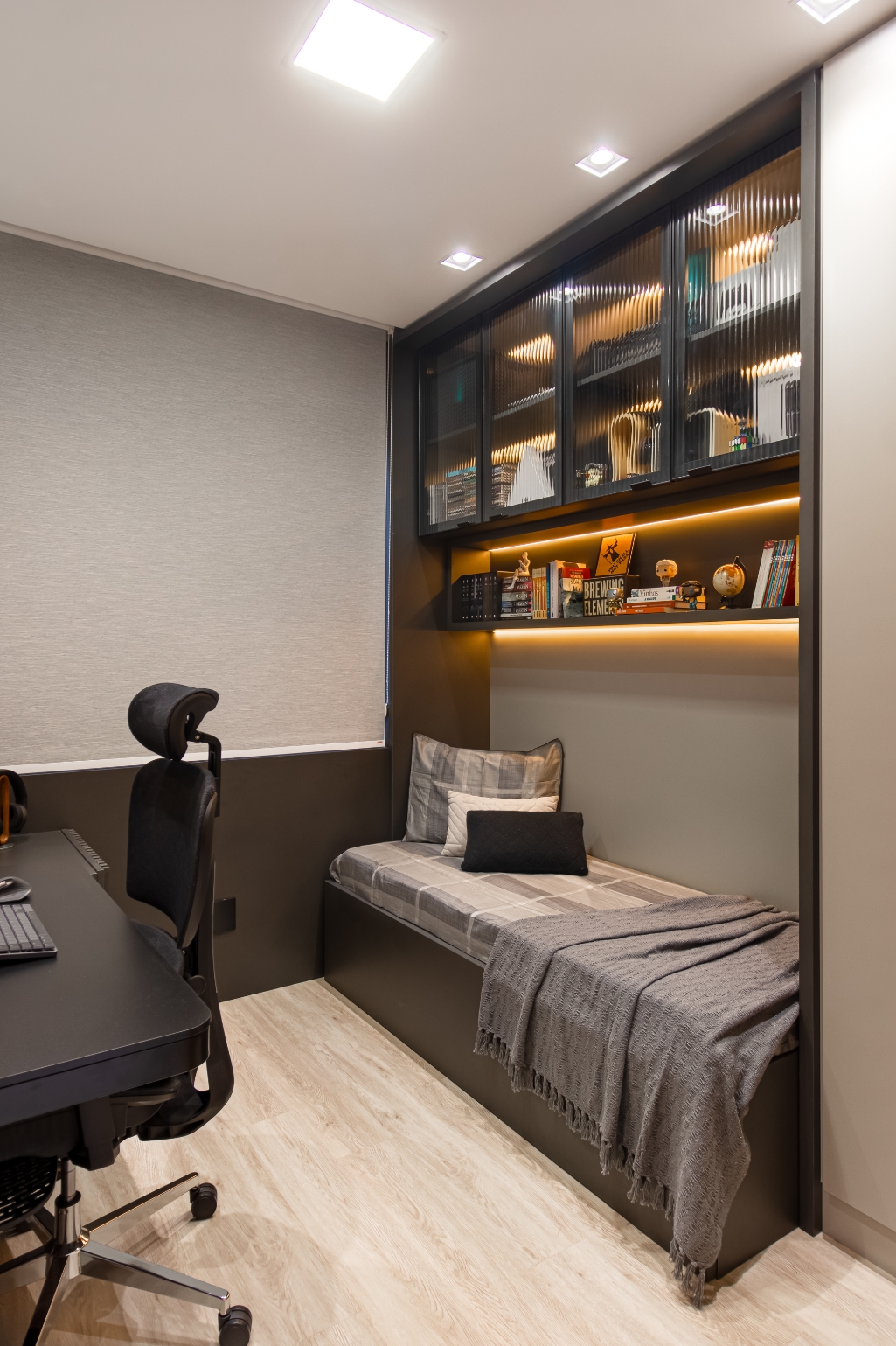 Nos quartos, cada detalhe foi pensado para atender às necessidades individuais do casal: um home office em tons mais sóbrios e escuros traduz a personalidade dele, enquanto outro, em nuances claras e suaves, expressa delicadeza e leveza para ela.