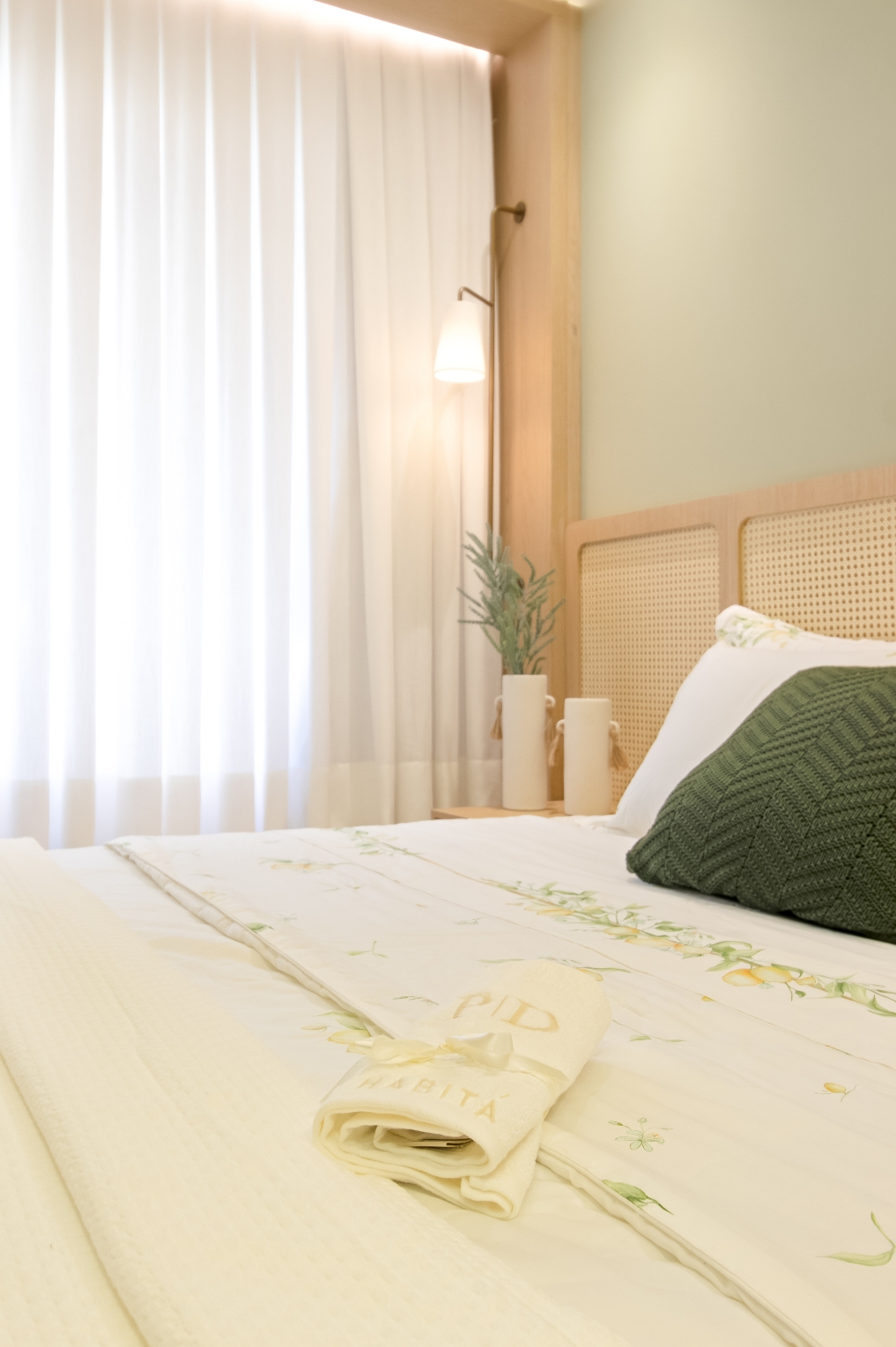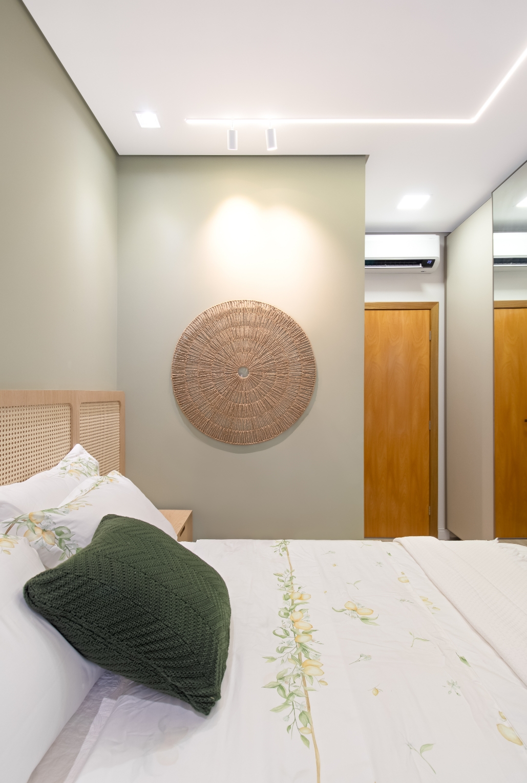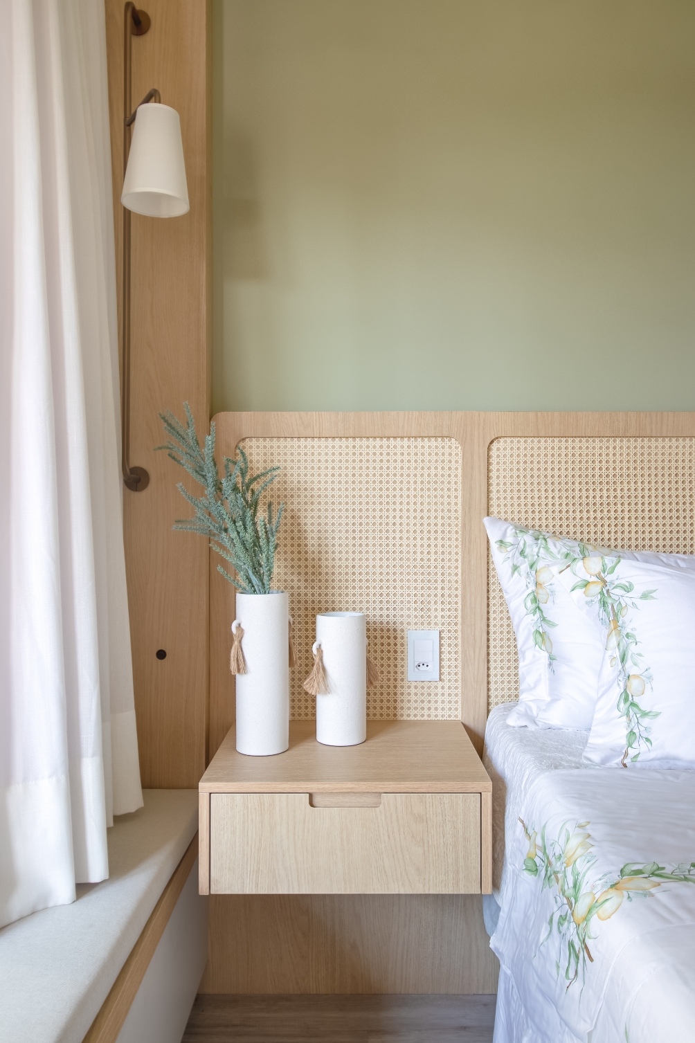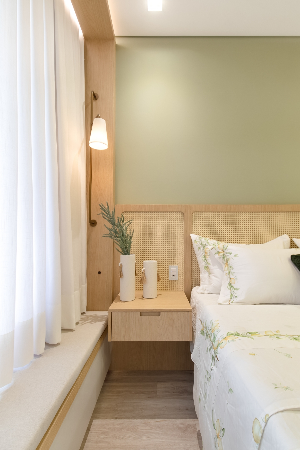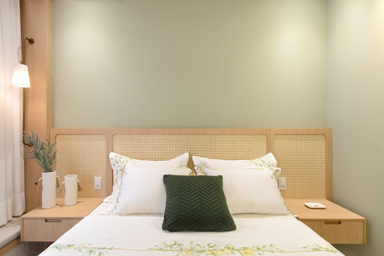 Na suíte, a paleta em verde claro combinada à palha natural cria um refúgio aconchegante, com atmosfera calma e intimista, revelando a verdadeira essência de um lar.