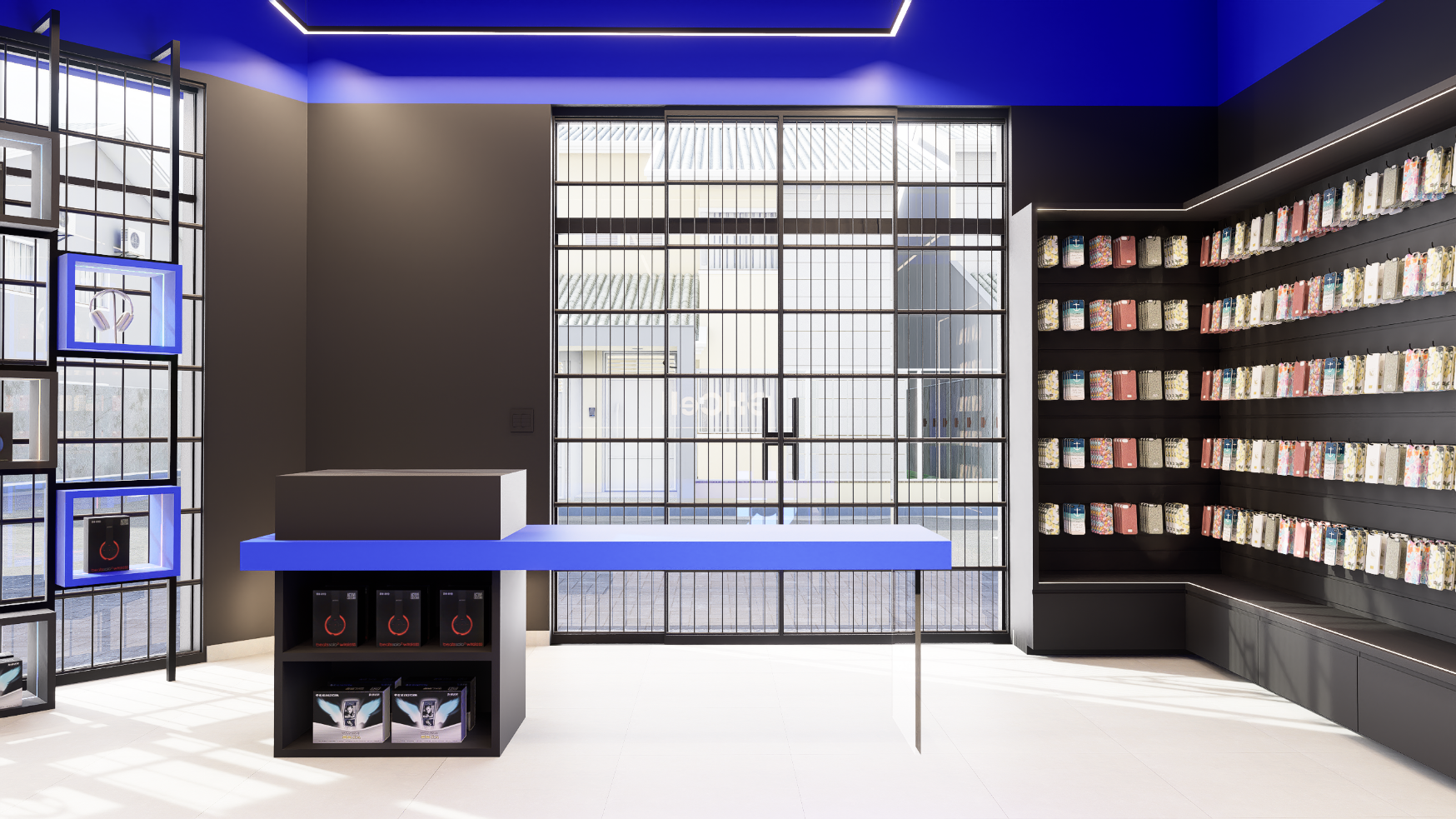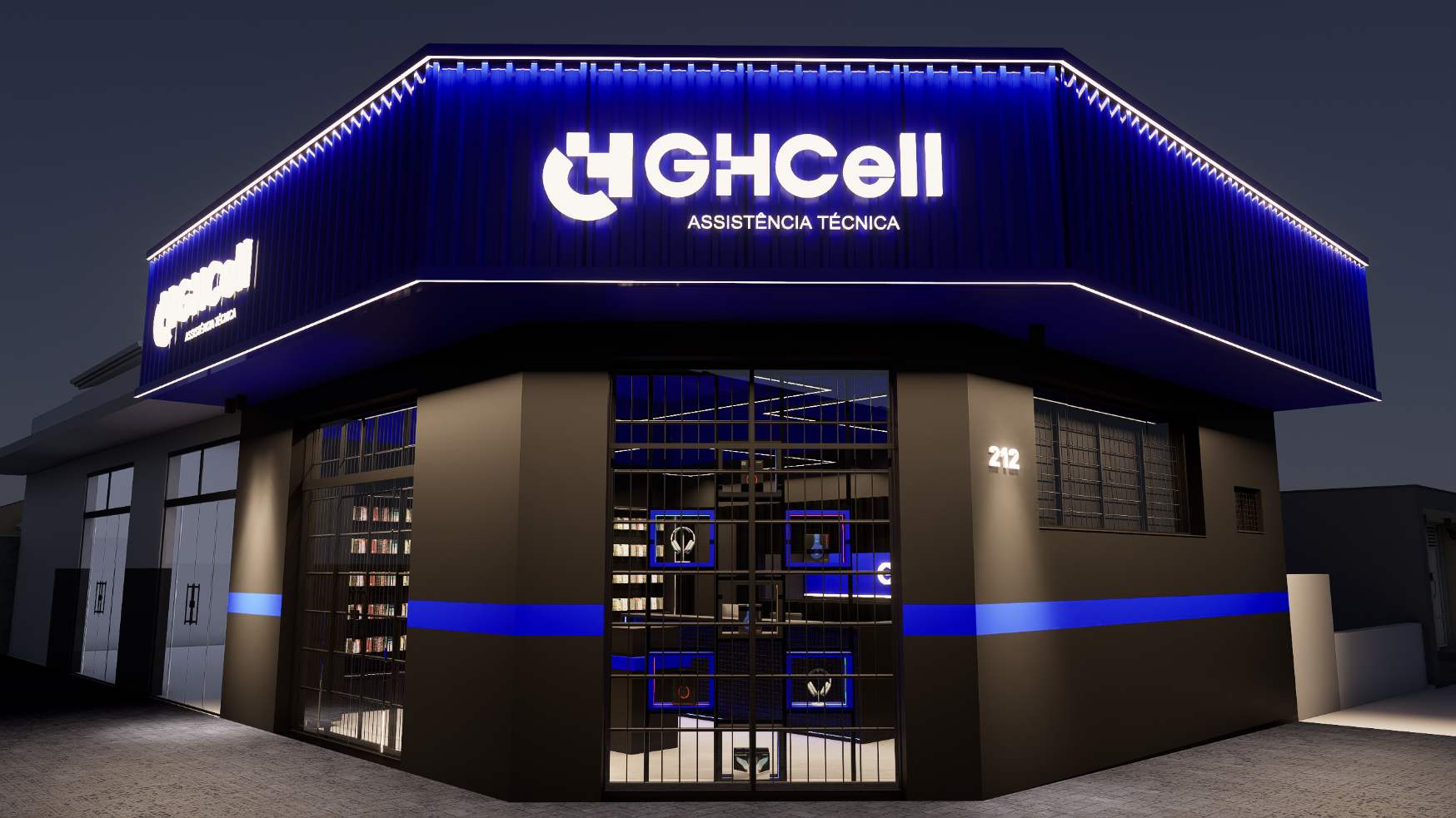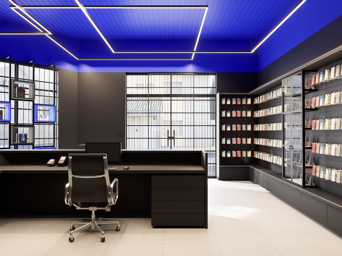Com uma área de 50 m², o layout foi cuidadosamente planejado para otimizar a circulação, valorizar os produtos e criar uma relação direta entre cliente e exposição. A paleta de cores parte dos tons de azul e preto presentes na identidade visual da GHCELL, reforçando o reconhecimento da marca e transmitindo modernidade e credibilidade.