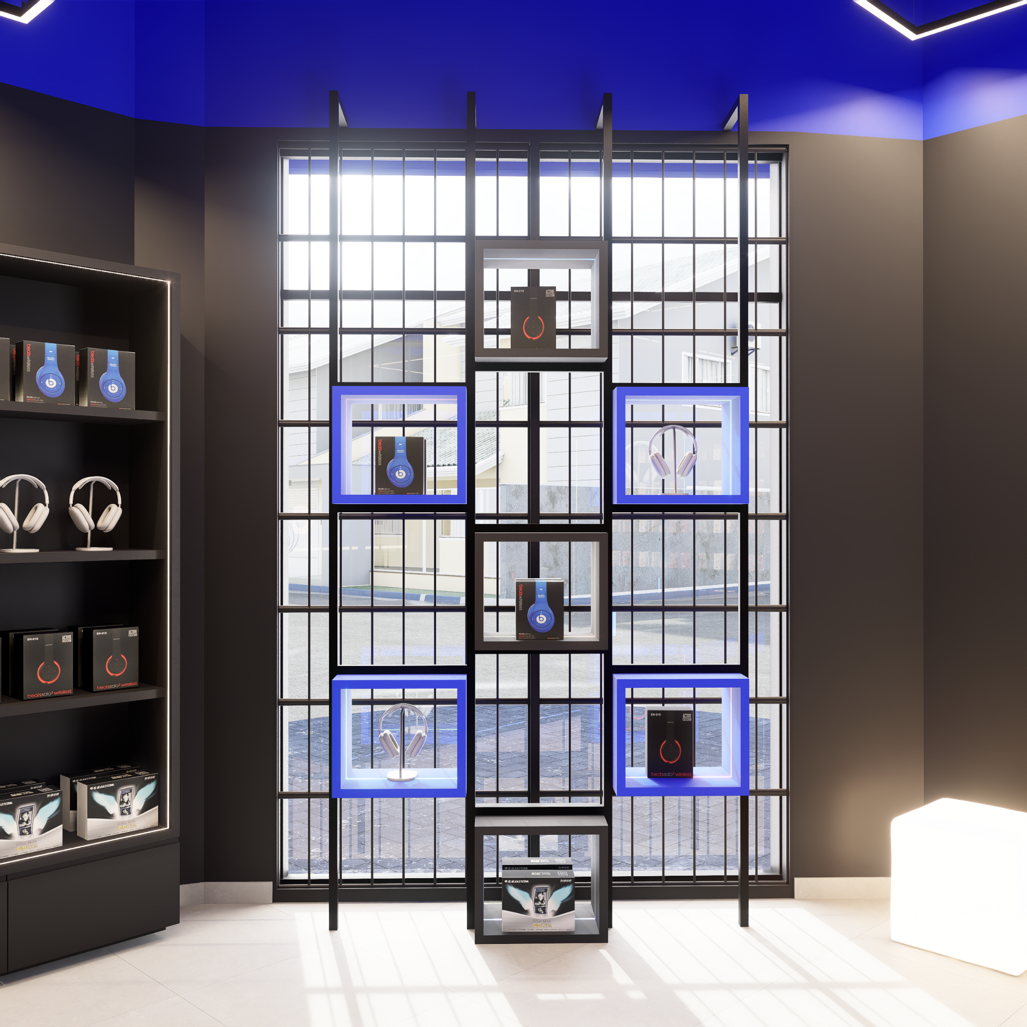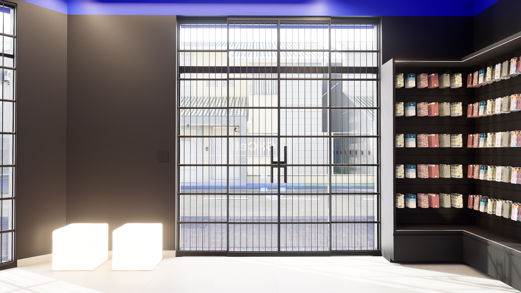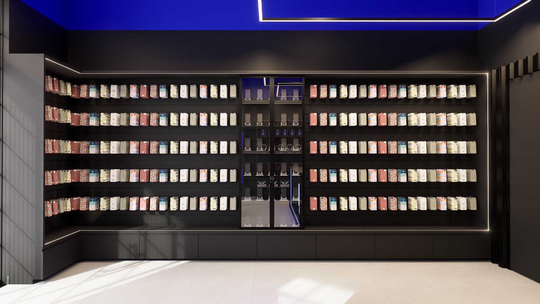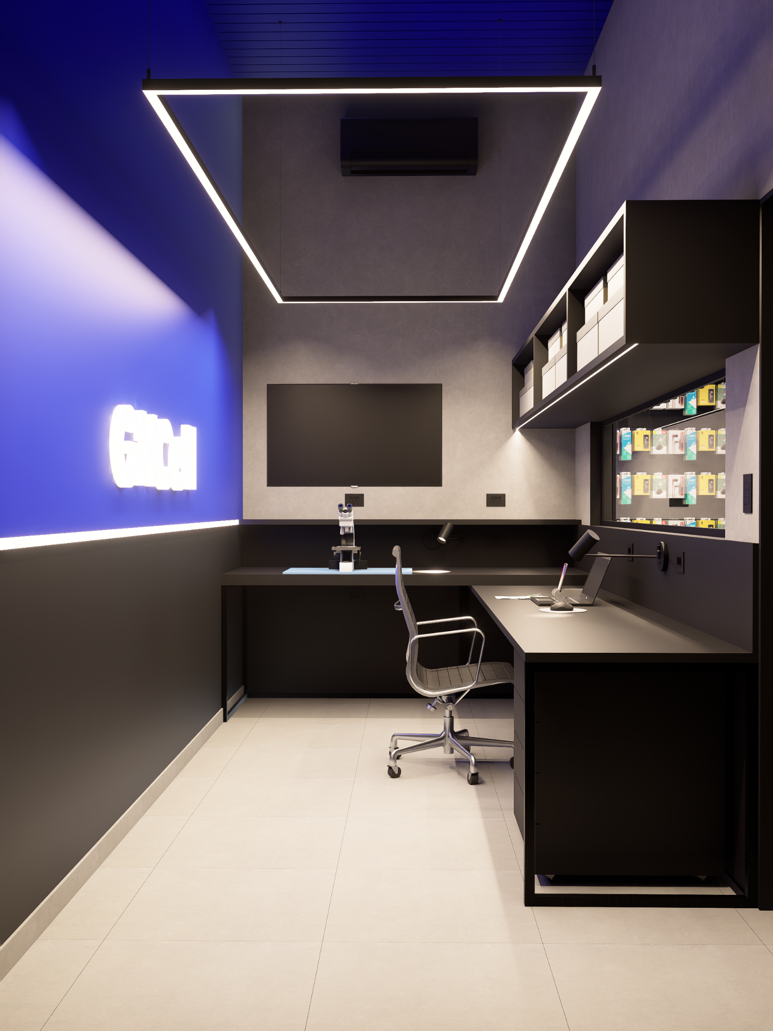 Com uma área de 50 m², o layout foi cuidadosamente planejado para otimizar a circulação, valorizar os produtos e criar uma relação direta entre cliente e exposição. A paleta de cores parte dos tons de azul e preto presentes na identidade visual da GHCELL, reforçando o reconhecimento da marca e transmitindo modernidade e credibilidade.