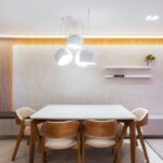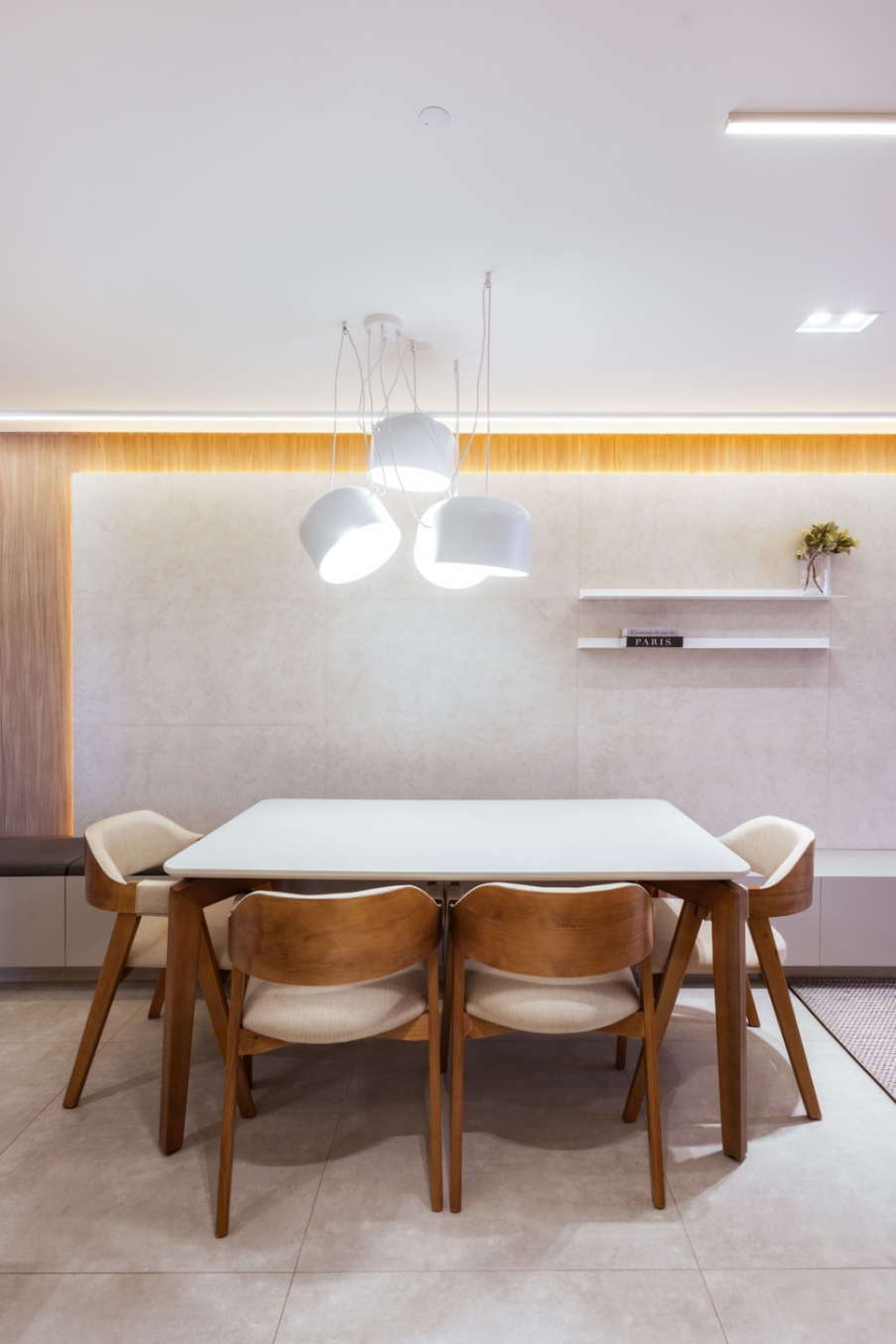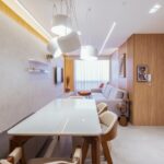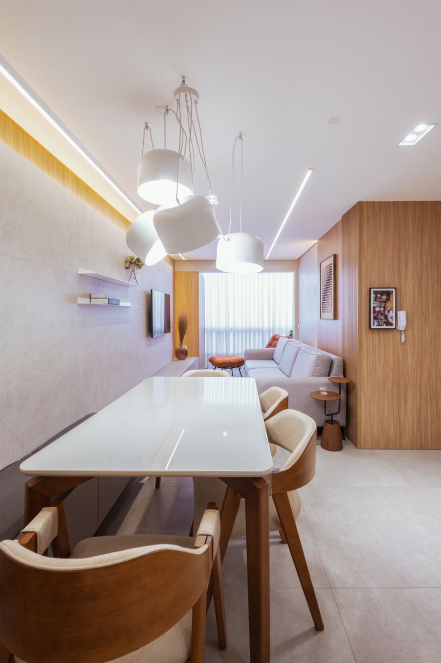 Na área social, o painel de revestimento se destaca ao emoldurar a mesa de jantar e o aparador. Este, de forma inteligente e elegante, guarda uma sapateira discreta, revelando o cuidado com cada detalhe.