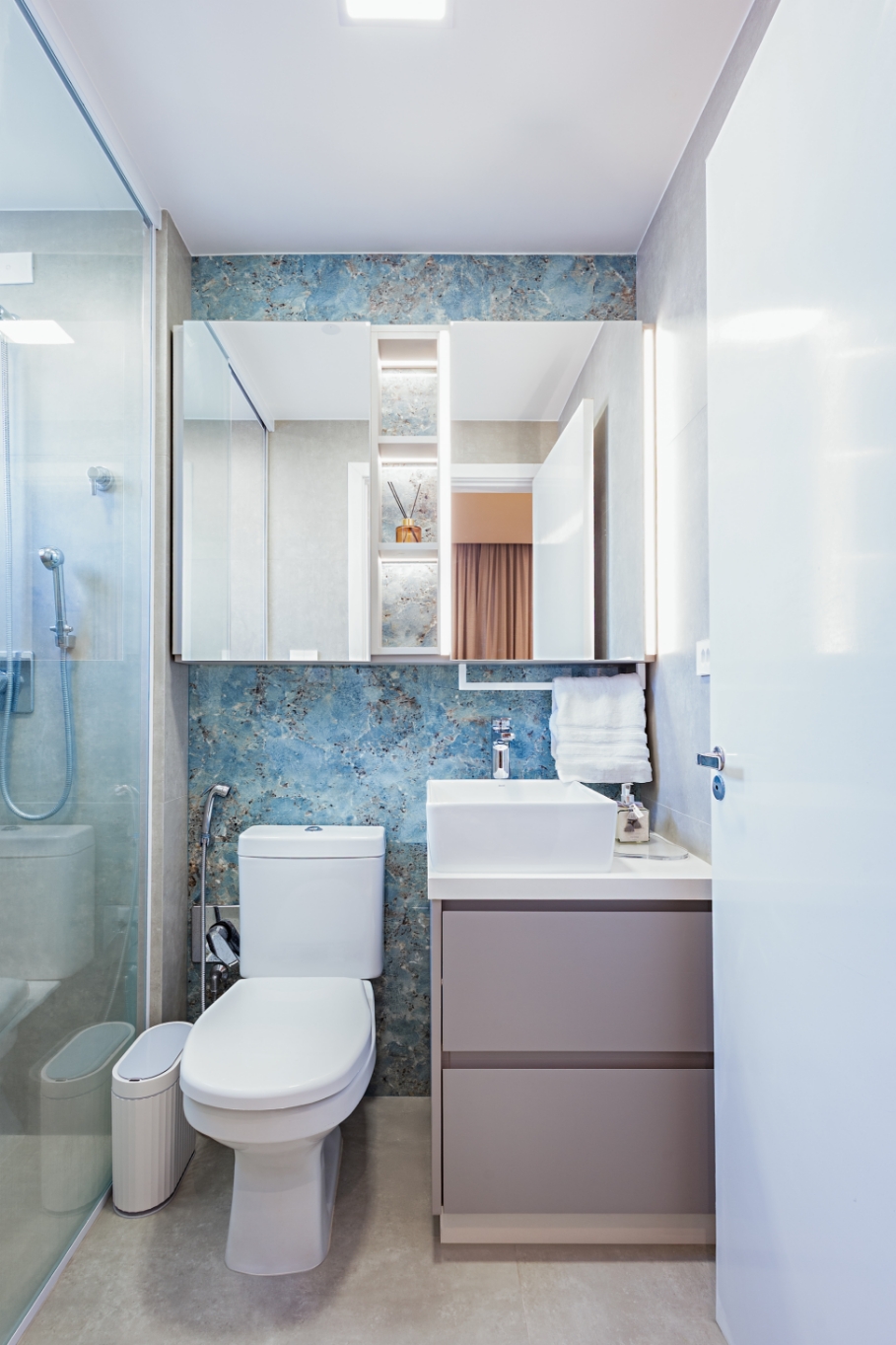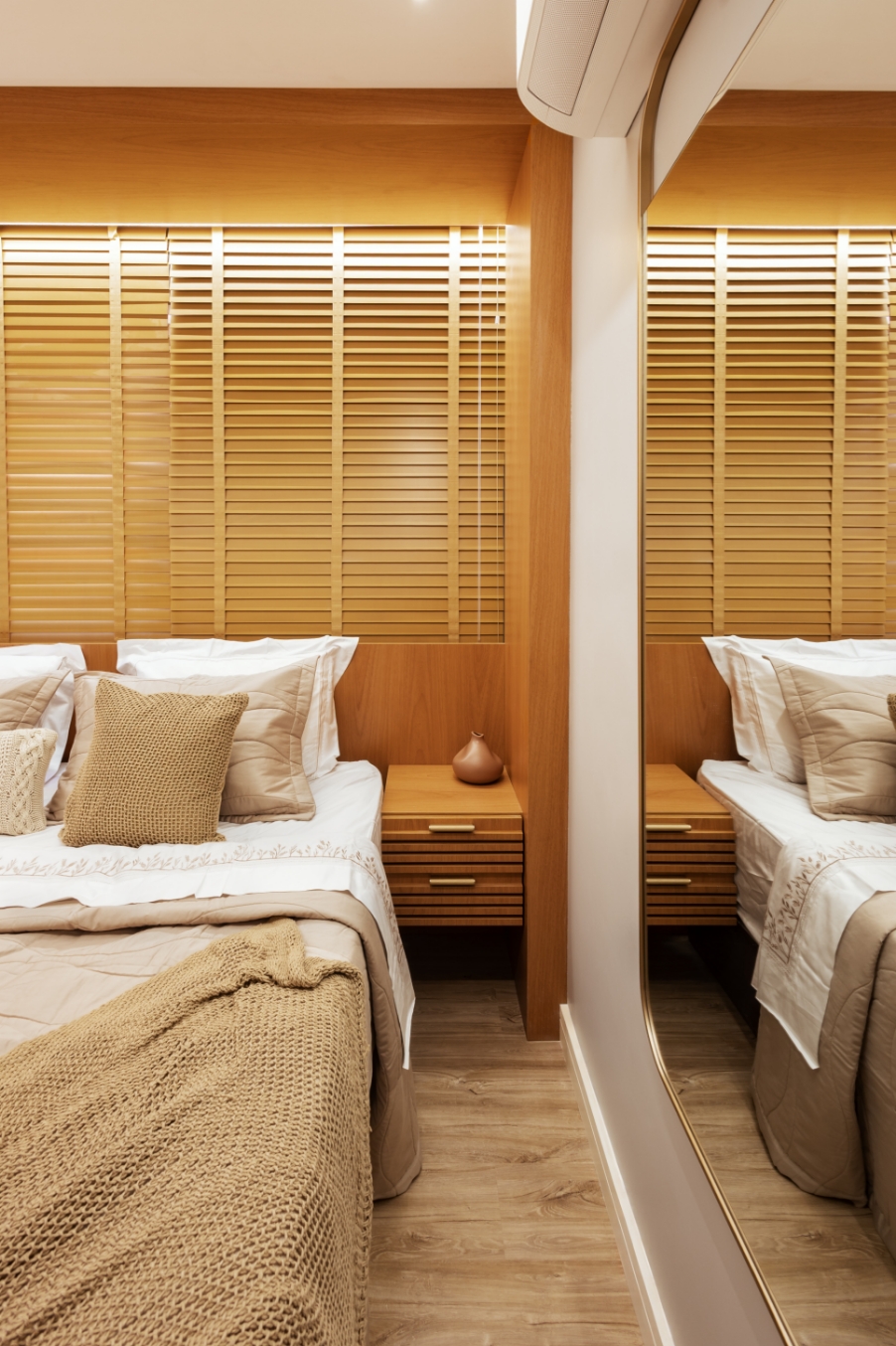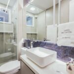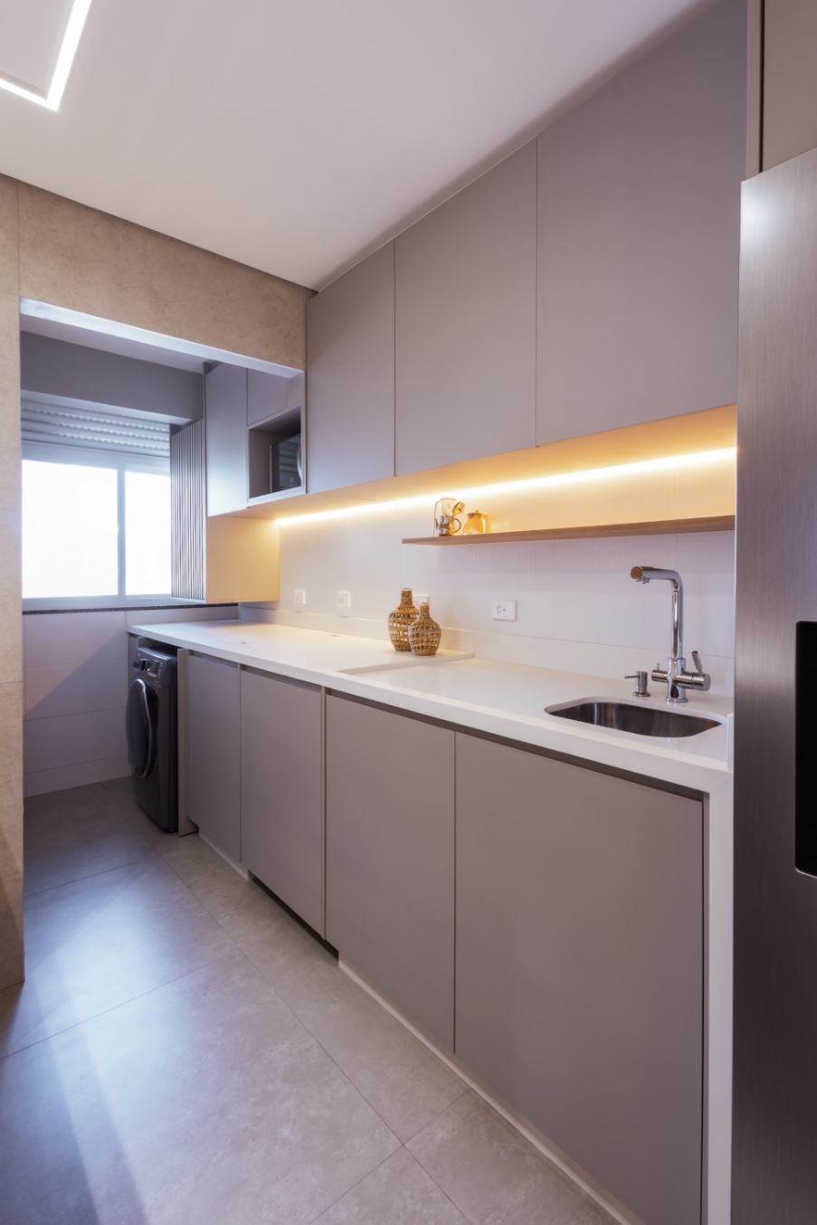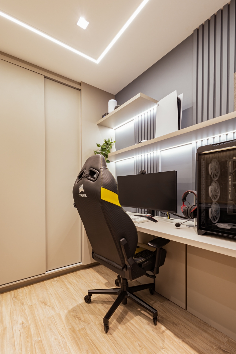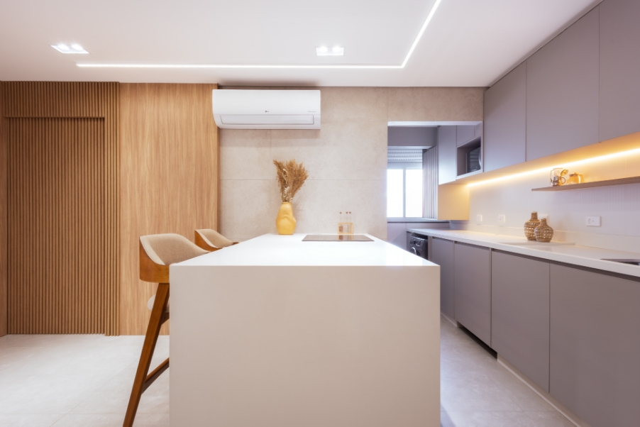 A tecnologia também se faz presente em todos os ambientes: iluminação, cortinas e persianas foram totalmente automatizadas com Alexa, permitindo que, com apenas um comando de voz, o lar se adapte às necessidades e ao ritmo do casal.