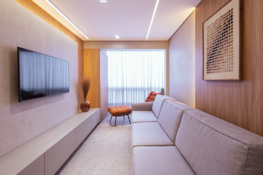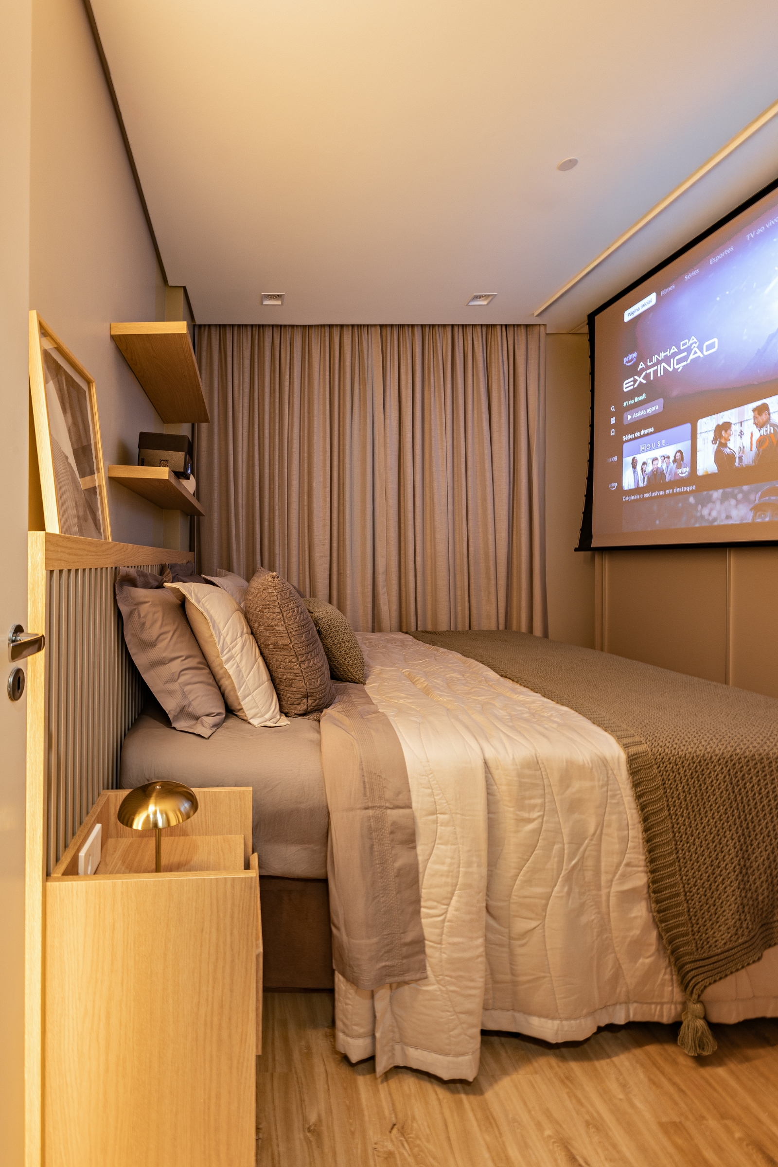 O apartamento “Projetta” recebe esse nome que reflete um pedido especial dos moradores: a presença de dois projetores, um no escritório e outro na suíte, que traduzem a personalidade e o estilo de vida do casal.