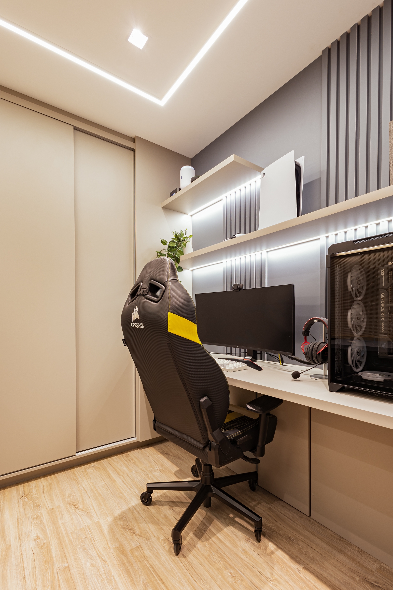 Como a rotina é marcada pelo trabalho em home office, o escritório foi pensado com duas bancadas – uma para ela e outra para ele – que unem funcionalidade e personalidade em um espaço otimizado e inspirador.