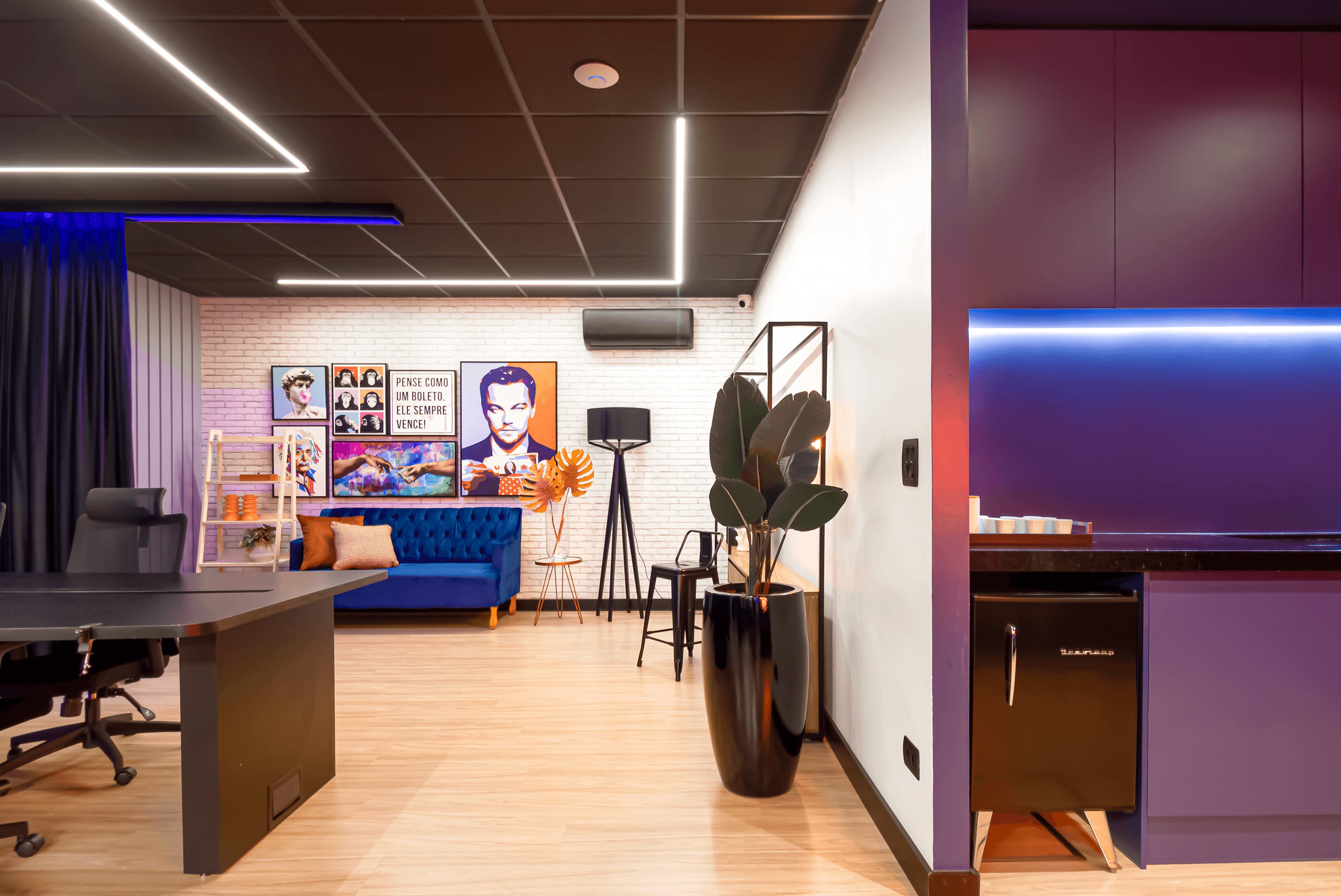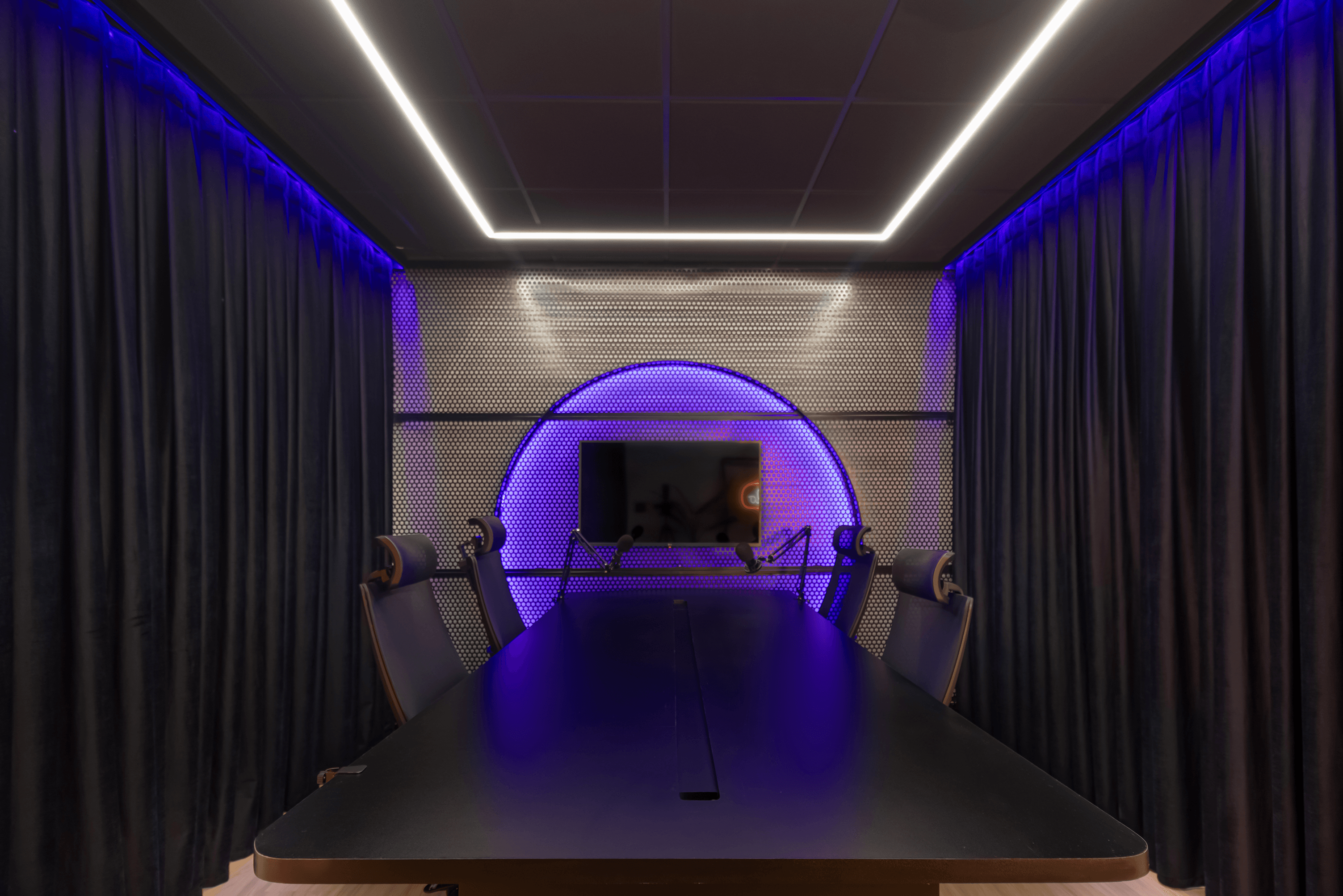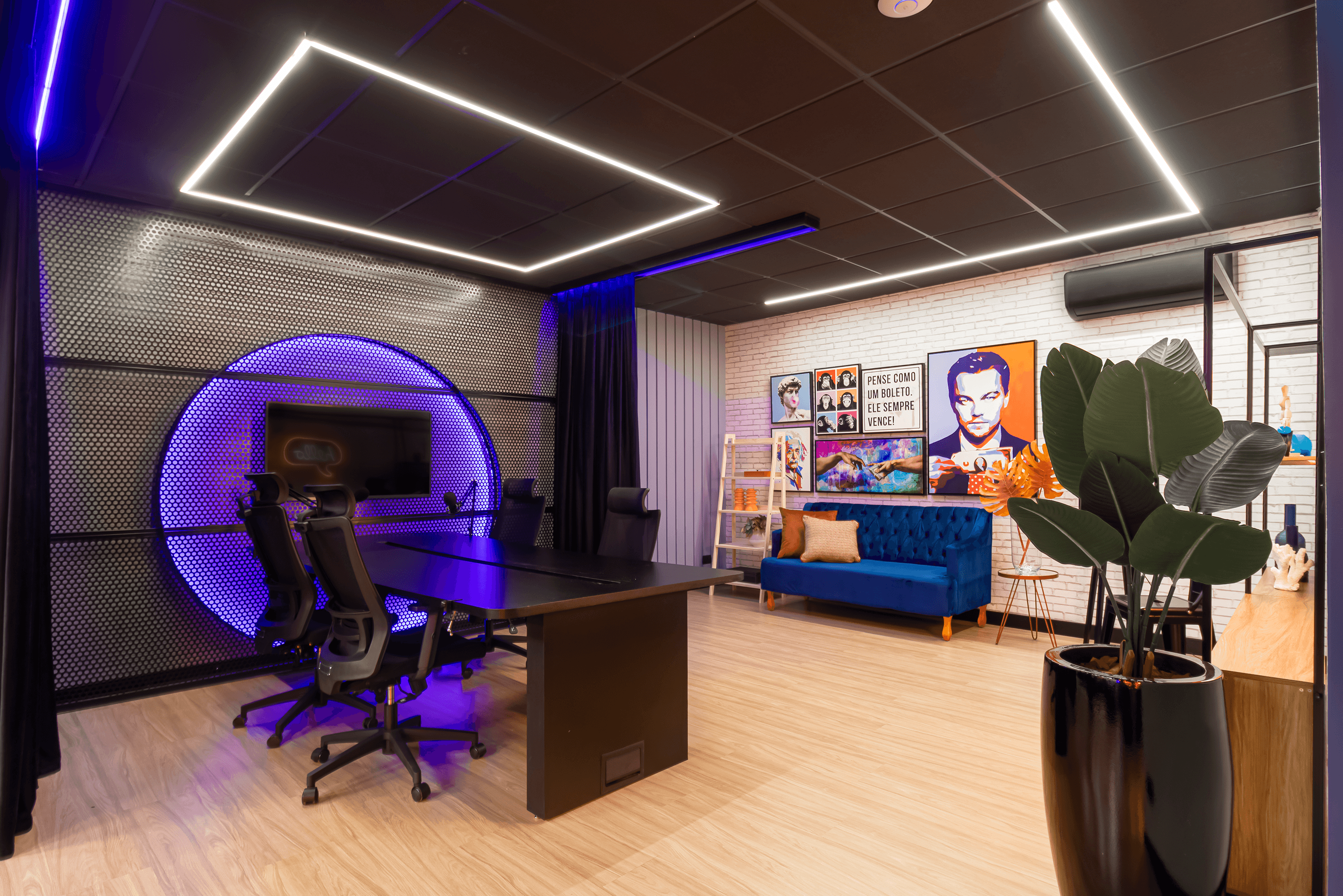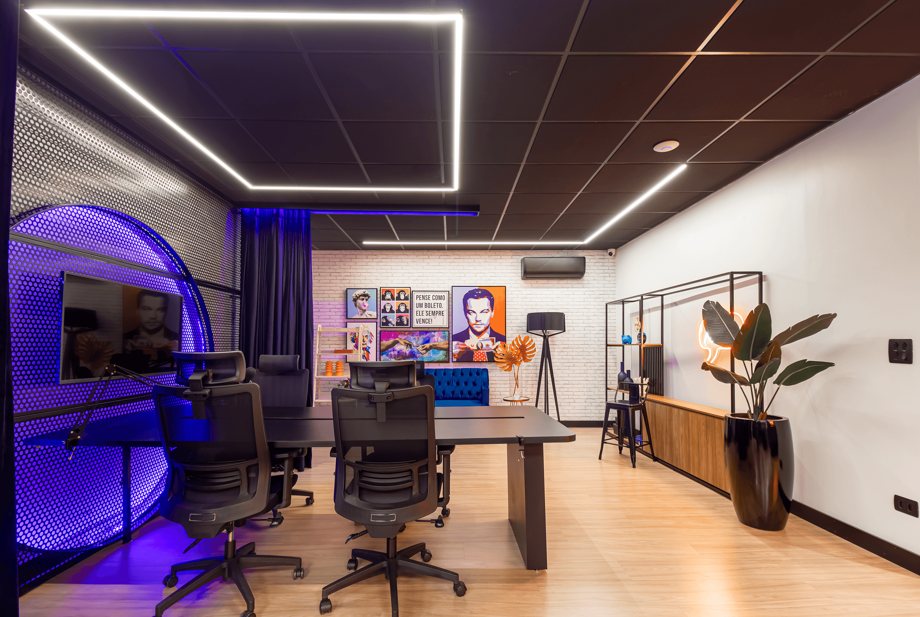 Um pedido especial dos proprietários da empresa foi a criação de um espaço exclusivo para gravações de conteúdos relacionados à empresa, com destaque para a área de Podcasts que receberá diversos convidados para entrevistas. Nessa área também, foram inseridos mais dois cenários que serão utilizados para o Youtube e um Chromakey retrátil, para gravar outros vídeos da equipe. O resultado é um ambiente moderno e jovem, com muitas iluminações neon em diferentes cores e móveis em tons de preto, laranja e azul que remetem à identidade visual da empresa.