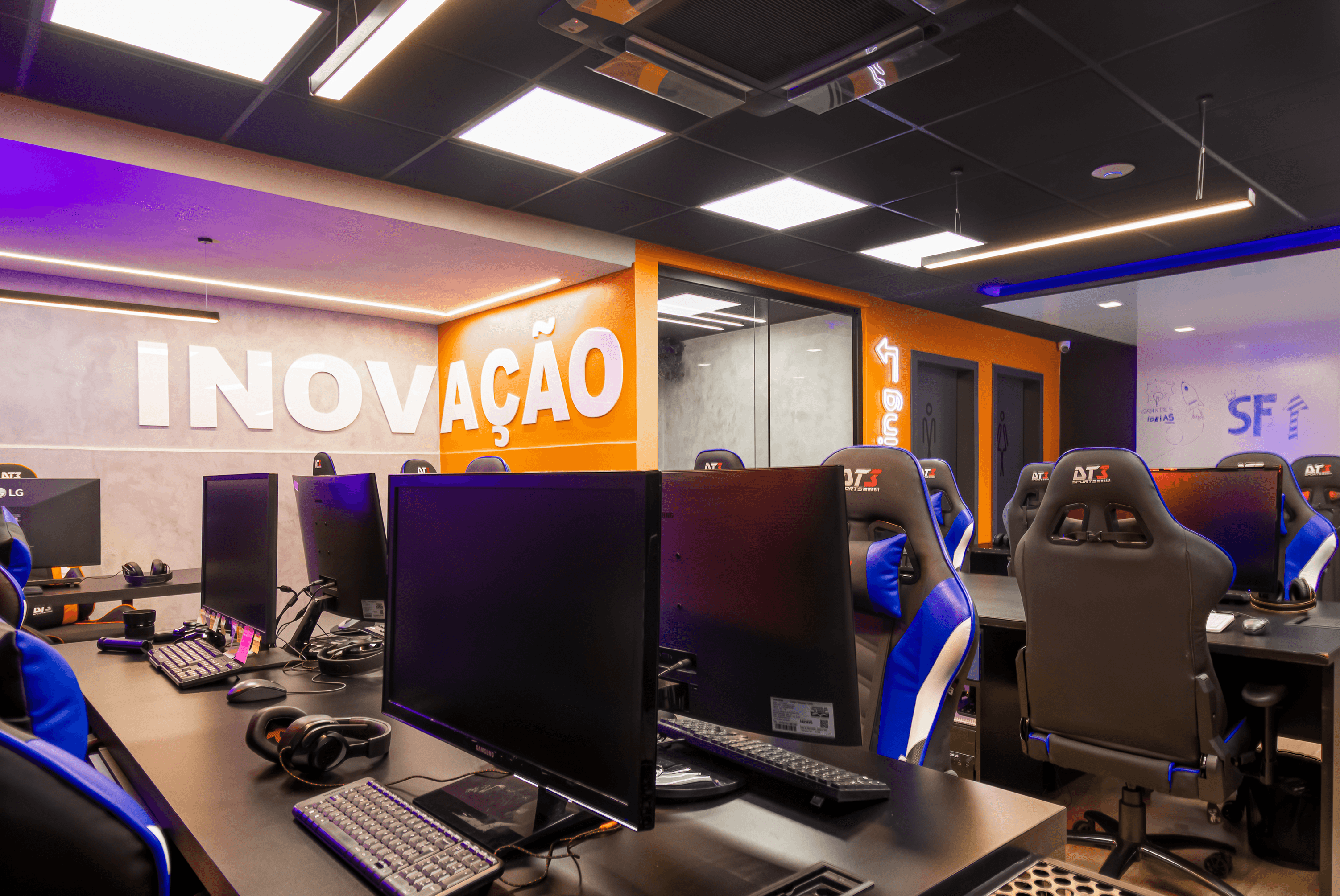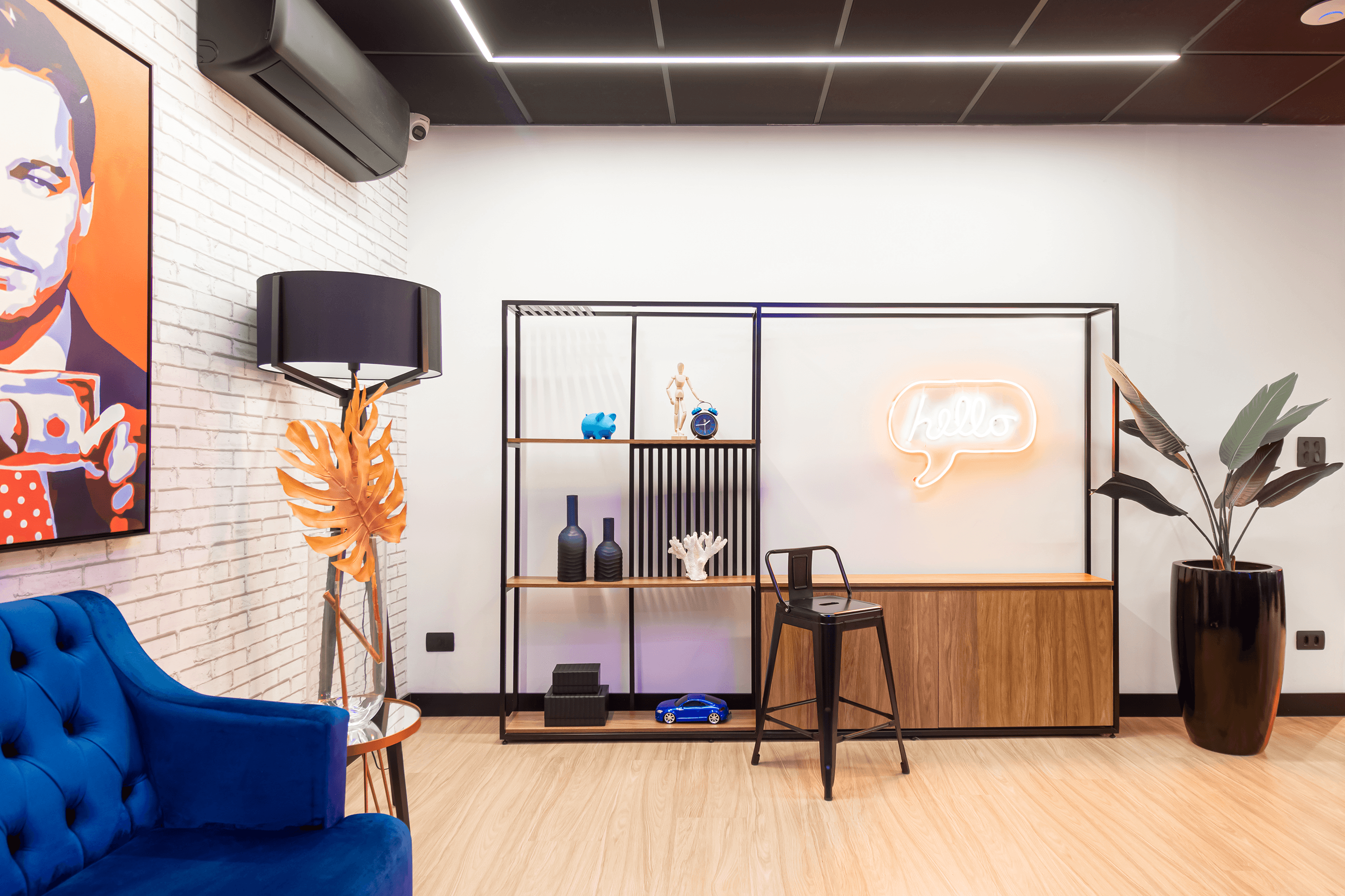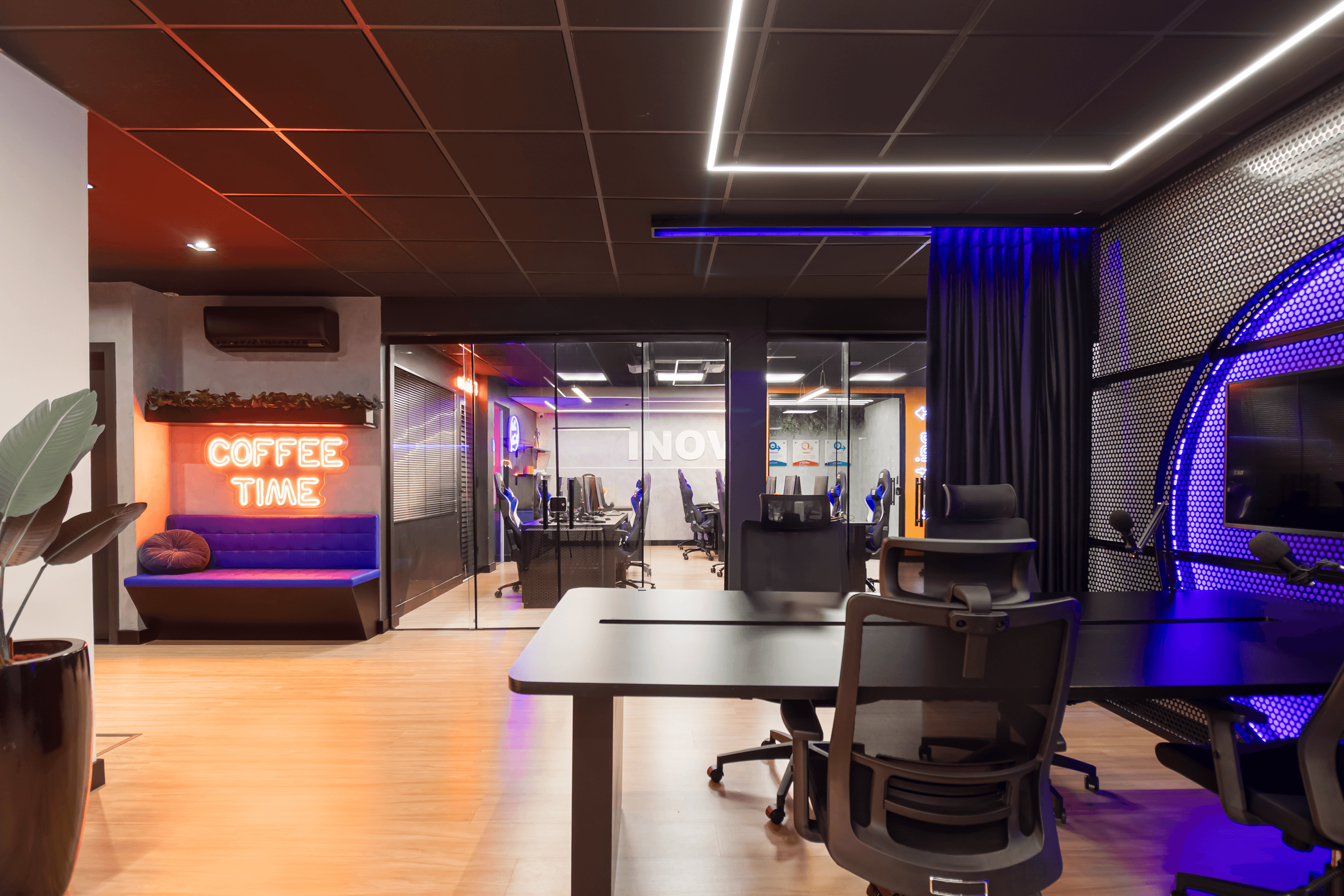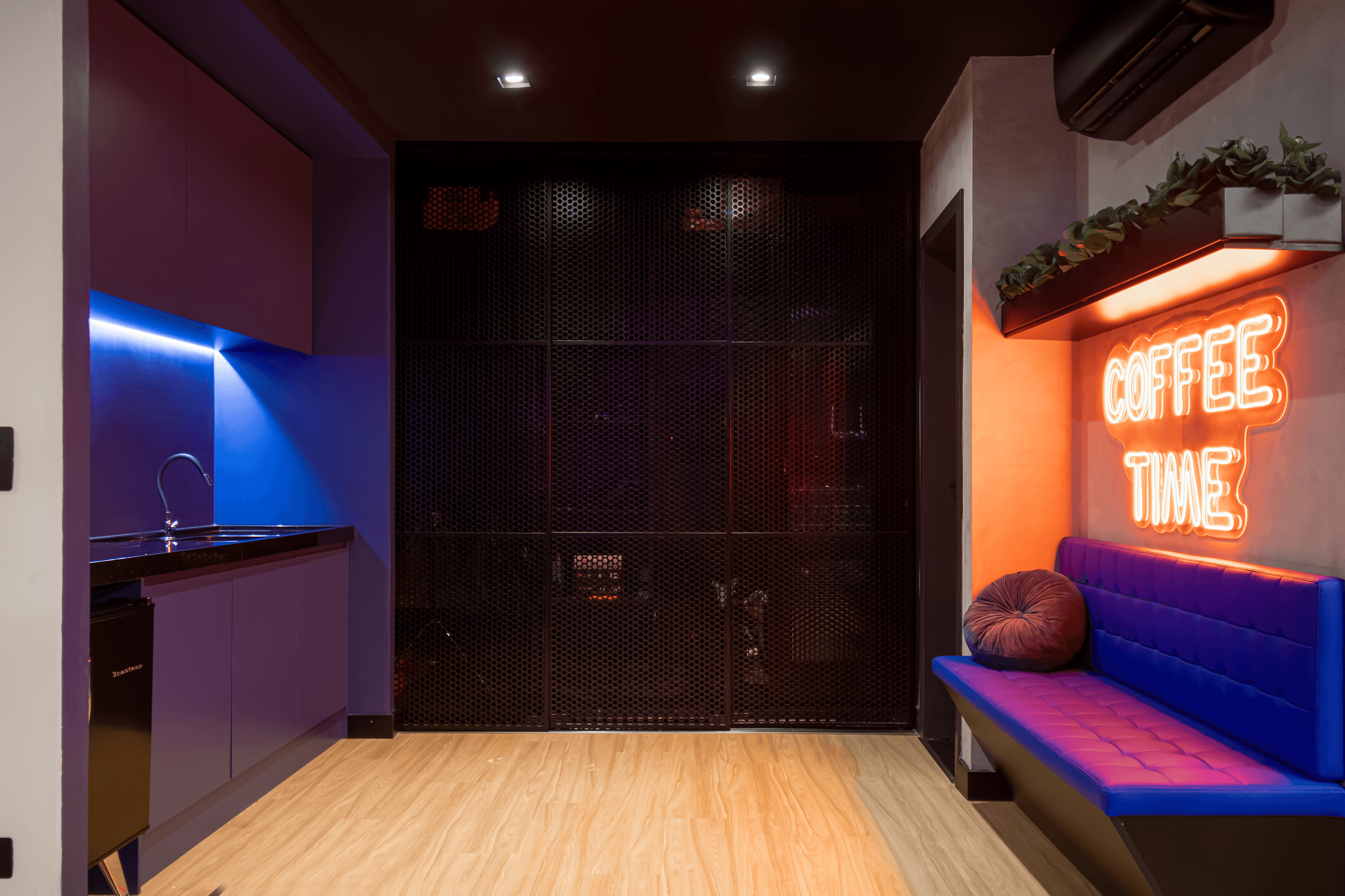 Um pedido especial dos proprietários da empresa foi a criação de um espaço exclusivo para gravações de conteúdos relacionados à empresa, com destaque para a área de Podcasts que receberá diversos convidados para entrevistas. Nessa área também, foram inseridos mais dois cenários que serão utilizados para o Youtube e um Chromakey retrátil, para gravar outros vídeos da equipe. O resultado é um ambiente moderno e jovem, com muitas iluminações neon em diferentes cores e móveis em tons de preto, laranja e azul que remetem à identidade visual da empresa.