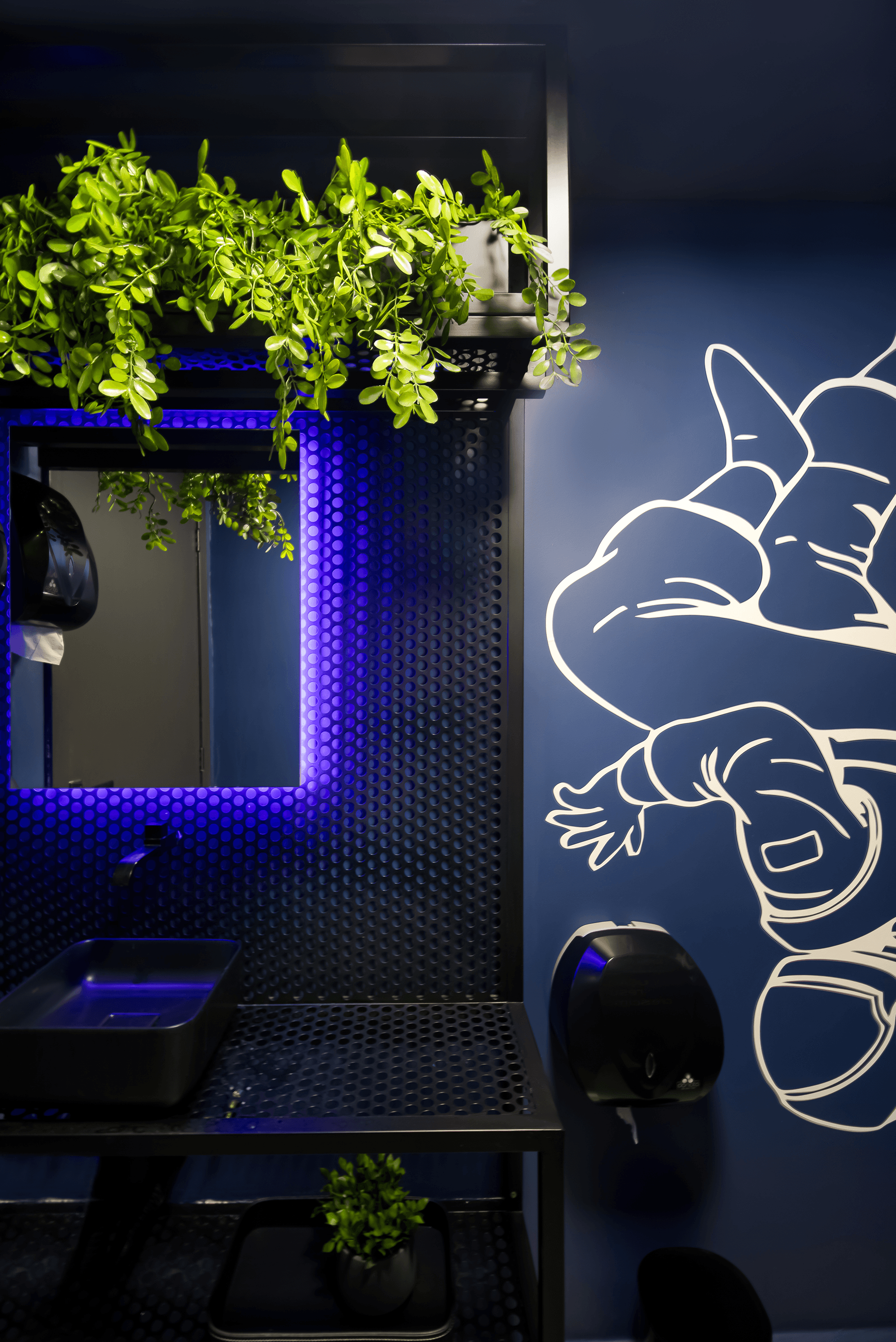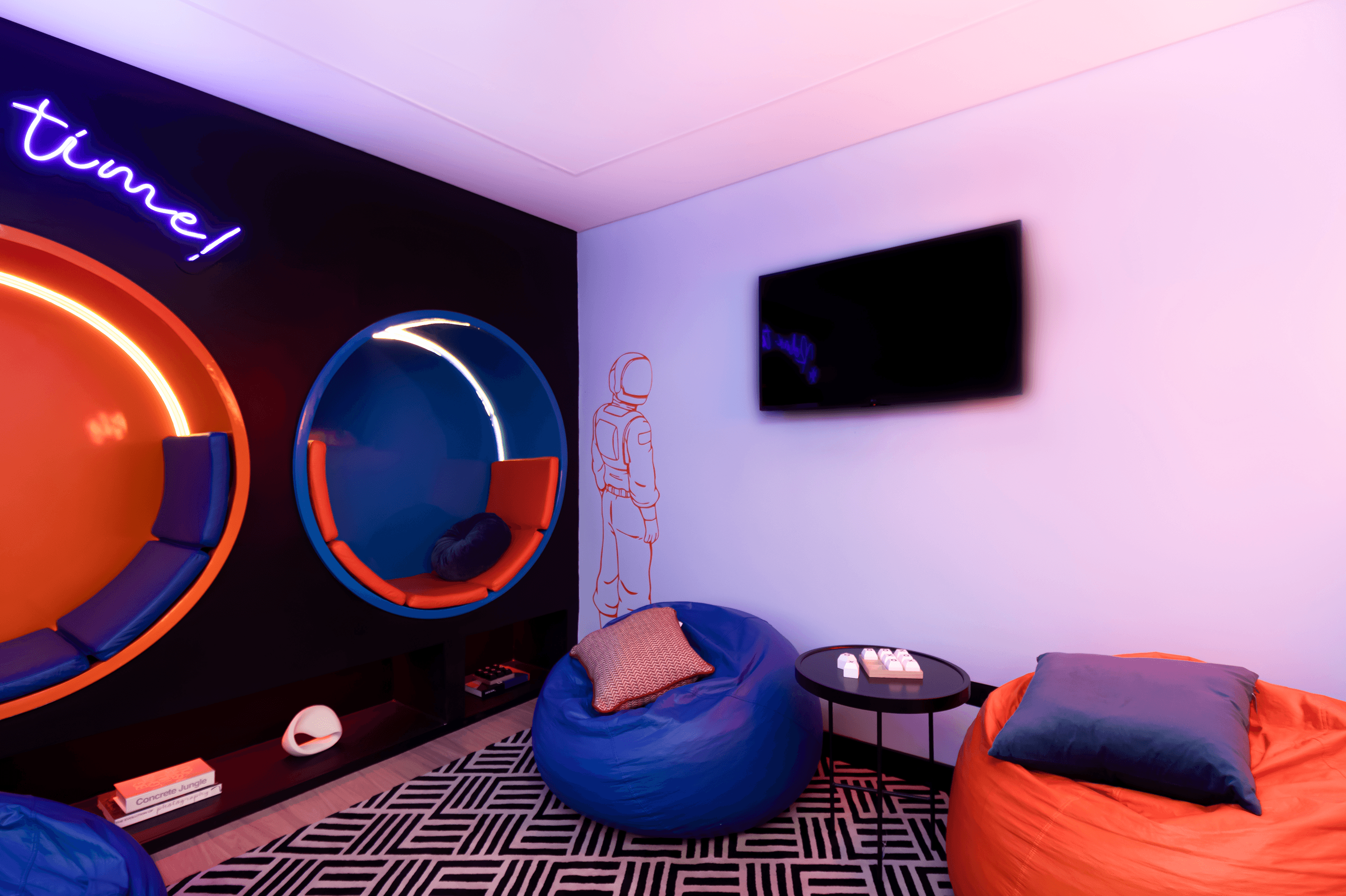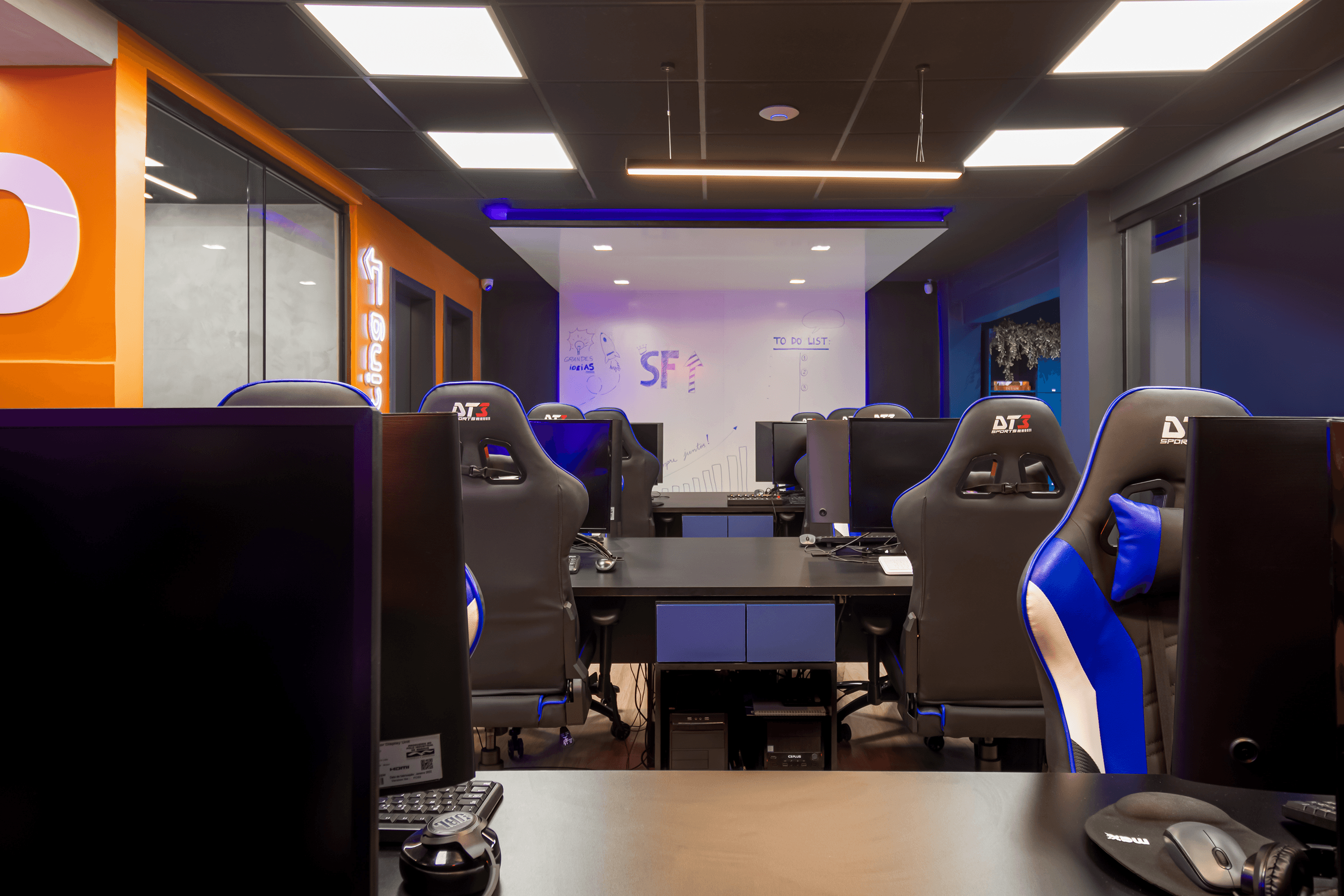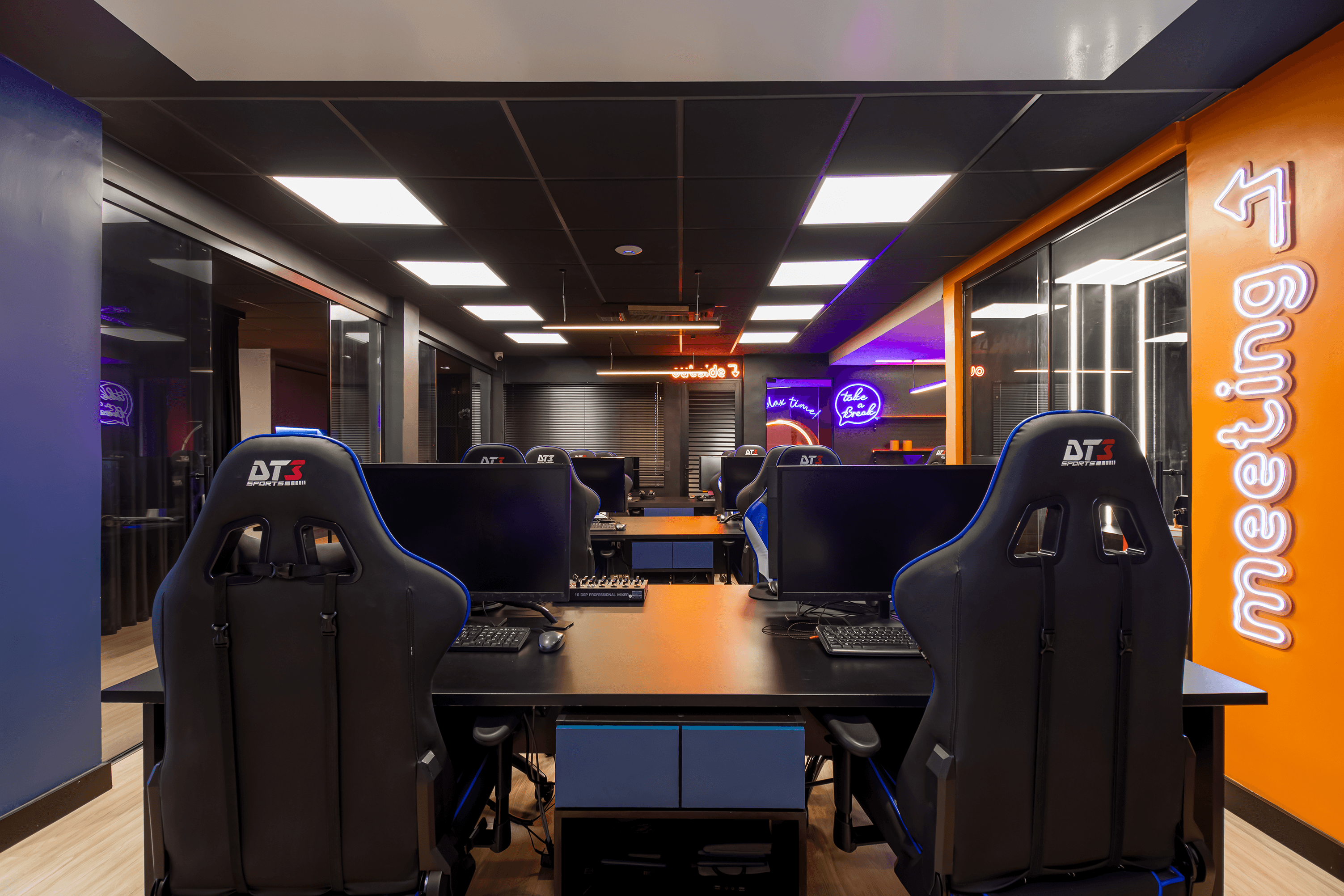 Um pedido especial dos proprietários da empresa foi a criação de um espaço exclusivo para gravações de conteúdos relacionados à empresa, com destaque para a área de Podcasts que receberá diversos convidados para entrevistas. Nessa área também, foram inseridos mais dois cenários que serão utilizados para o Youtube e um Chromakey retrátil, para gravar outros vídeos da equipe. O resultado é um ambiente moderno e jovem, com muitas iluminações neon em diferentes cores e móveis em tons de preto, laranja e azul que remetem à identidade visual da empresa.